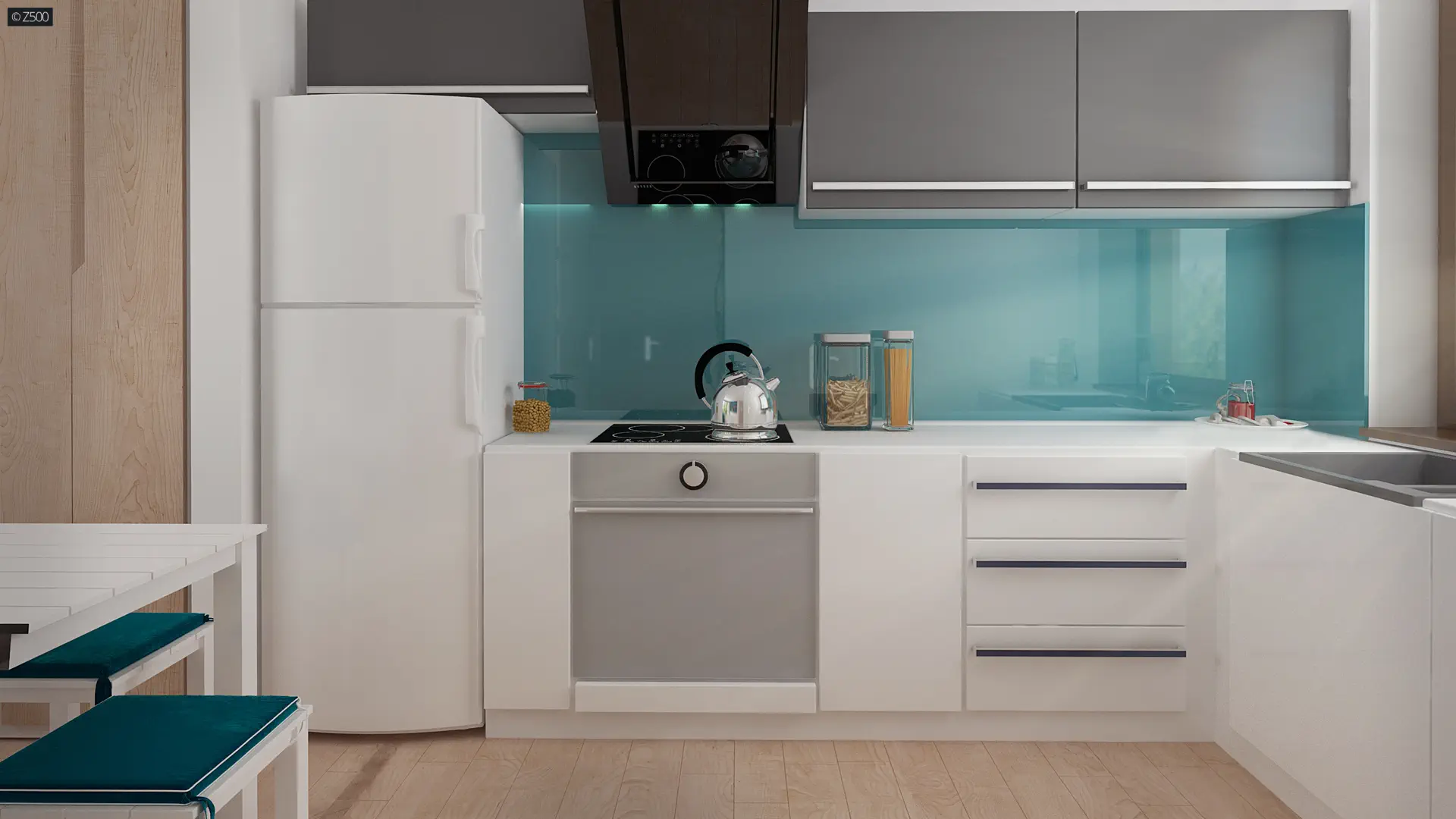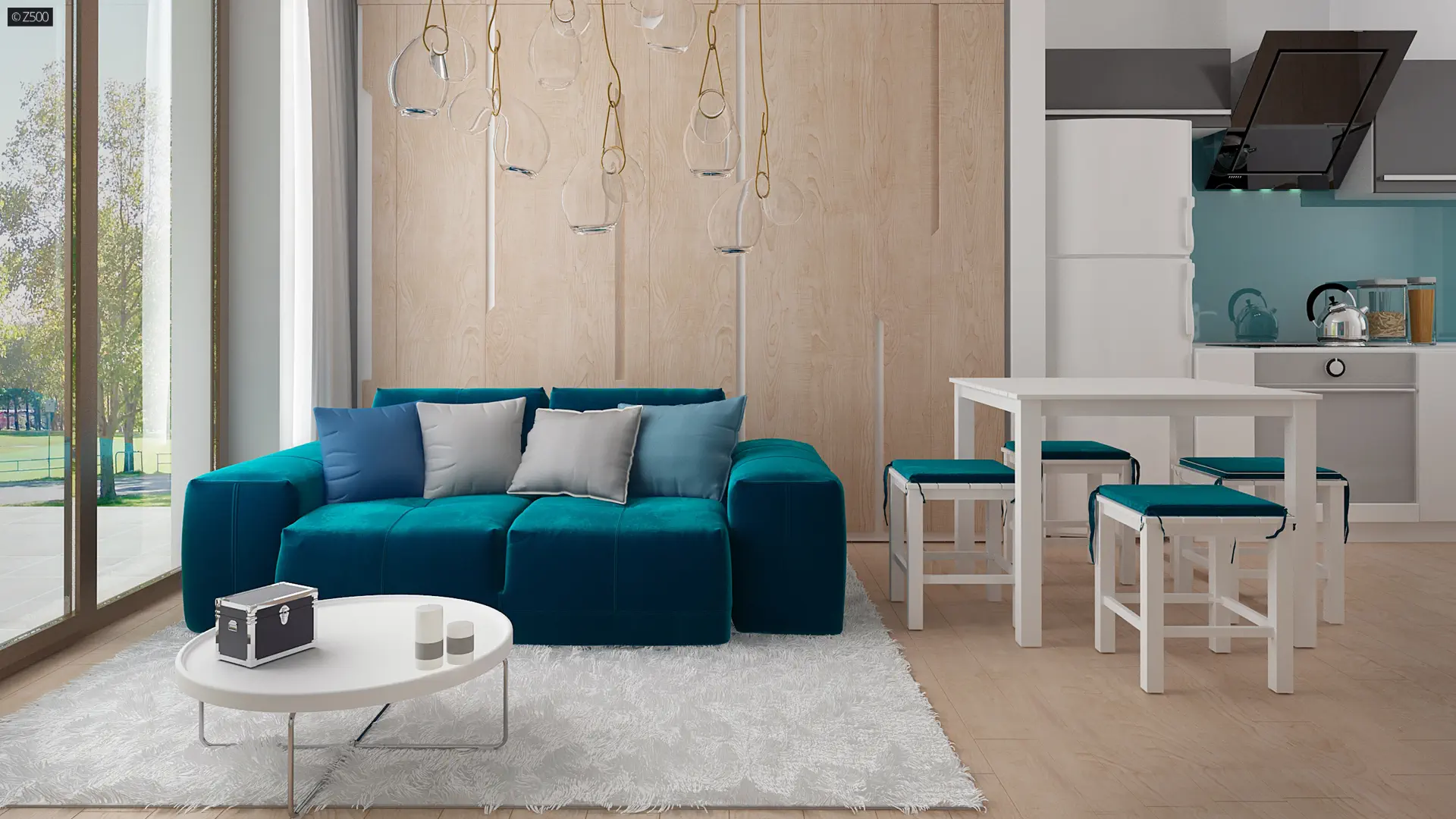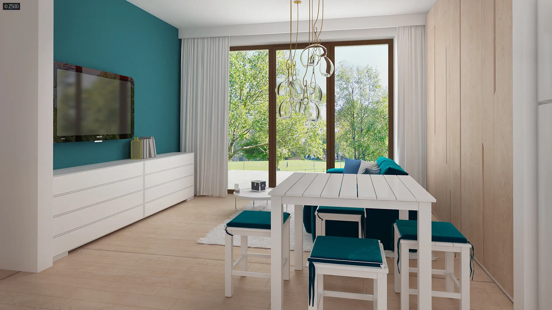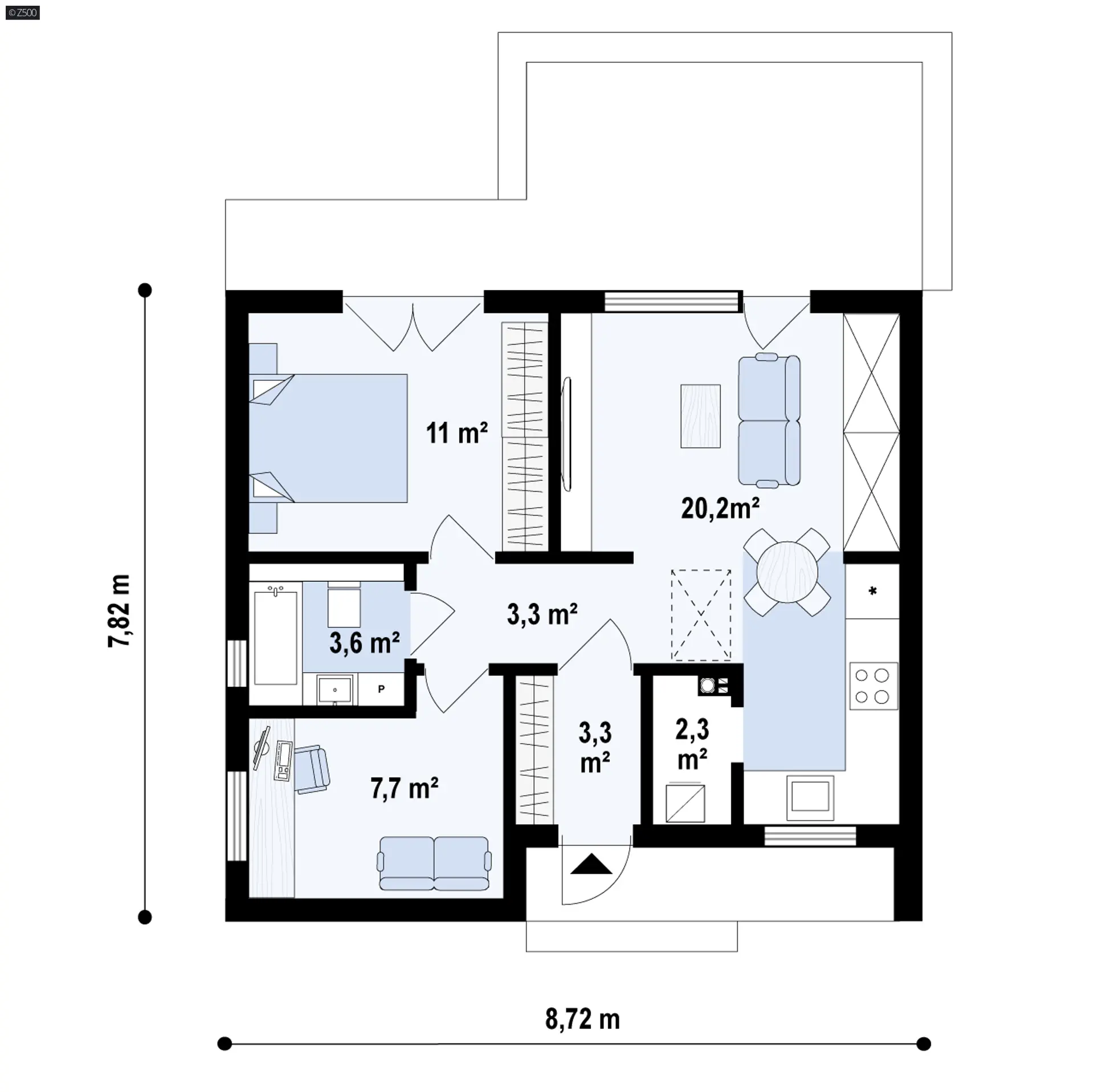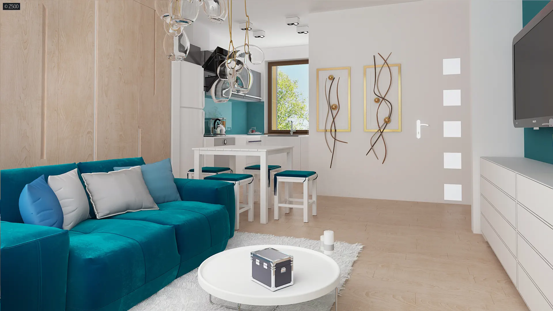 Na powierzchni ok. 50m2 zaprojektowano otwartą część dzienną, sypialnię z wyjściem na taras, niewielką łazienkę oraz gabinet, który może pełnić rolę pokoju gościnnego lub garderoby.