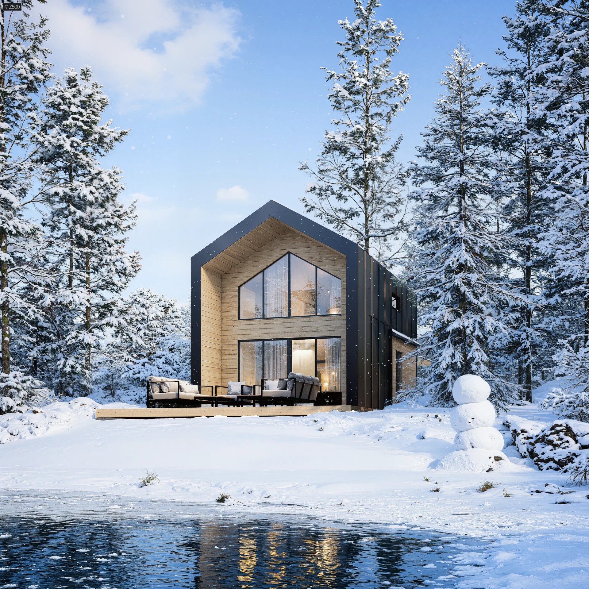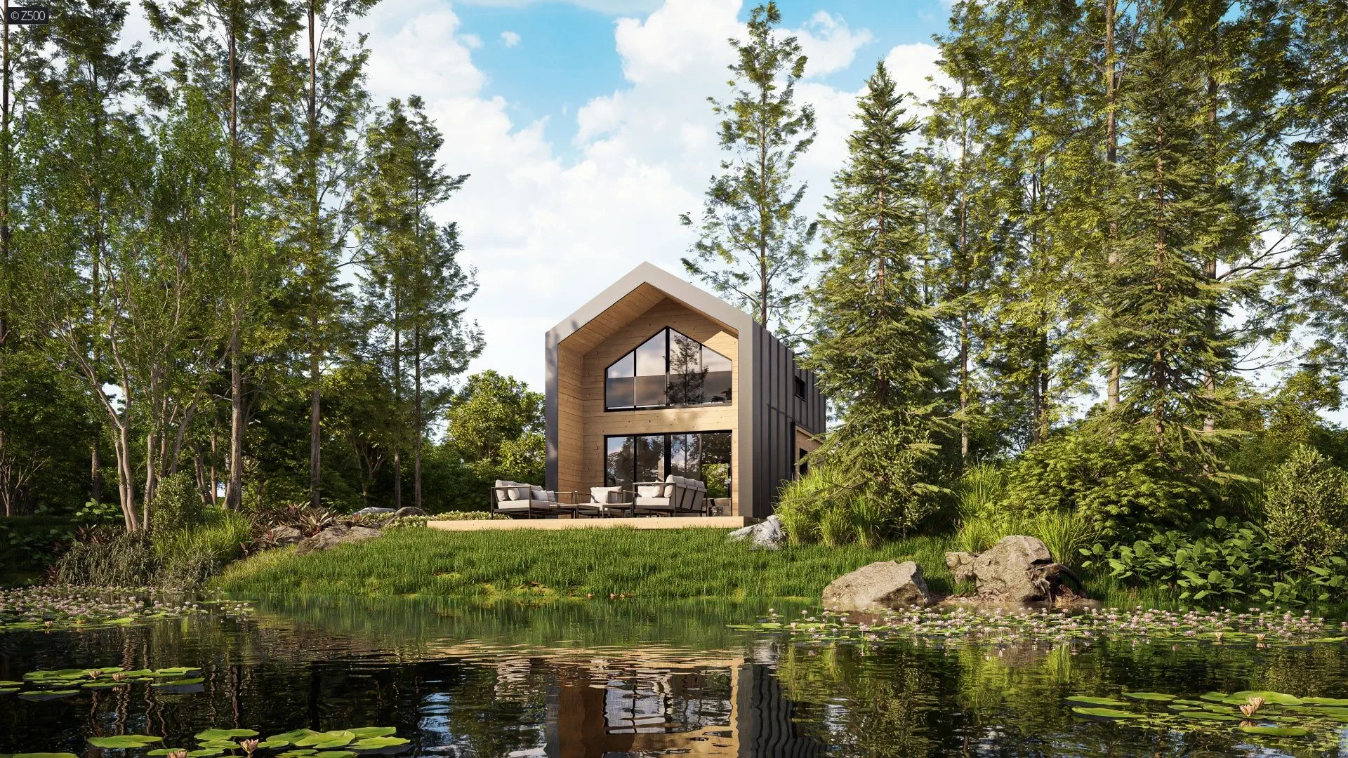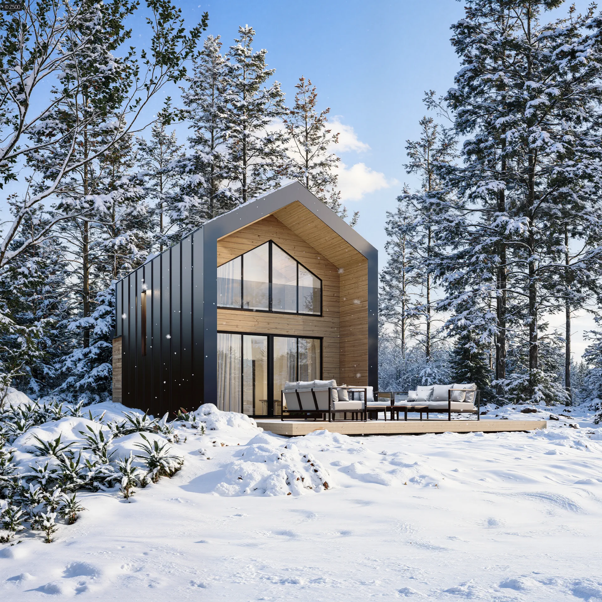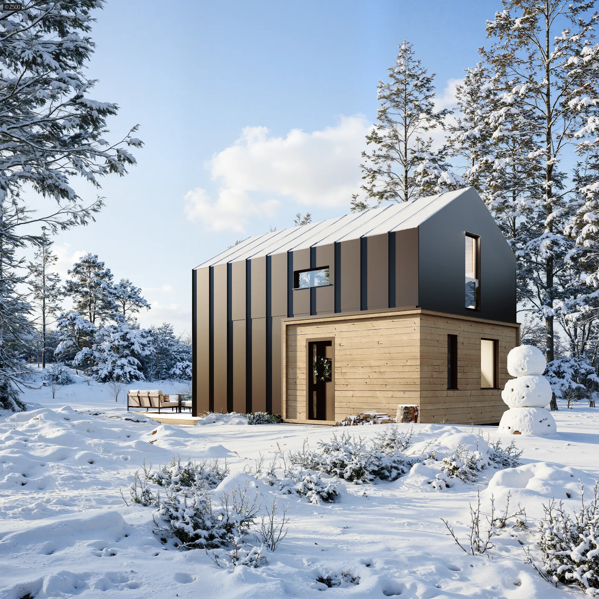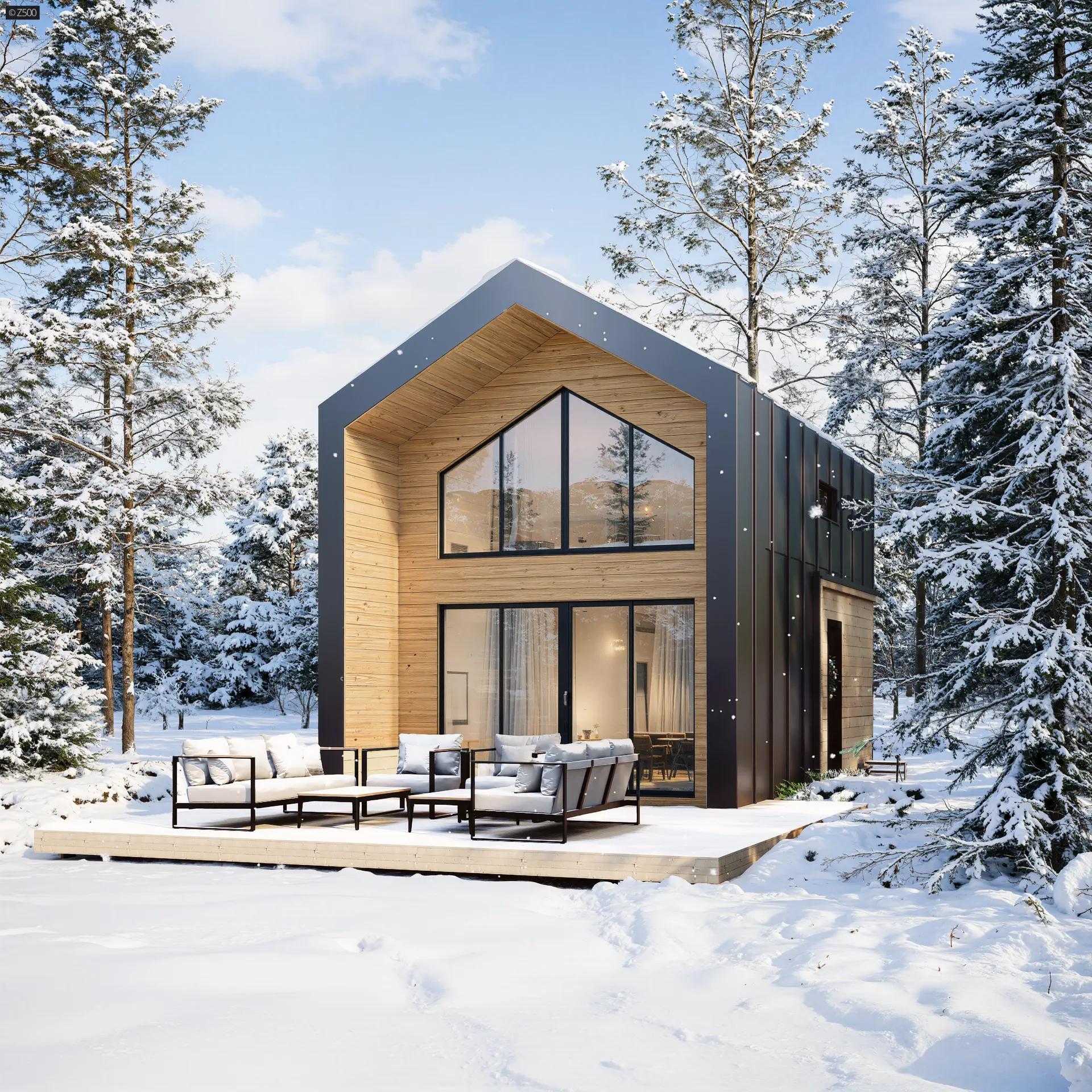 Mały dom z poddaszem w stylu nowoczesna stodoła z dużym przeszkleniem i tarasem