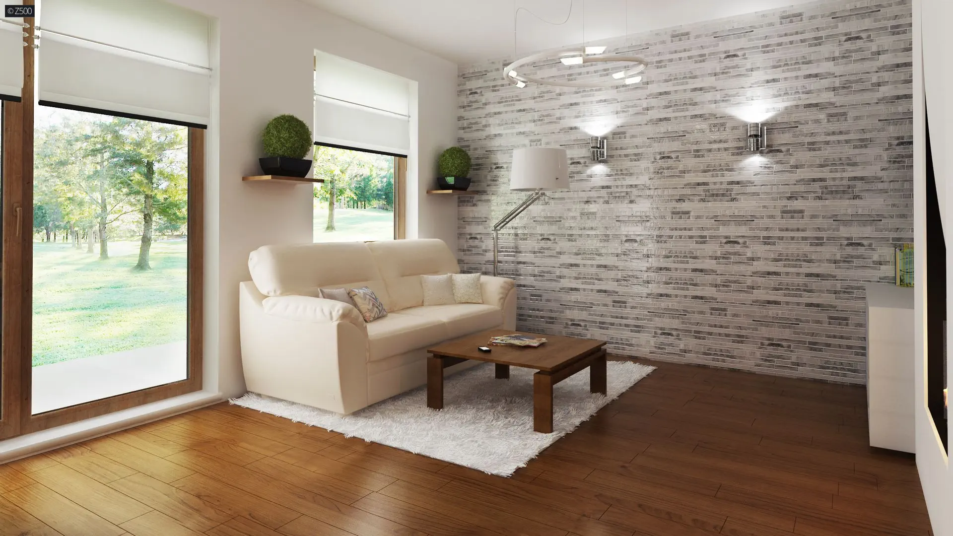 Projekt charakteryzuje bardzo praktycznym i funkcjonalnym rozmieszczeniem pomieszczeń. Przez zadaszone wejście wchodzi się do sieni, w której przewidziano miejsce na szafę wnękową. Centralnie zlokalizowany hol łączy się bezpośrednio z przestronnym, widnym pokojem dziennym. Salon połączony z kuchnią nadaje wnętrzu przestronności. W pokoju dziennym zaprojektowany został kominek, który w zimowe wieczory pozwoli wypocząć w zaciszu domowego ciepła. Bogate przeszklenia we wszystkich pomieszczeniach, naturalnie doświetlają wnętrze.