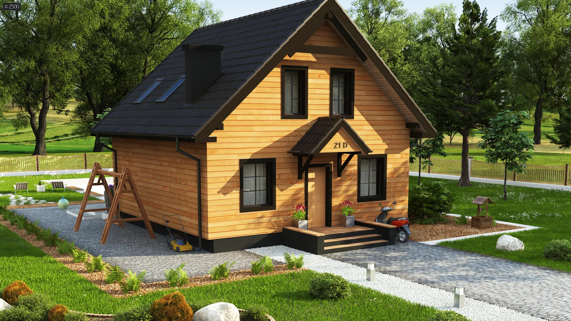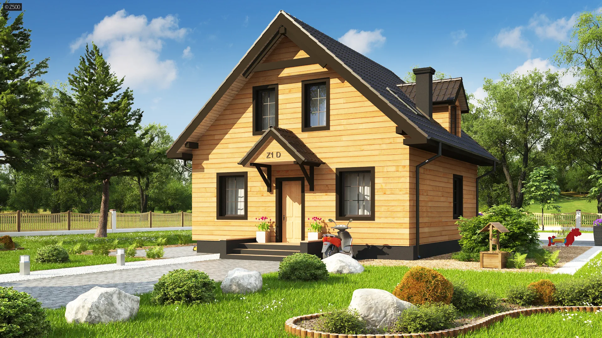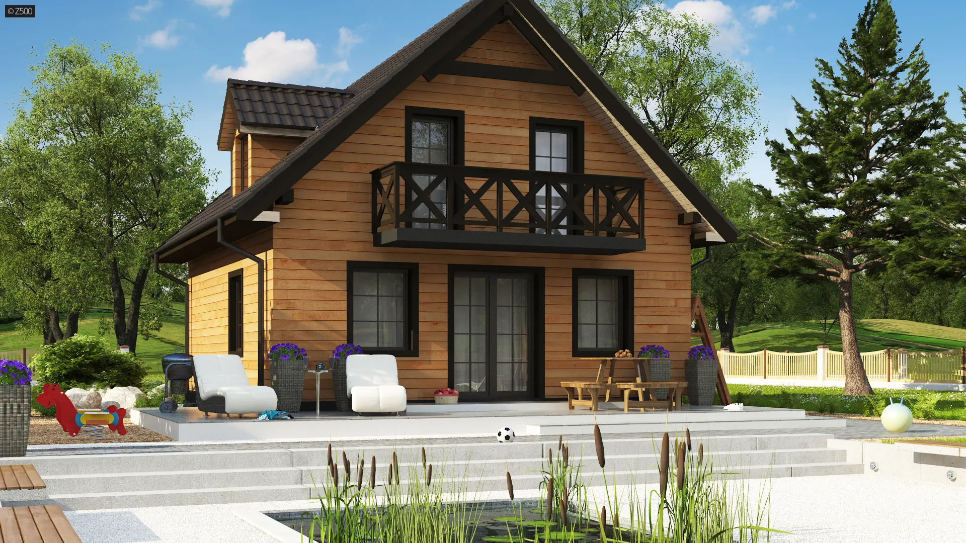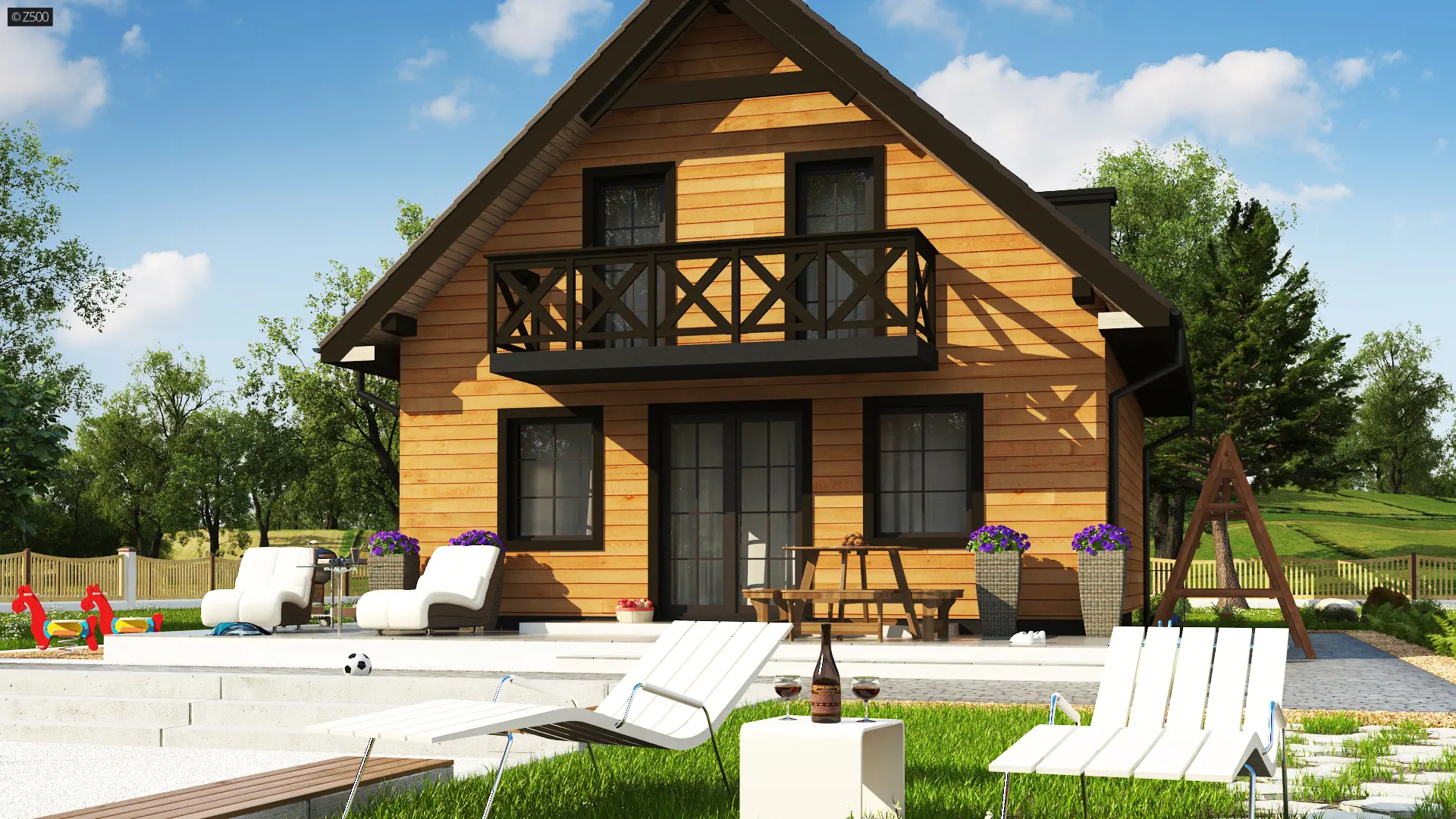 Drewniany dom z dwuspadowym dachem i balkonem, szybki i ekonomiczny w budowie
