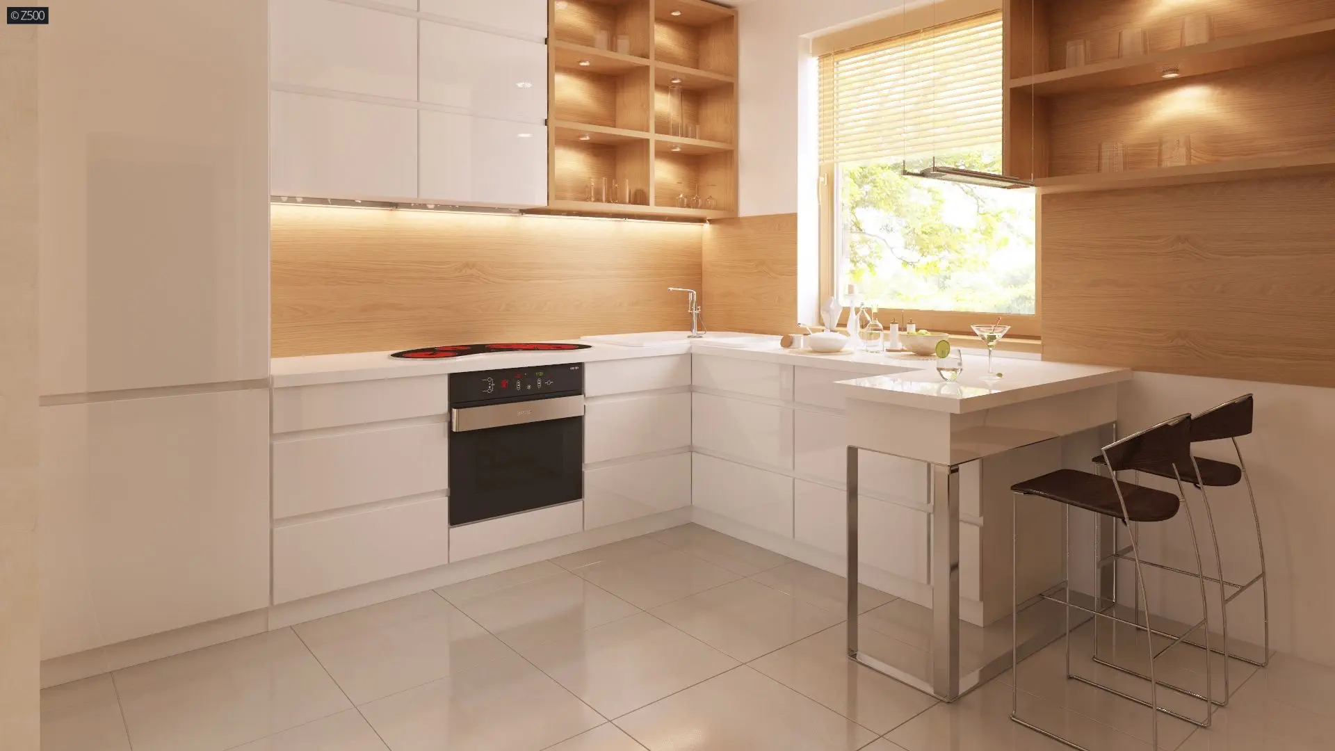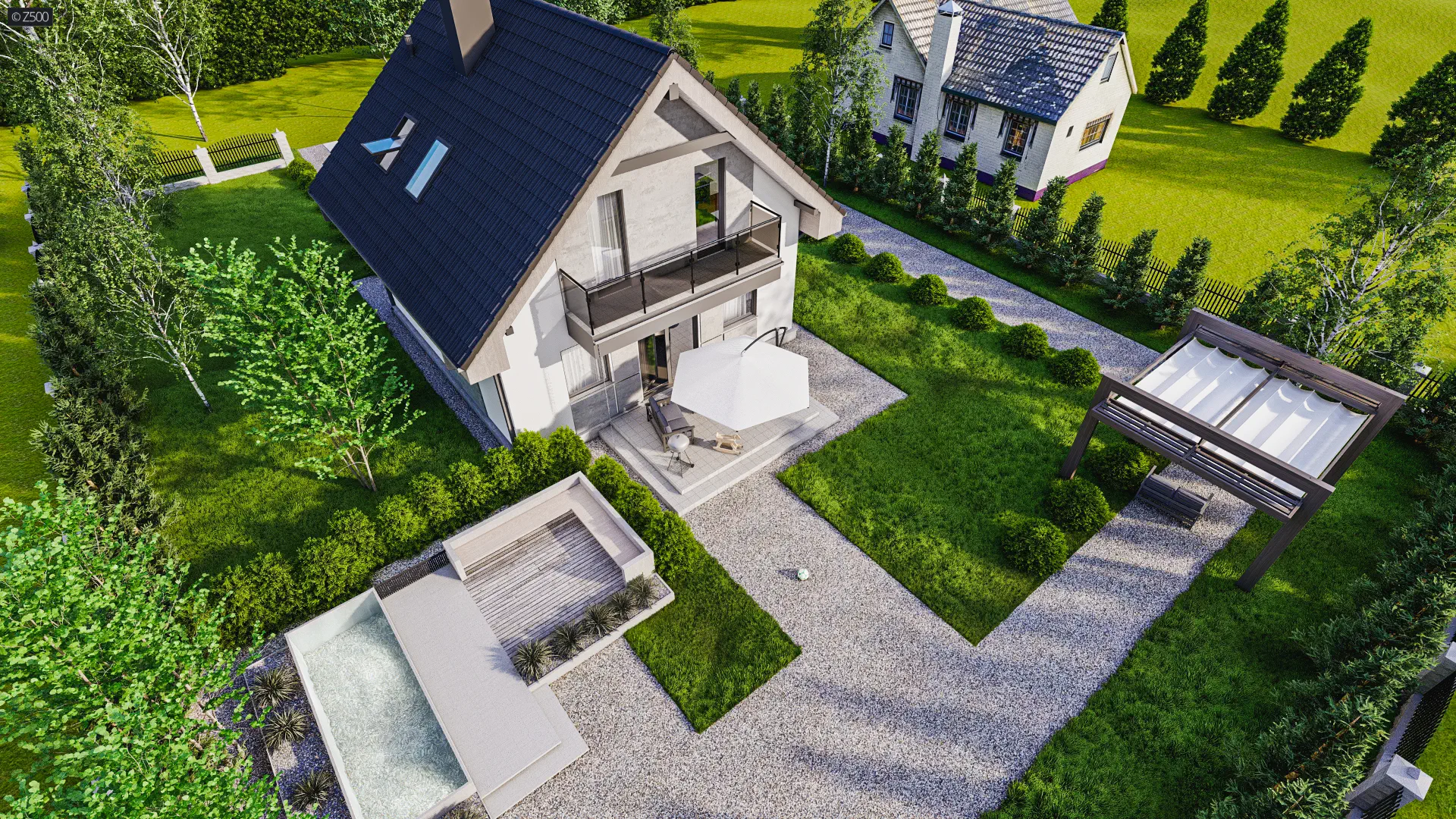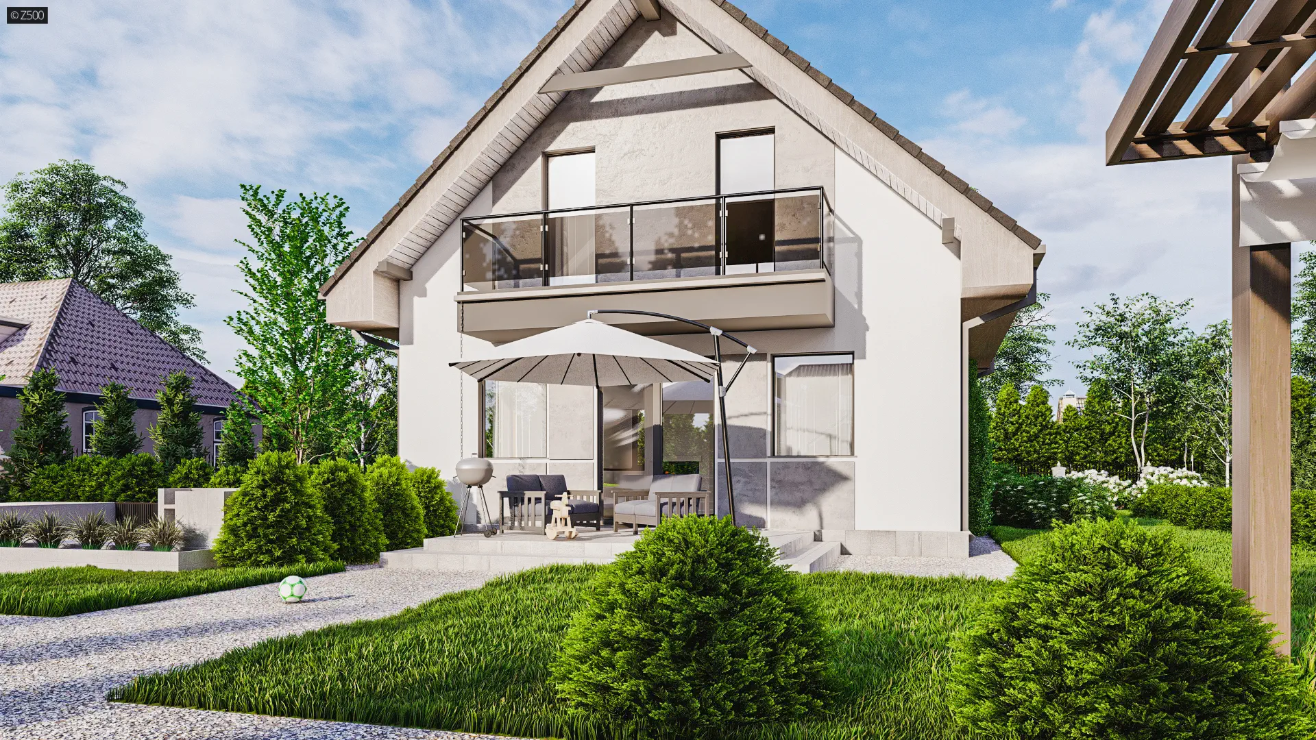 Na parterze usytuowano wygodny pokój dzienny z przejściem do kuchni. Salon, w którym znajduje się narożny kominek, połączony jest jedno-przestrzennie z aneksem jadalnym. W innym wariancie usytuowaliśmy „podwójny” kominek na ścianie od ogrodu– tworząc na tarasie miejsce do grilla. Balkon znajduje się od strony ogrodu, co dodatkowo daje cień na tarasie w czasie upalnych dni.