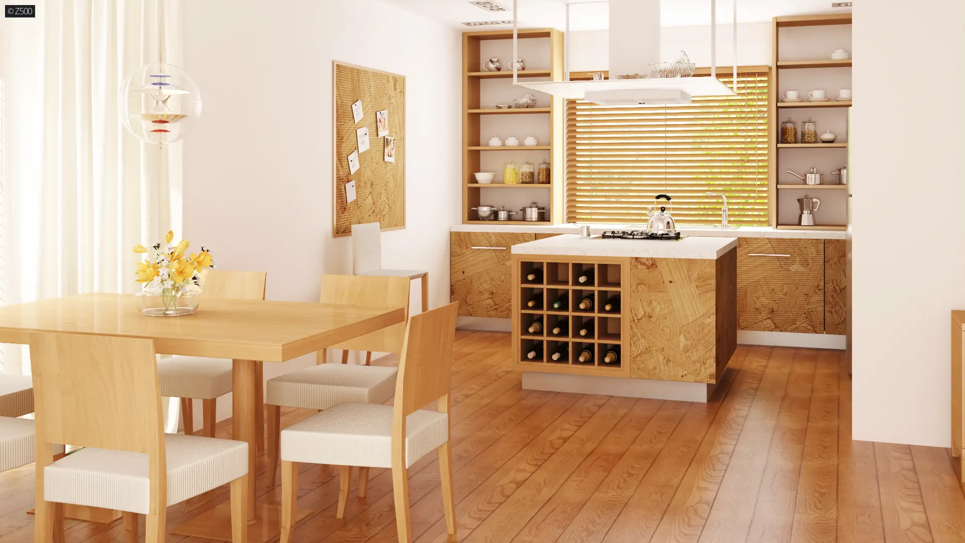 Wejście prowadzi do wygodnego wiatrołapu z miejscem na szafę, skąd przechodzimy do centralnie usytuowanego holu. Przestronna strefa dzienna składa się z dużego salonu z kominkiem, jadalni z wykuszem oraz jasnej, otwartej kuchni z praktyczną spiżarnią. Liczne przeszklenia zapewniają doskonałe doświetlenie wnętrza i łączność z ogrodem.