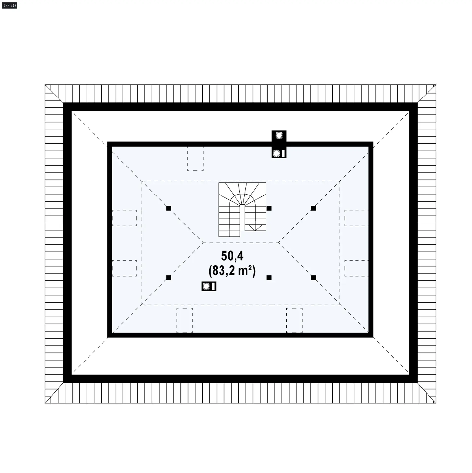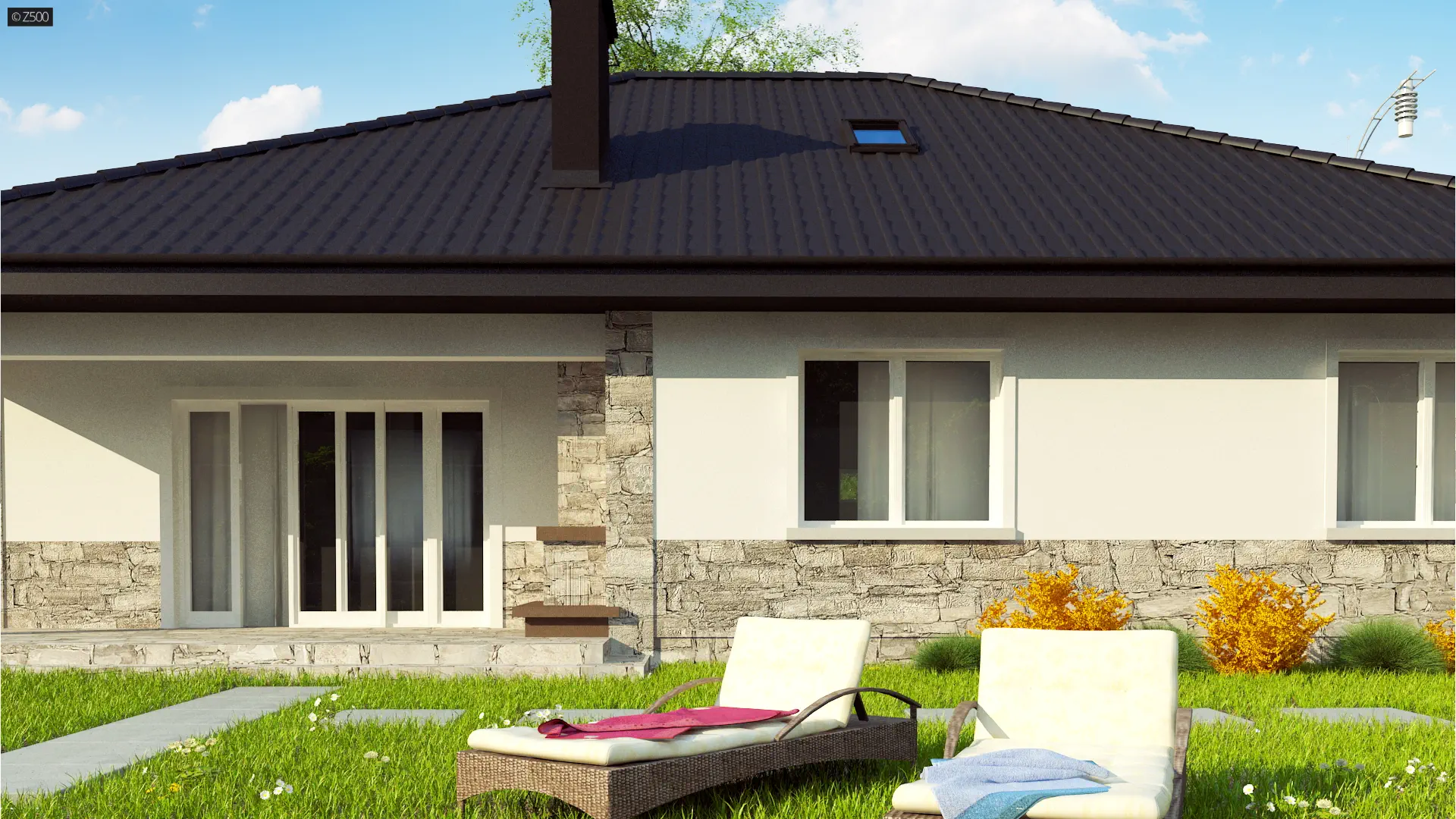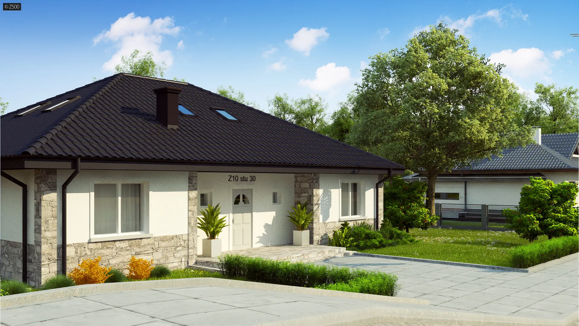 W wariancie Z10stu30 zmieniliśmy kąt nachylenia połaci dachowych na 30st.. Jest to projekt ze stropem użytkowym teriva.