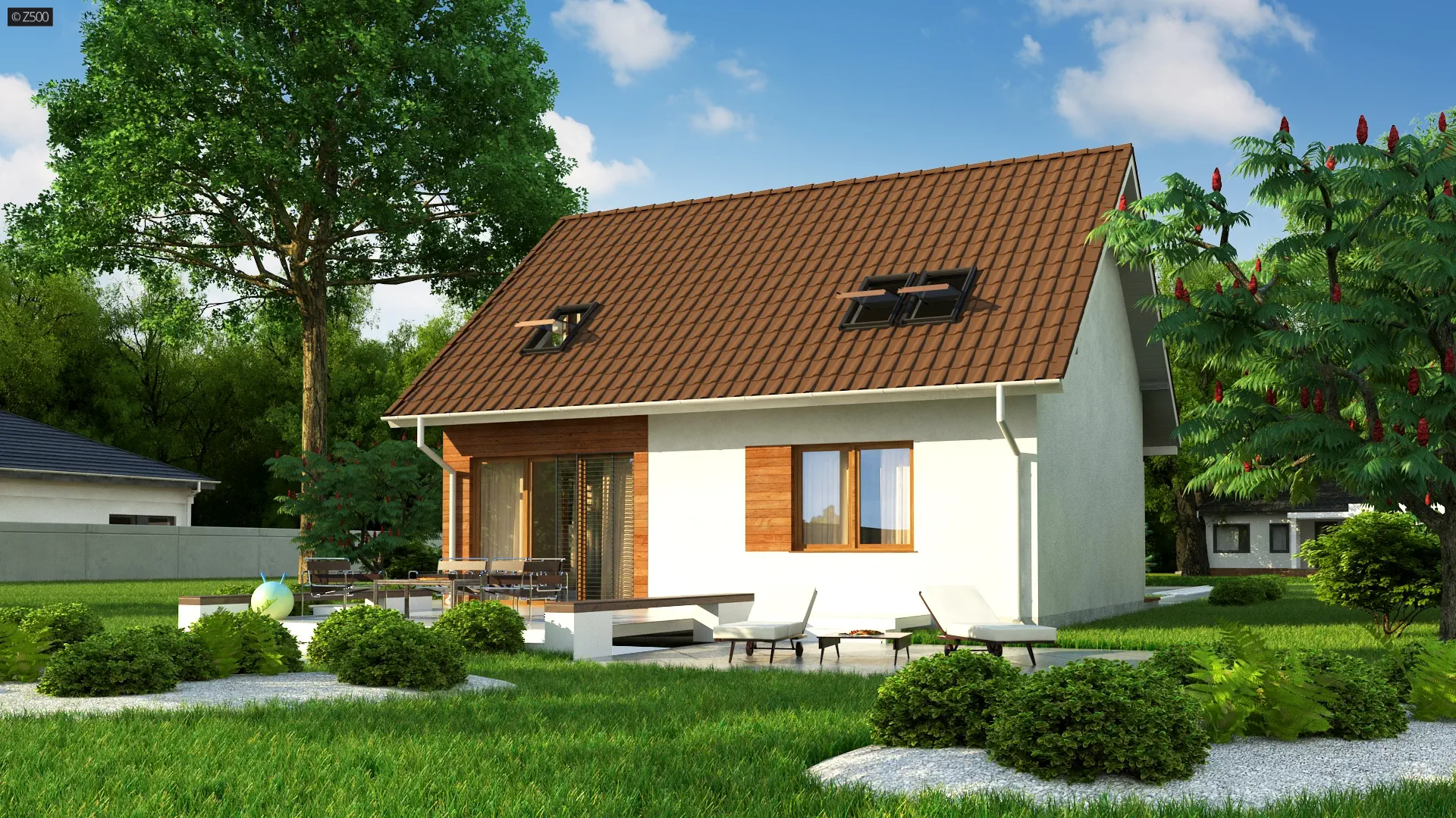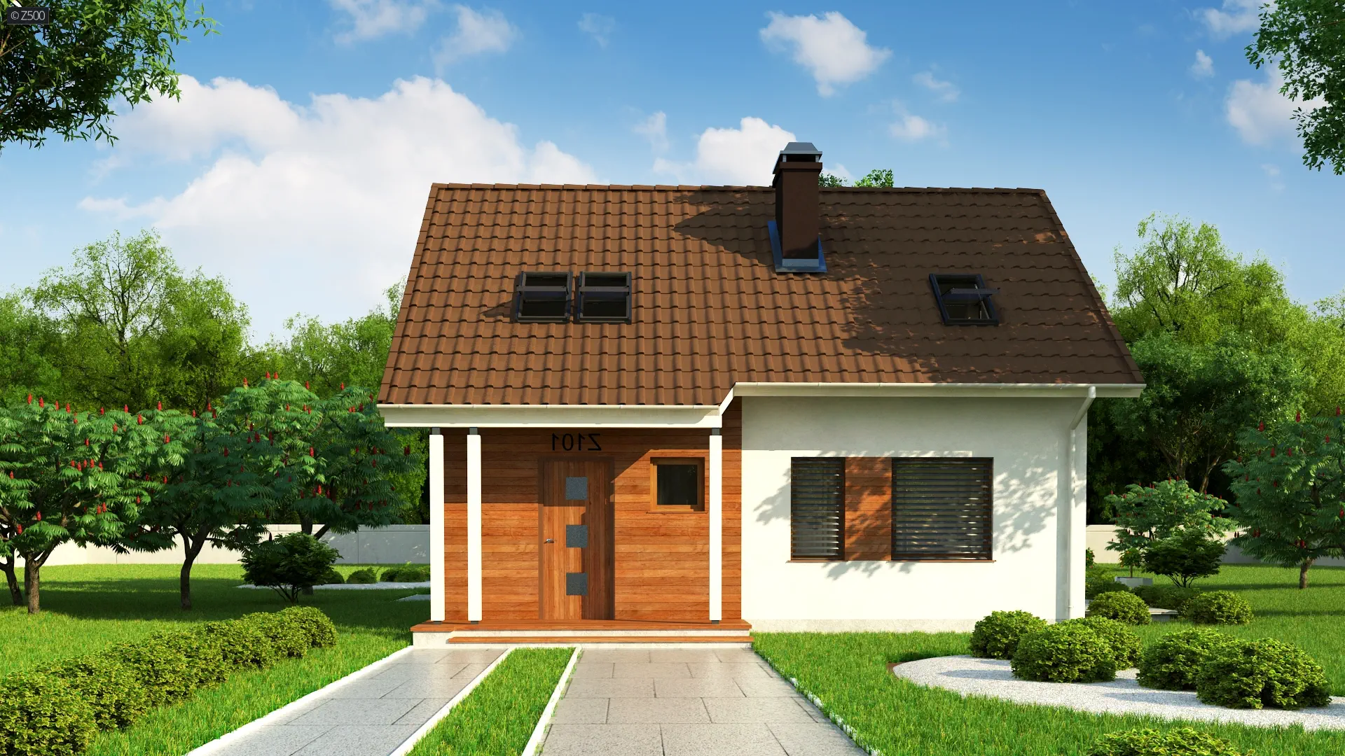 Projekt domu Z101 h+ to projekt funkcjonalny i tani w budowie ze względu na prostą konstrukcje dachu. Optymalny kąt nachylenia dachu oraz wyższa ścianka kolankowa pozwalają zagospodarować poddasze na 3 pokoje oraz wygodną łazienkę.