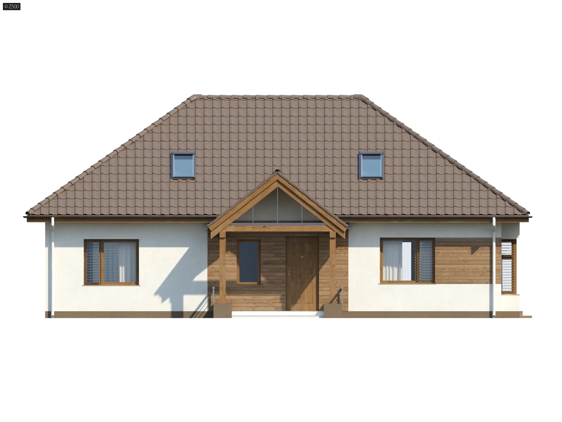 Z106 to projekt domu parterowego o estetycznym wyglądzie i komfortowym wnętrzu. Prosta, zgrabna bryła, wysunięty daszek na słupkach, wykończenie elewacji naturalnymi materiałami oraz kopertowy dach nadają mu stylu dawnych dworków szlacheckich.