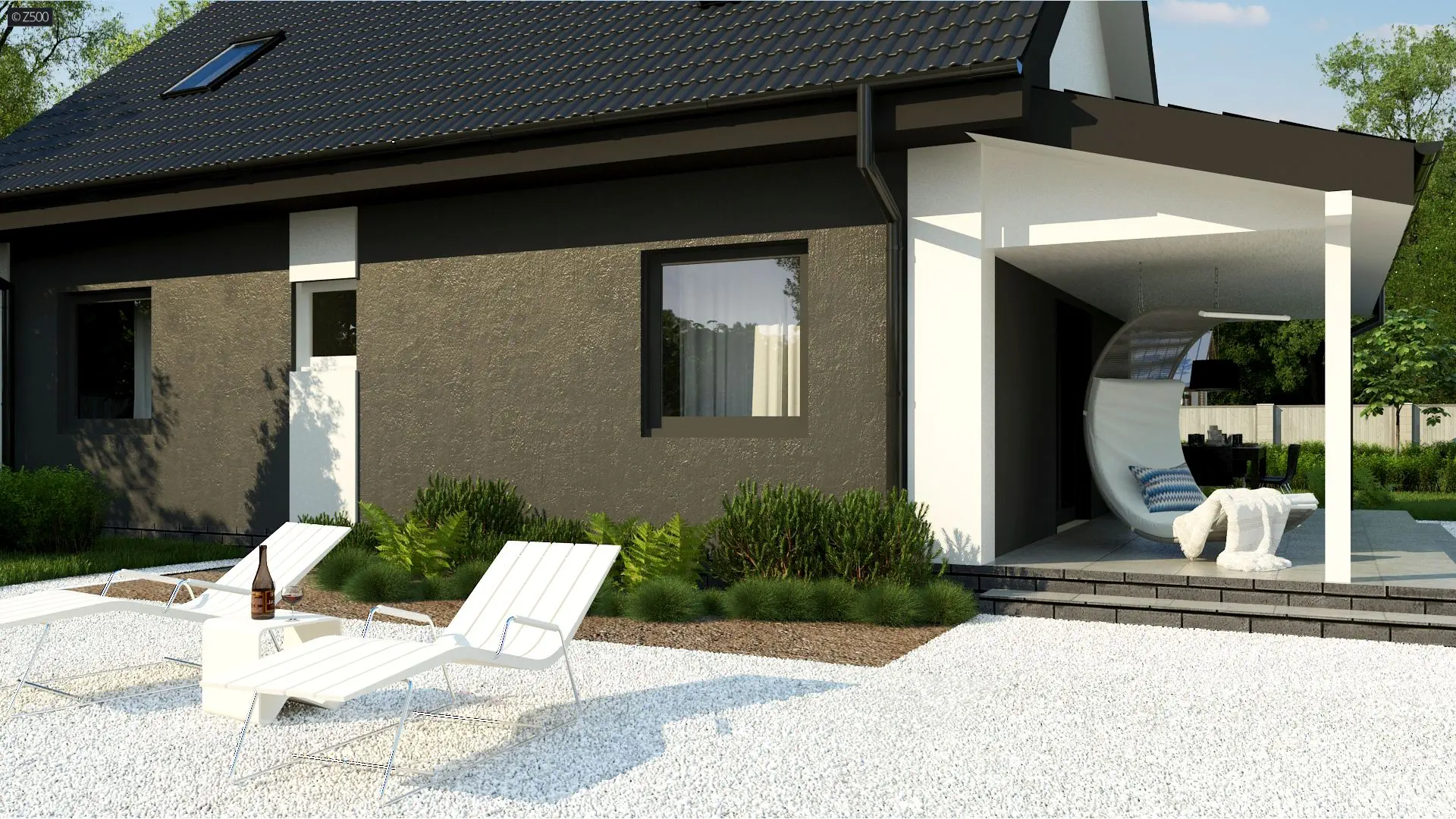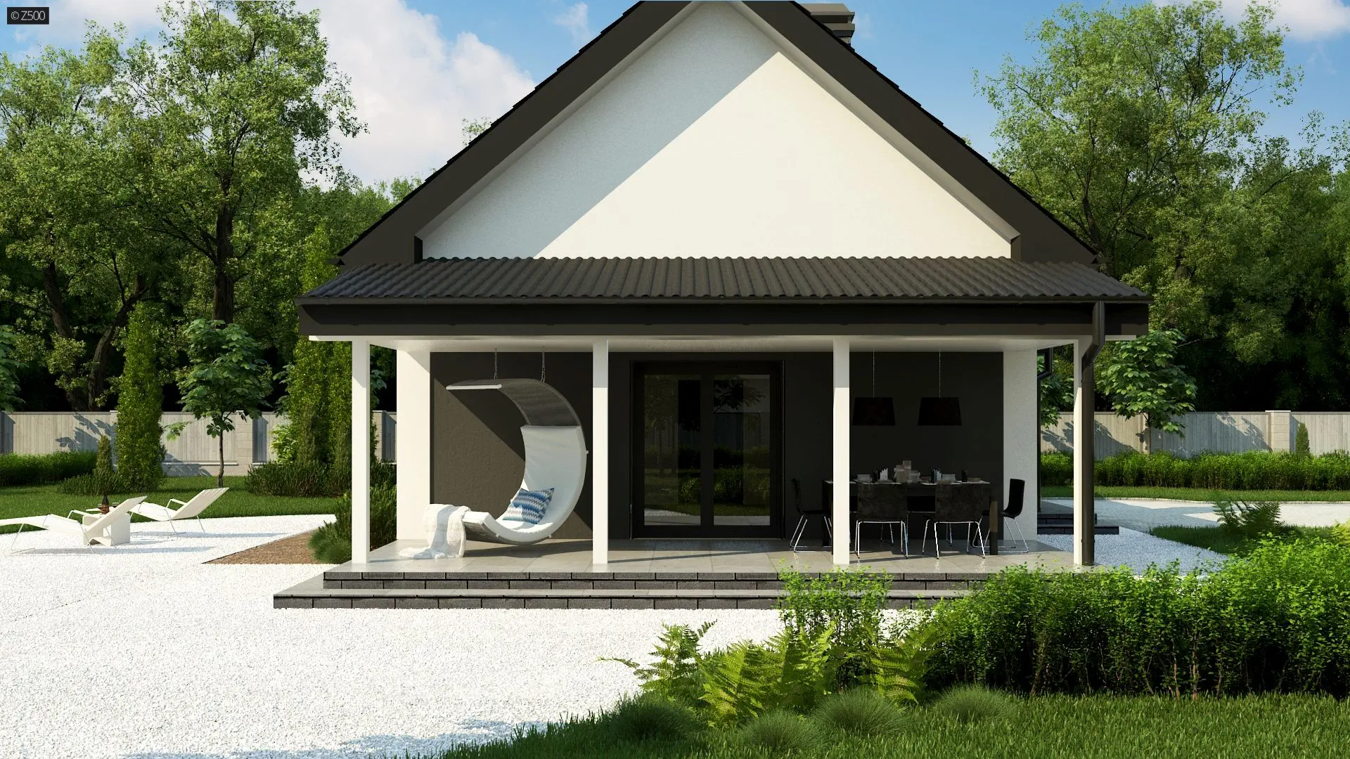 Projekt domu Z12 w technologii szkieletu drewnianego. Na bocznej elewacji znajduje się zadaszony taras.