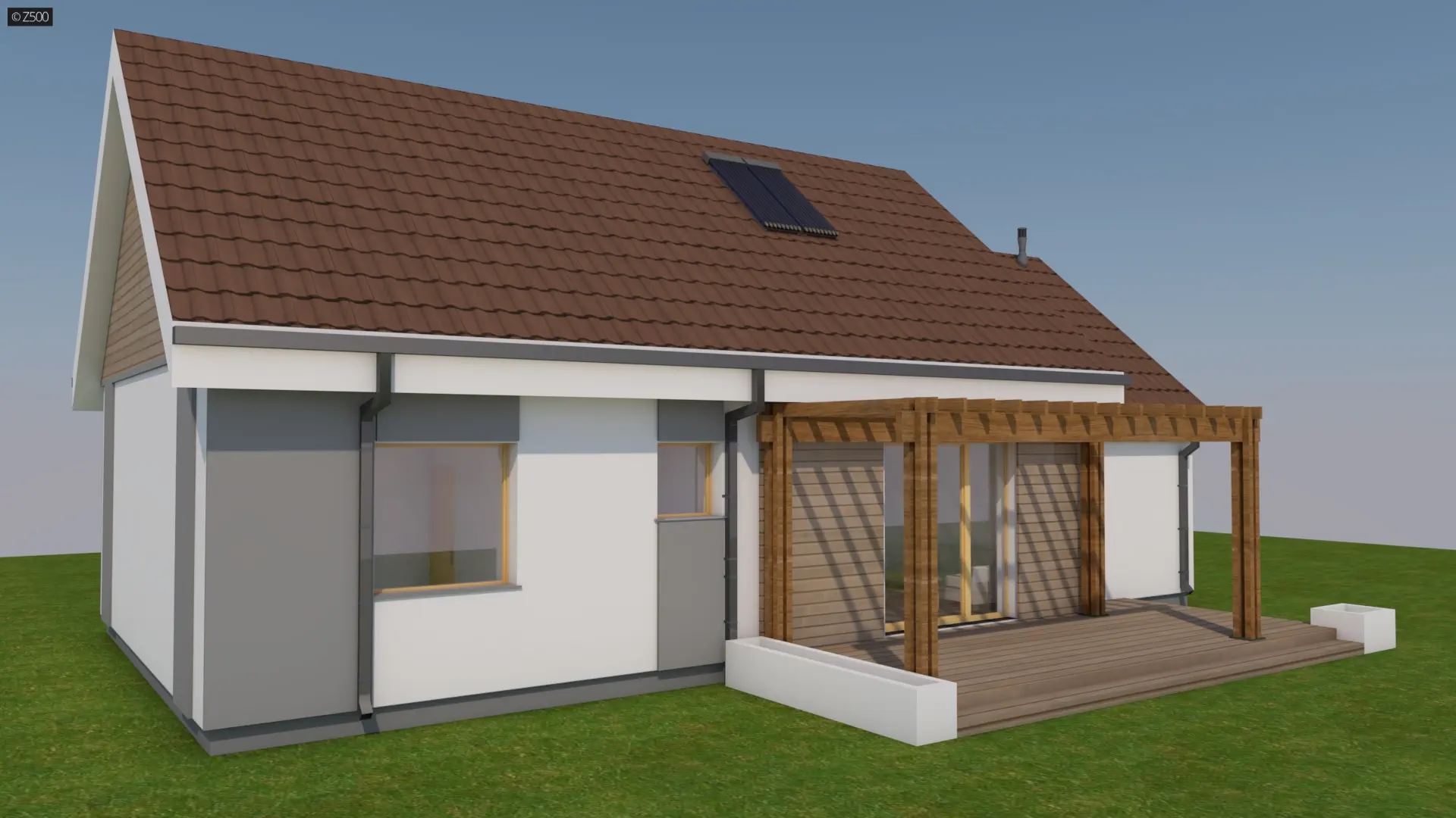 Z12 GL to zgrabny dom parterowy z opcją zagospodarowania poddasza. Prosta bryła oraz możliwością etapowania inwestycji czynią go tanią i ekonomiczną inwestycją. Konstrukcja oparta na ścianach zewnętrznych pozwala na dowolne kształtowanie wnętrza ściankami działowymi.