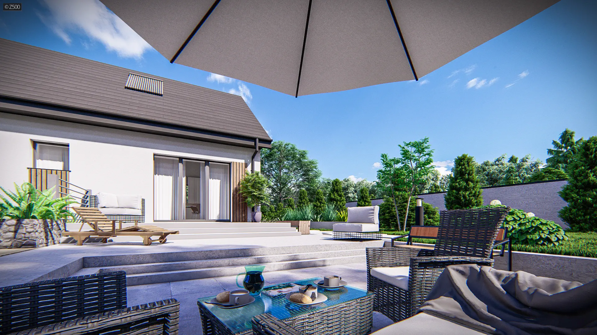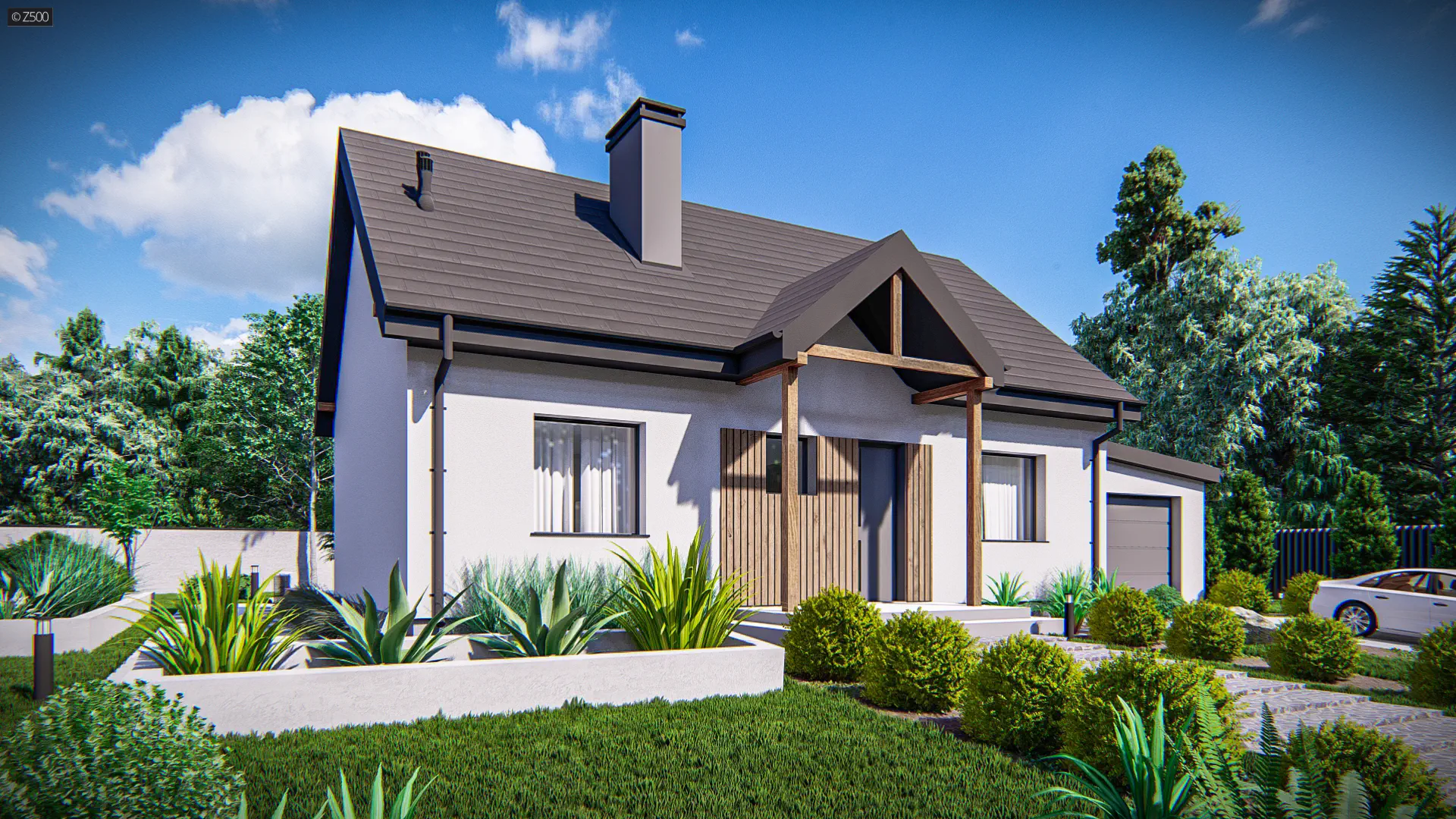 Z12 GP+ (FR s2s) to zgrabny dom parterowy z opcją zagospodarowania poddasza. Prosta bryła czyni ten dom tanią i ekonomiczną inwestycją. Elewacja budynku wykonana jest z jasnego tynku strukturalnego, a przy drzwiach wejściowych oraz od strony tarasu można zauważyć drewniane wykończenie.
