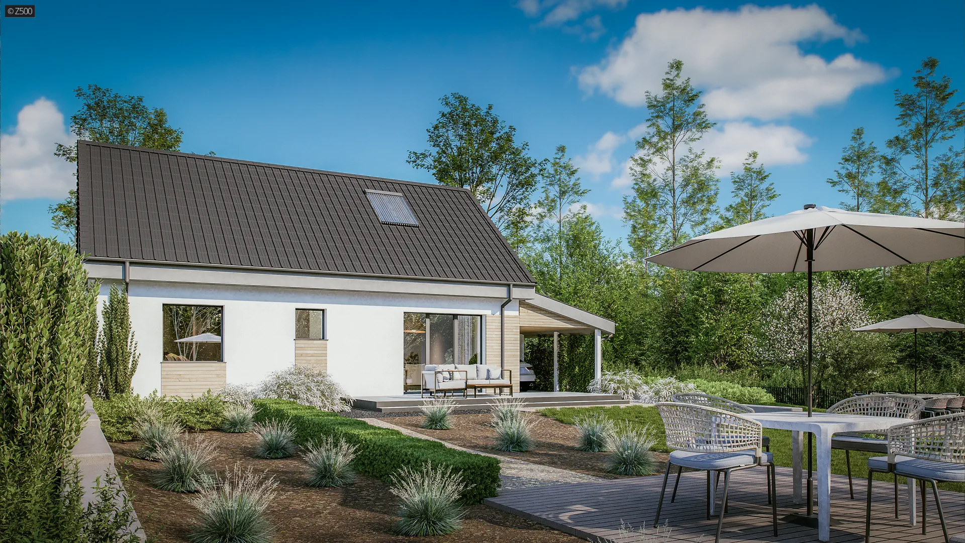 Projekt domu Z12 w technologii murowanej, w wersji z wiatą boczną – jako zadaszenie tarasu lub miejsca do parkowania samochodu. Wariant ten umożliwia zagospodarowanie poddasza.