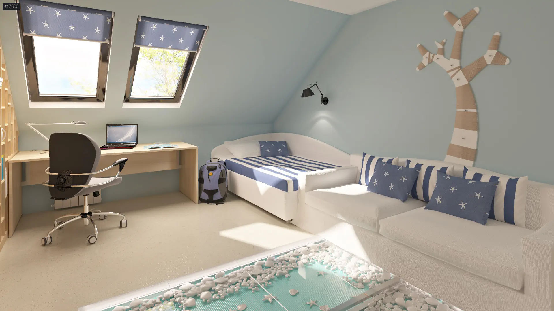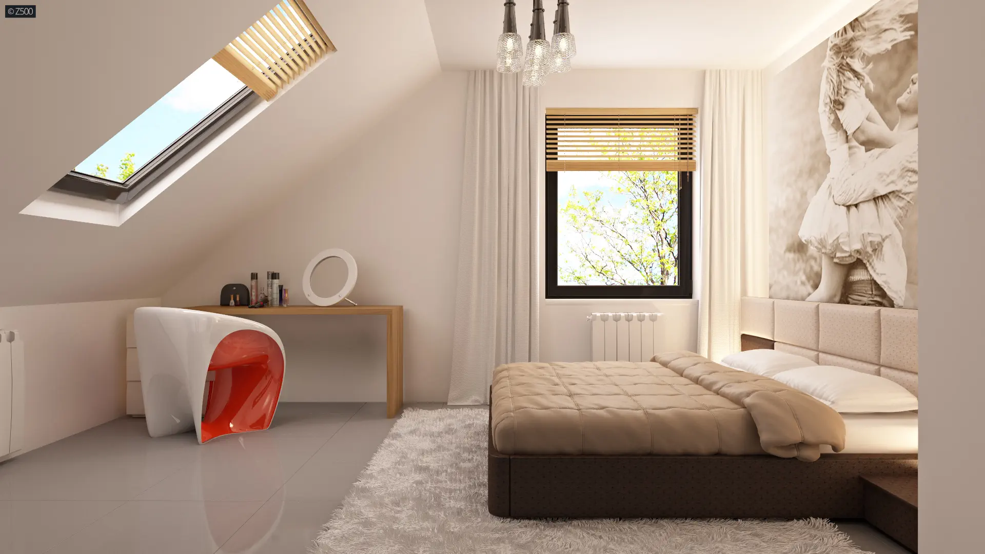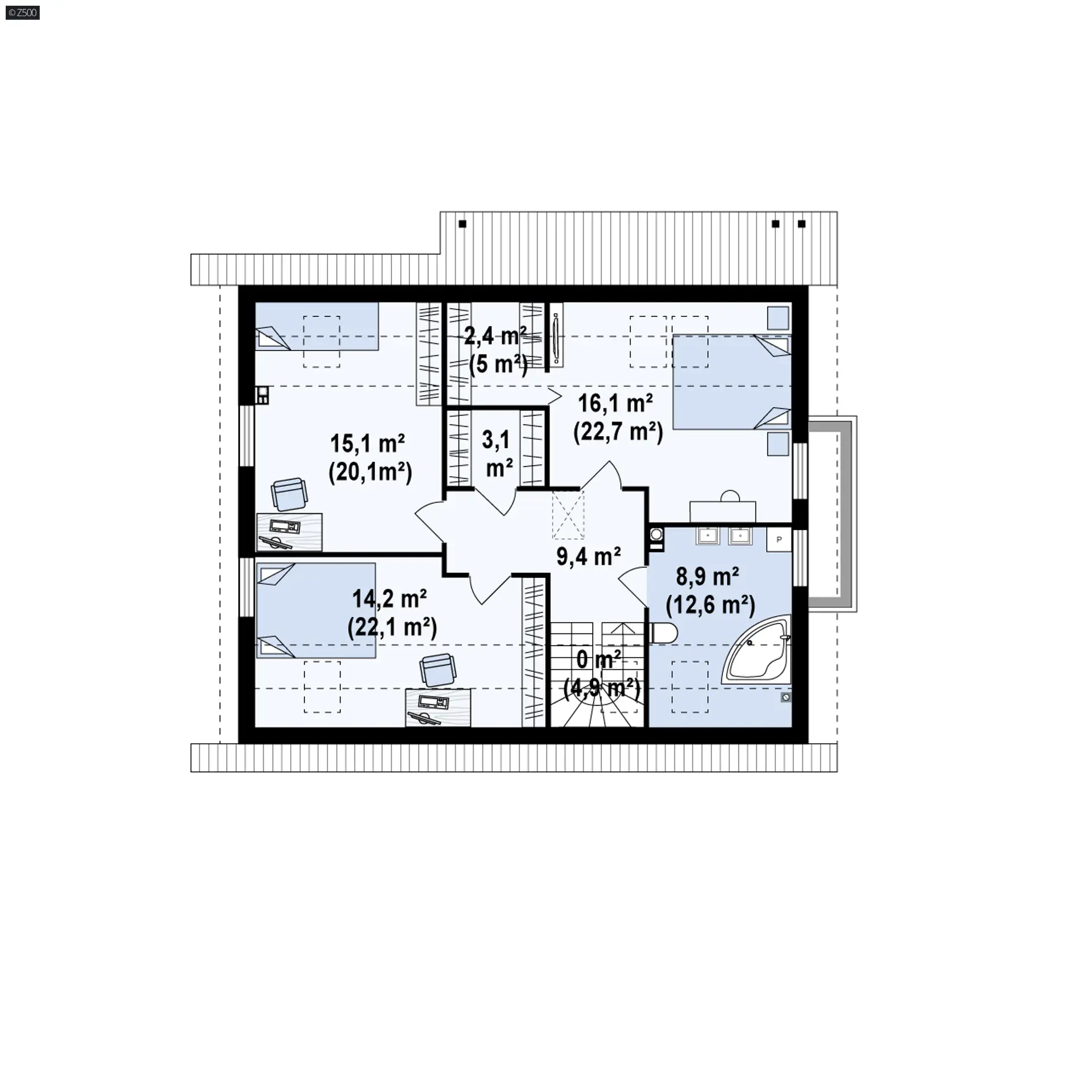 Projekt Z124 odznacza się wyjątkowo komfortowym układem pomieszczeń. Główną częścią jest przestronny, jasny salon. Wykusz urozmaica wnętrze i wydziela z przestrzeni aneks jadalny. Kuchnia zaprojektowana w kompozycji otwartej doskonale powiększa całe pomieszczenie. W centralnym miejscu strefy dziennej zaplanowano kominek, który nadaje wnętrzu przytulnego i ciepłego charakteru. Na poddaszu znajdują się trzy przestronne sypialnie, garderoba oraz komfortowa łazienka z miejscem na dużą wannę. Pokój gospodarzy posiada własną garderobę.