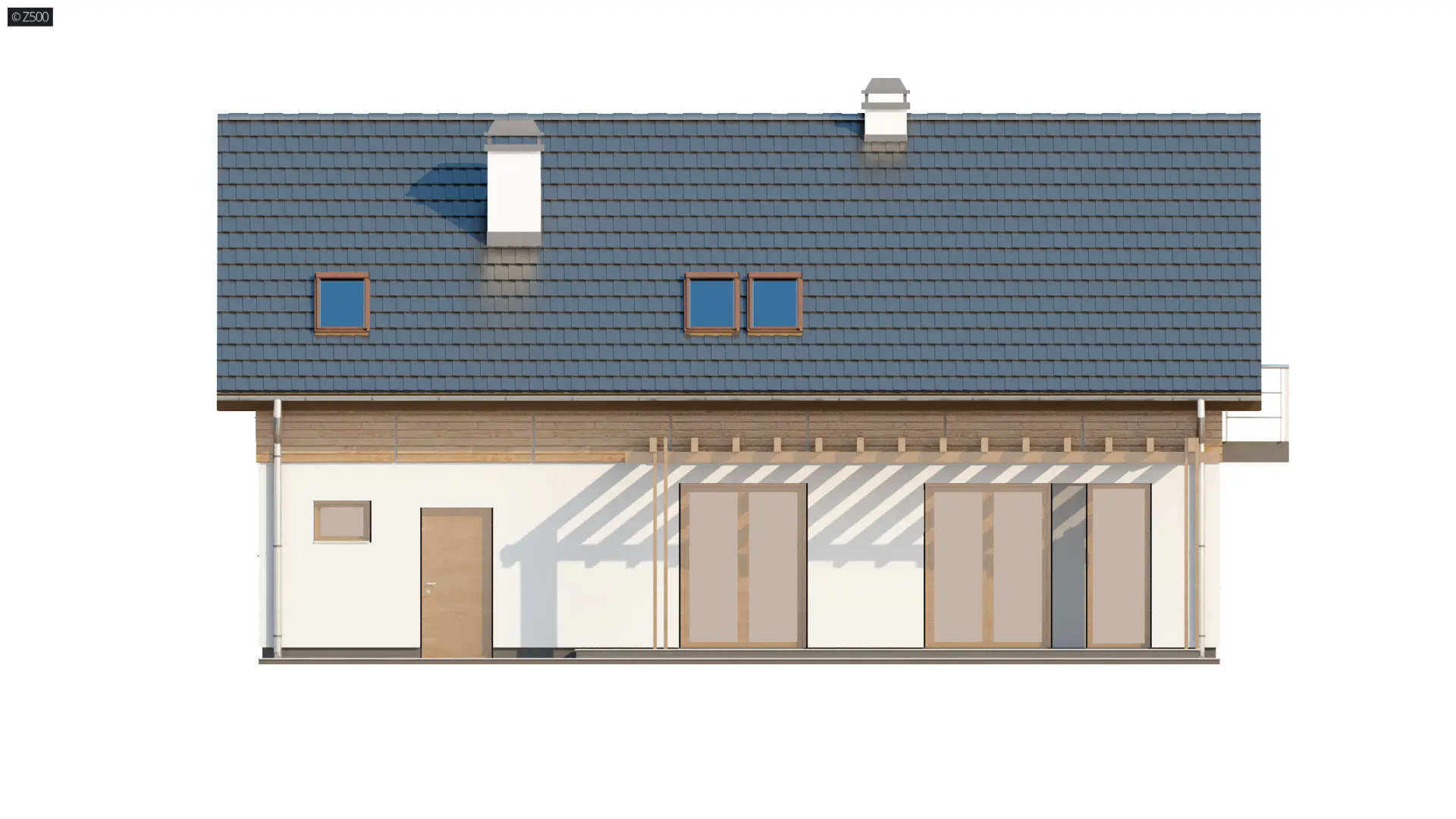 Z130 to funkcjonalny dom z poddaszem o zgrabnej, zwartej bryle z dwuspadowym dachem i garażem wbudowanym w bryłę. Poddasze zostało wyróżnione poprzez zastosowanie okładziny drewnianej.