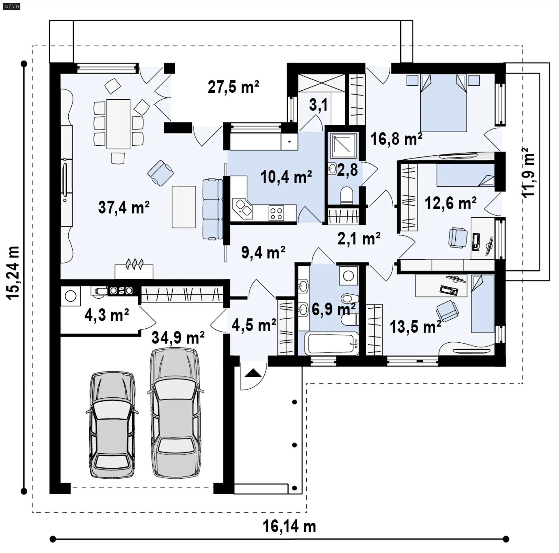 Strefy reprezentacyjna oraz nocna są wyraźnie wydzielone, co zapewnia domownikom wygodę i komfort użytkowania. Strefa dzienna to przestronny salon z kominkiem i wyjściem na zadaszony taras, połączony z jadalnią oraz kuchnią w której znalazło się miejsce na podręczną spiżarnię W części nocnej zaprojektowano trzy wygodne sypialnie oraz dużą łazienkę. Sypialnia gospodarzy z dużymi oknami balkonowymi została wyposażona dodatkowo w funkcjonalną łazienką lub garderobę. Poddasze nieużytkowe ze względu na dość wygodną wysokość można zaadaptować na dodatkowe pomieszczenie.