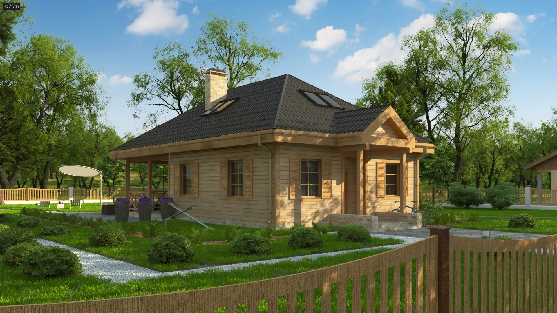 Dom w stylu rustykalnym z poddaszem użytkowym, 3 pokojami, zadaszonym tarasem