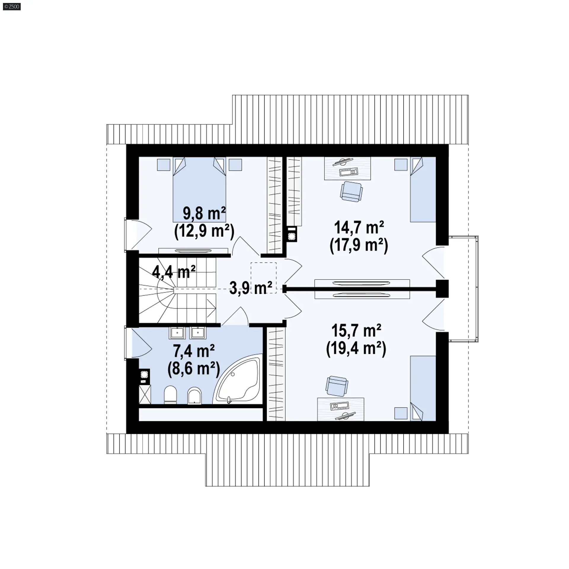 Na piętrze znajdują się trzy przestronne, wygodne sypialnie. Komfortowe wymiary oraz funkcjonalne rozwiązania, zapewnią domownikom relaks i prawdziwy wypoczynek. Duże okno w łazience naturalnie ją doświetli.