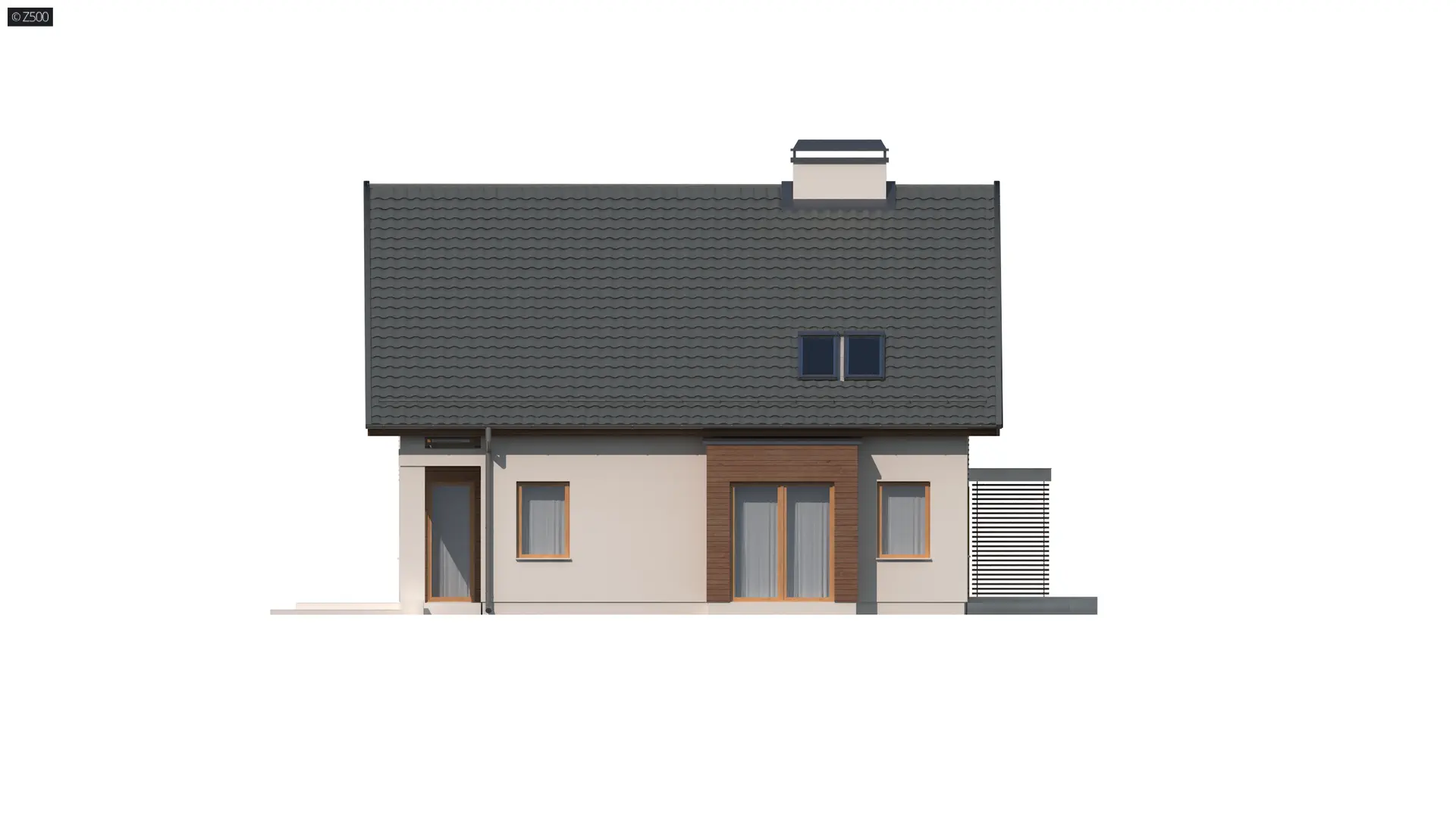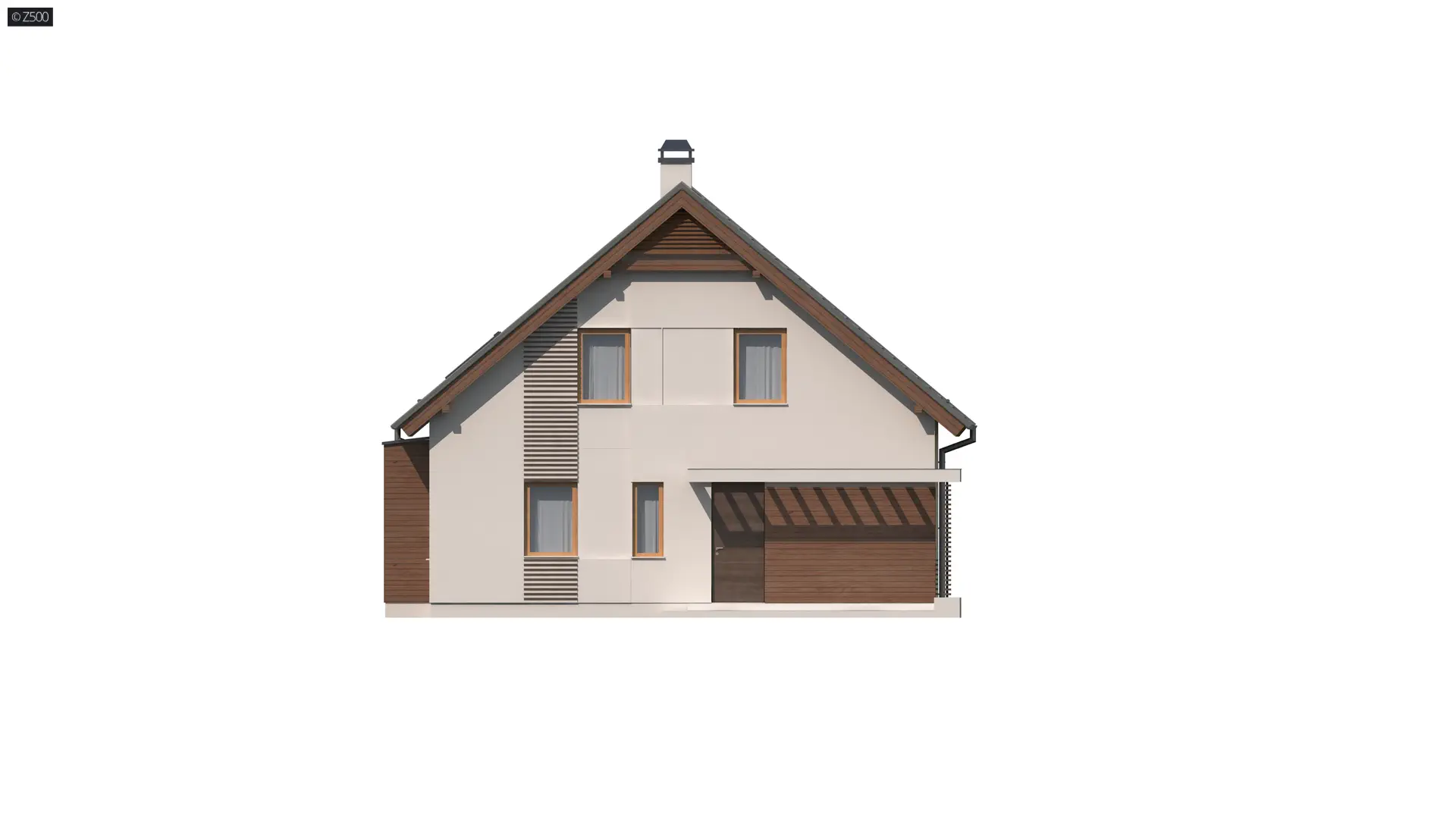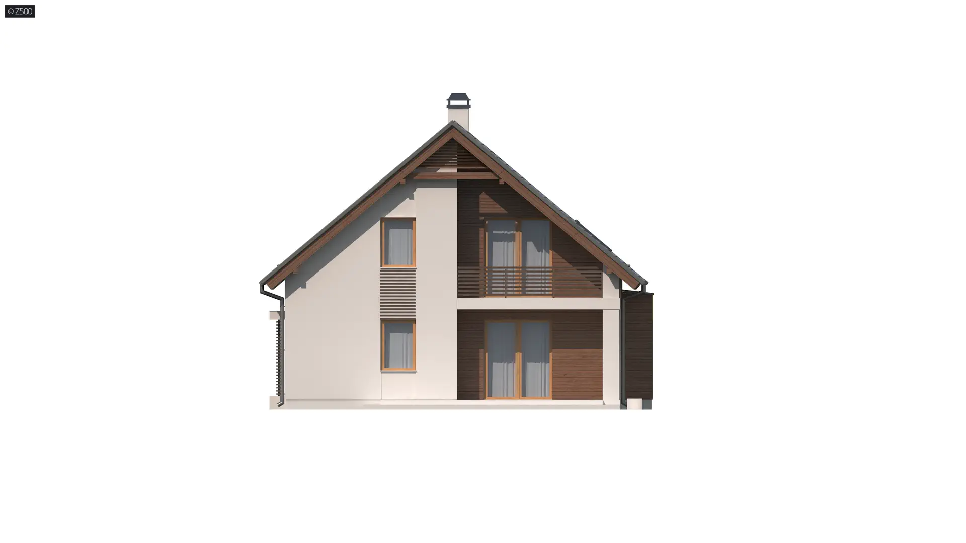Z166 to projekt z poddaszem użytkowym o prostej, zgrabnej bryle przekrytej dachem dwuspadowym. Uroku dodaje mu wykusz z dużym przeszkleniem oraz wcięcie i balkon od strony ogrodowej. Elewacje wykończono na fragmentach okładzinami z naturalnego drewna.