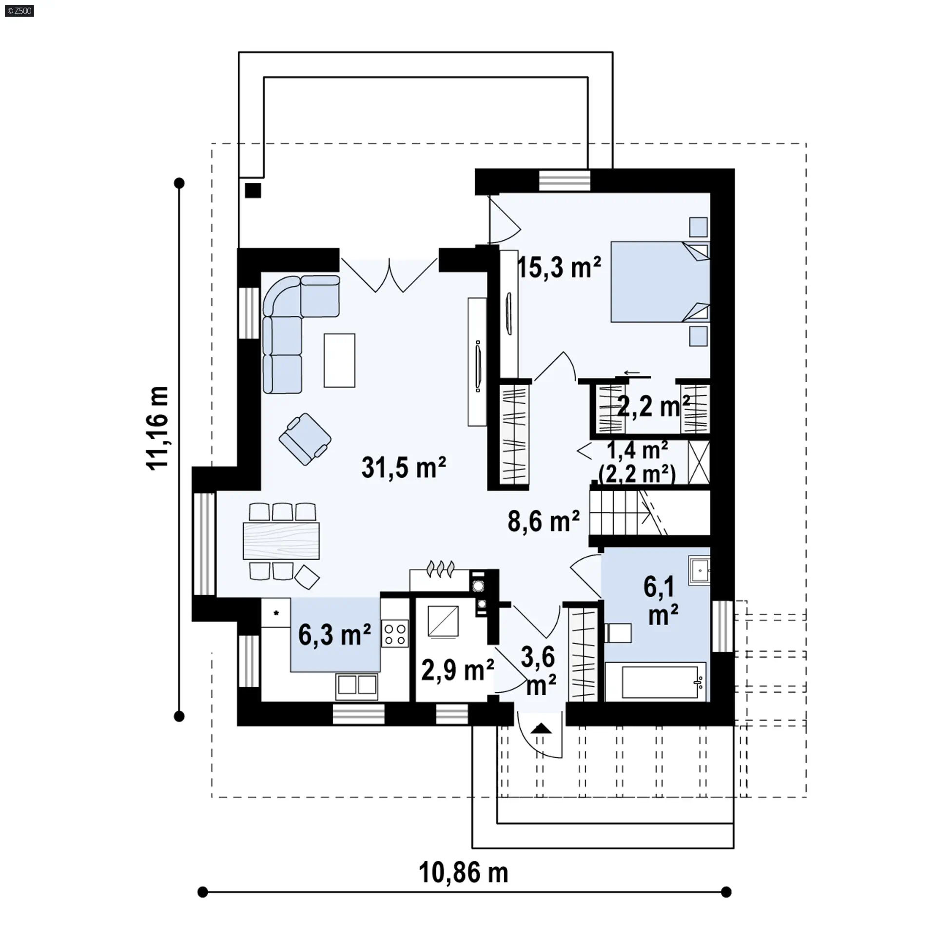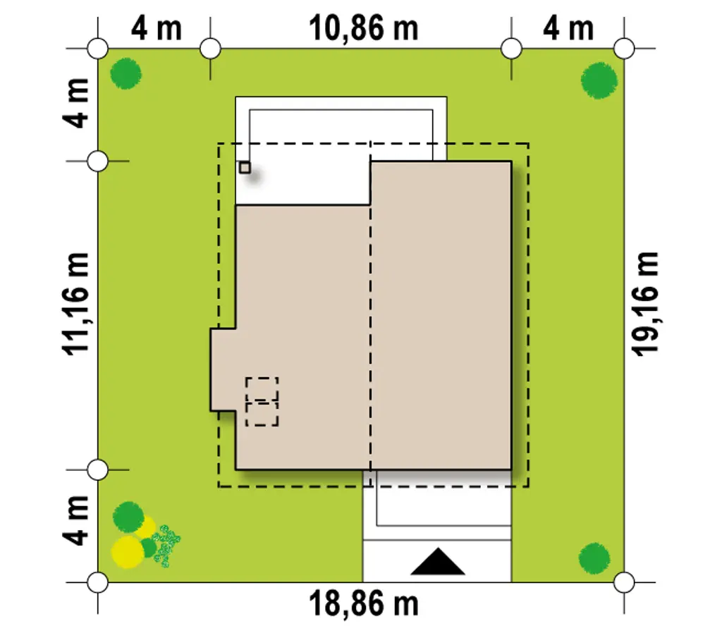 Z166 można zmieścić także na wąskiej na 16,76m działce likwidując wykusz oraz przenosząc okno w łazience na elewację frontową.