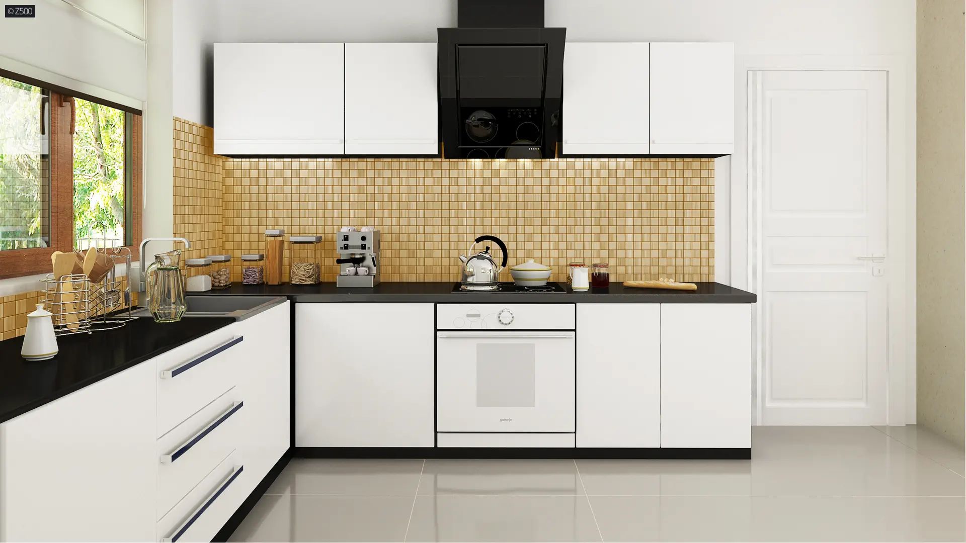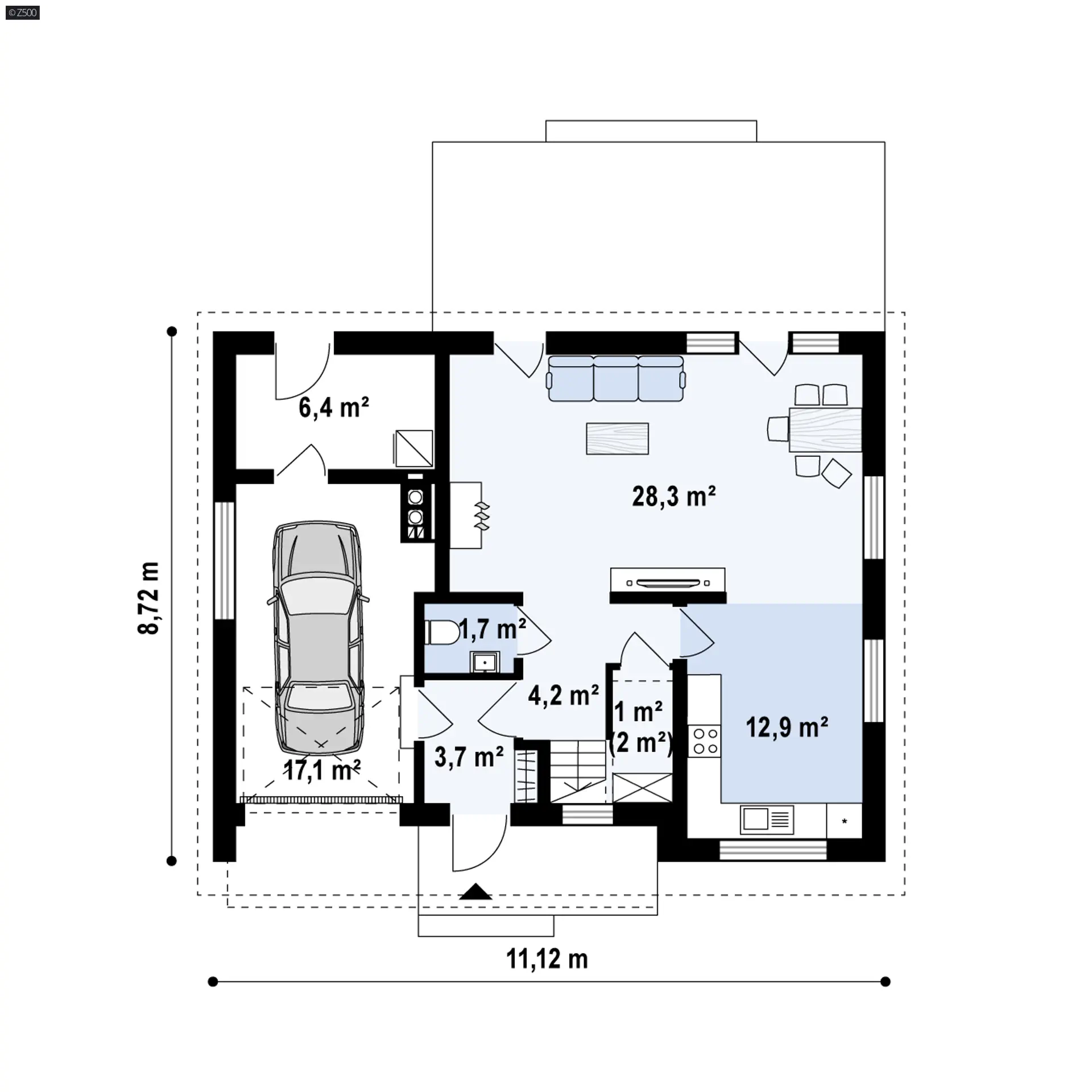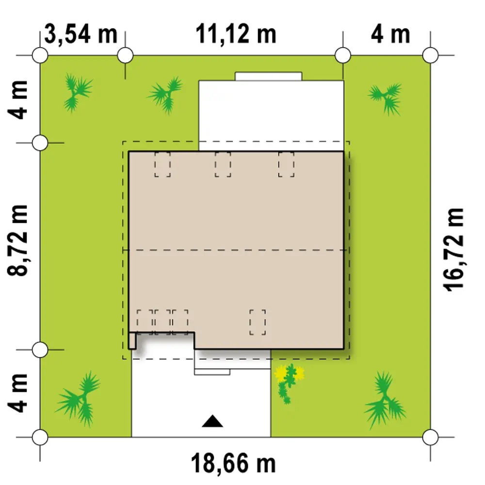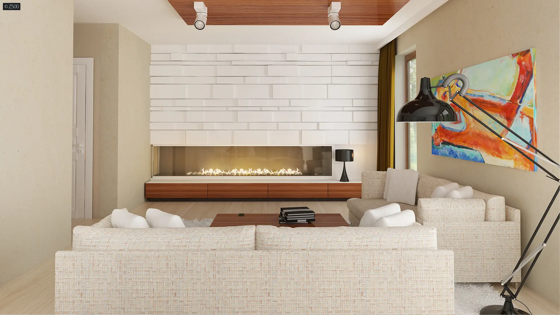 Charakterystycznymi elementami domu są poziome zadaszenia zarówno strefy wejściowej jak i części tarasowej. Mały ale funkcjonalny, z centralnie zaprojektowaną klatką schodową, którą doświetla dodatkowo okno połaciowe. Na parterze znajduje się garaż wbudowany w bryłę budynku i spora kotłownia. Zaletą tego projektu jest pojedyńczy komin co obniża koszty budowy i powoduje mniejsze straty ciepła.