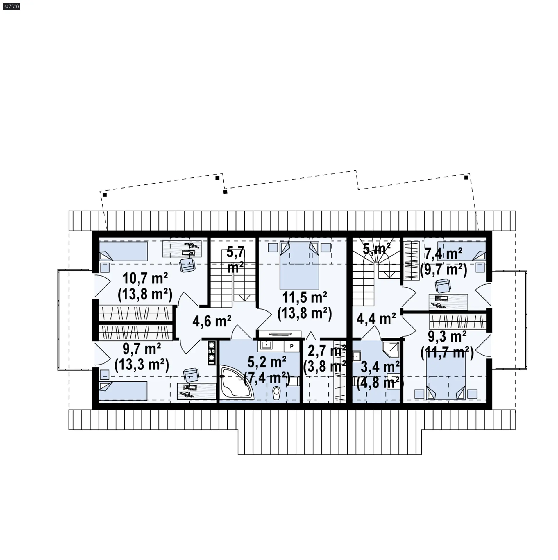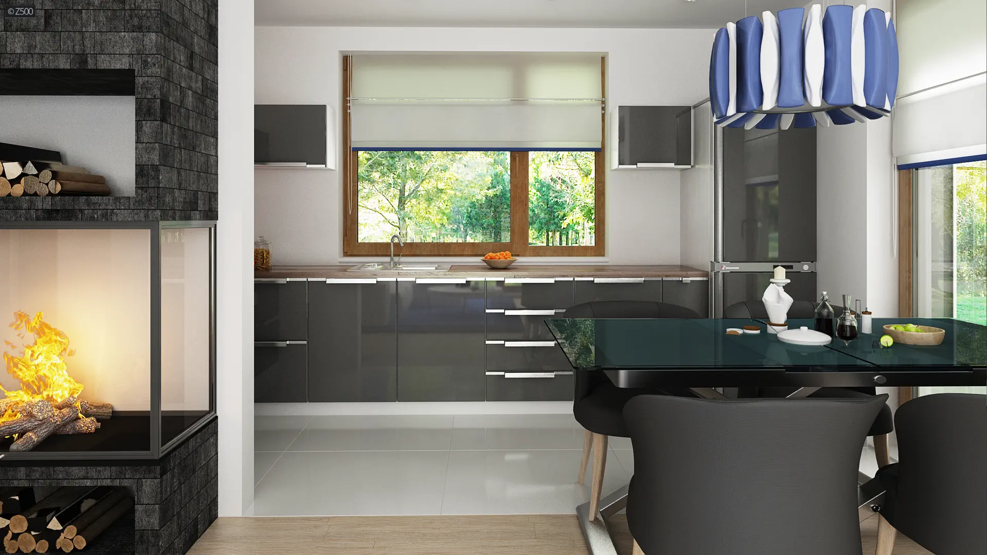 Z184 to dwie części: główna z dużą strefą dzienną, dodatkowym pokojem na parterze, trzema sypialniami na piętrze, oraz mniejsza, idealna także pod wynajem. W obu częściach strefy dziennej znajduje się wygodna funkcjonalna kuchnia, miejsce na stół, salon z kominkiem. W mniejszej zaprojektowano pieco-kominek na ekologiczne, tanie pellety. Nie jest to dodatek konieczny, duże pomieszczenie gospodarcze obsługuje cały budynek, ogrzewa wszystkie pomieszczenia. Na poddaszu mieszczą się trzy pokoje, największa sypialnia posiada własną garderobę. W mniejszej części wydzielono dwa pokoje z balkonem i łazienkę. Konstrukcja umożliwia aranżację tej przestrzeni dowolnie, ścianki można przesuwać lub całkiem usunąć, zostawiając open space np: pod aranżację studia.