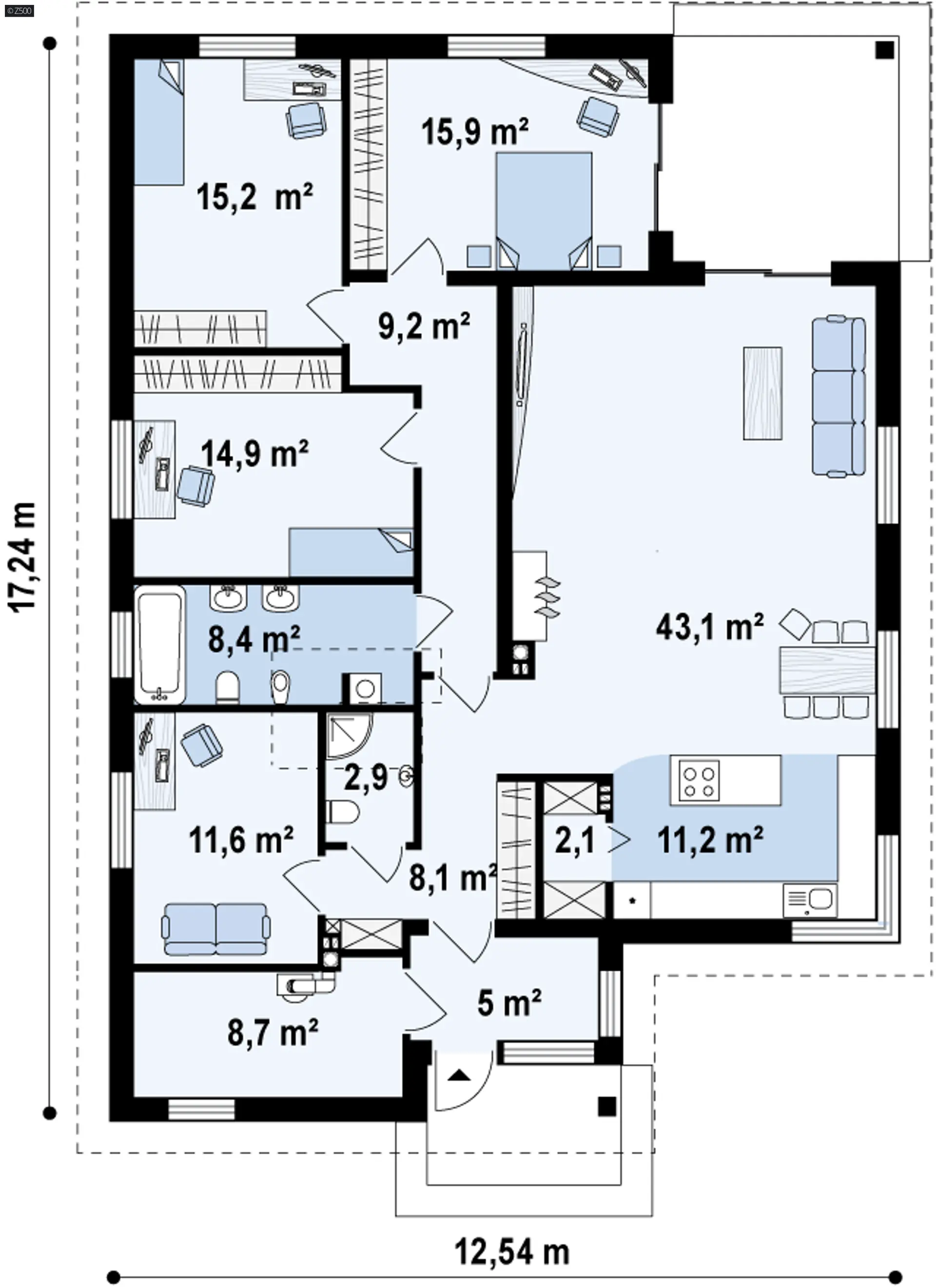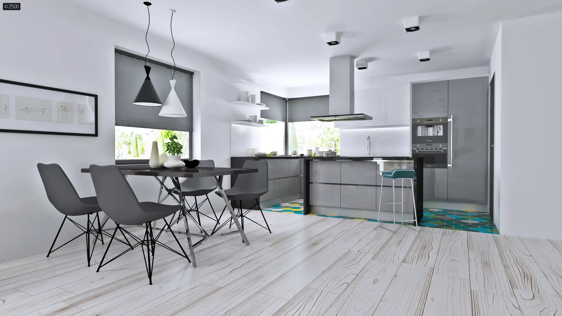 Z195 to wygodny dom parterowy z przestronną strefą dzienną oraz czterema pokojami o subtelnym wyglądzie.