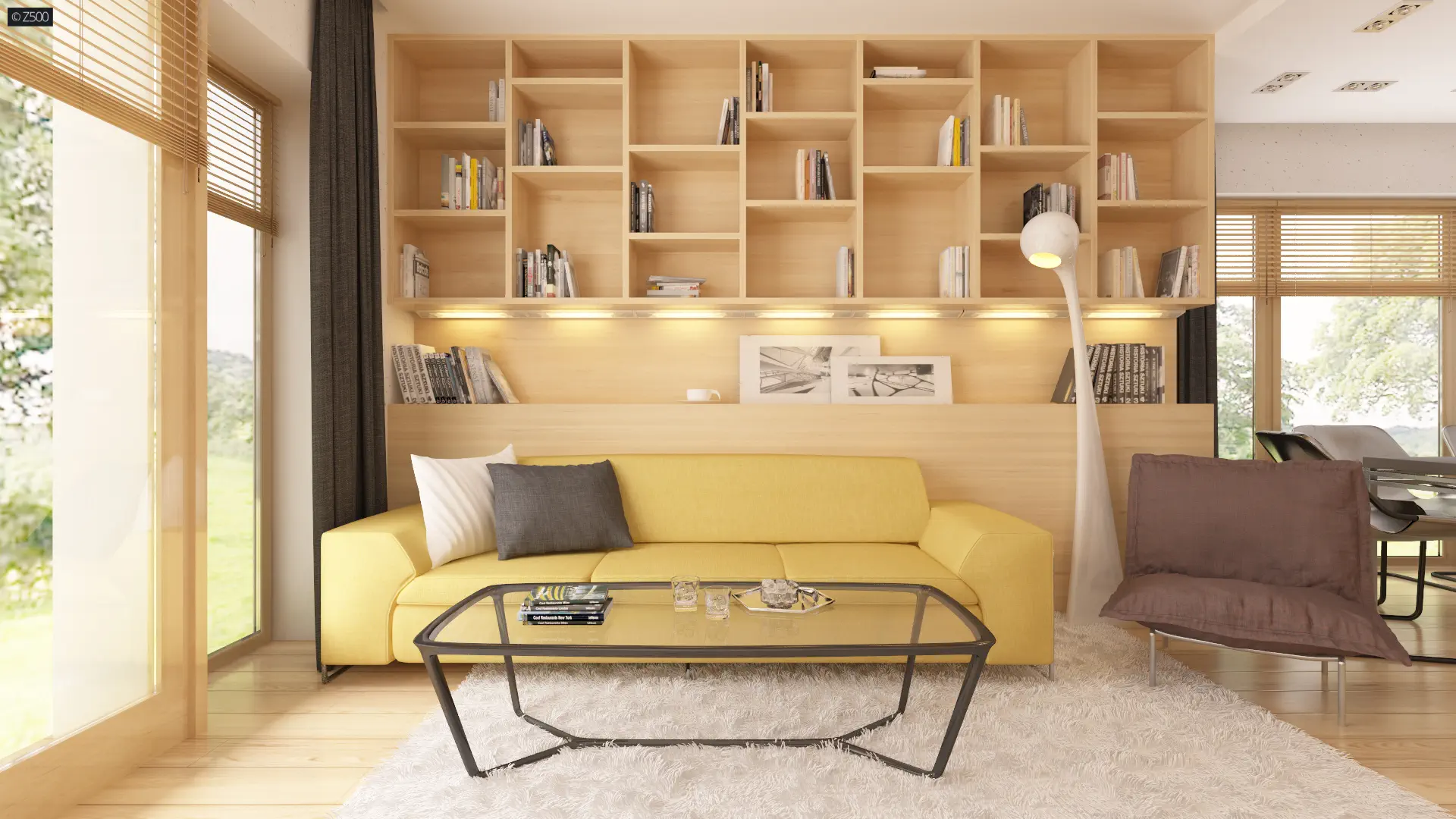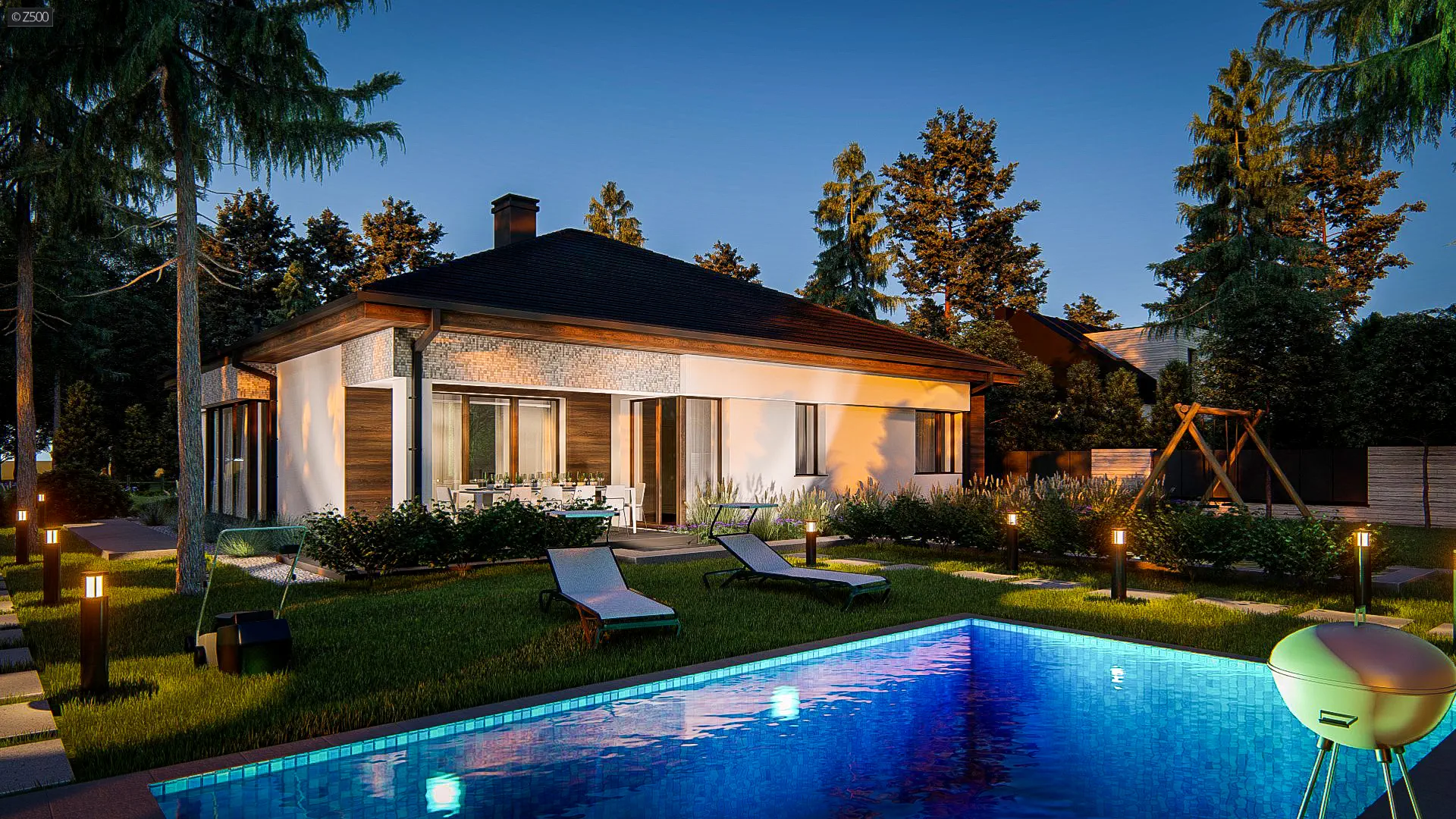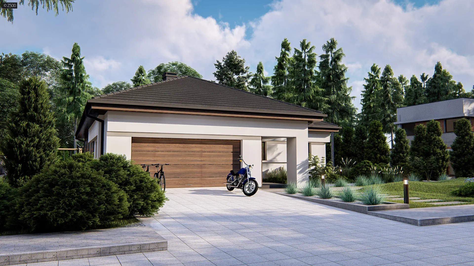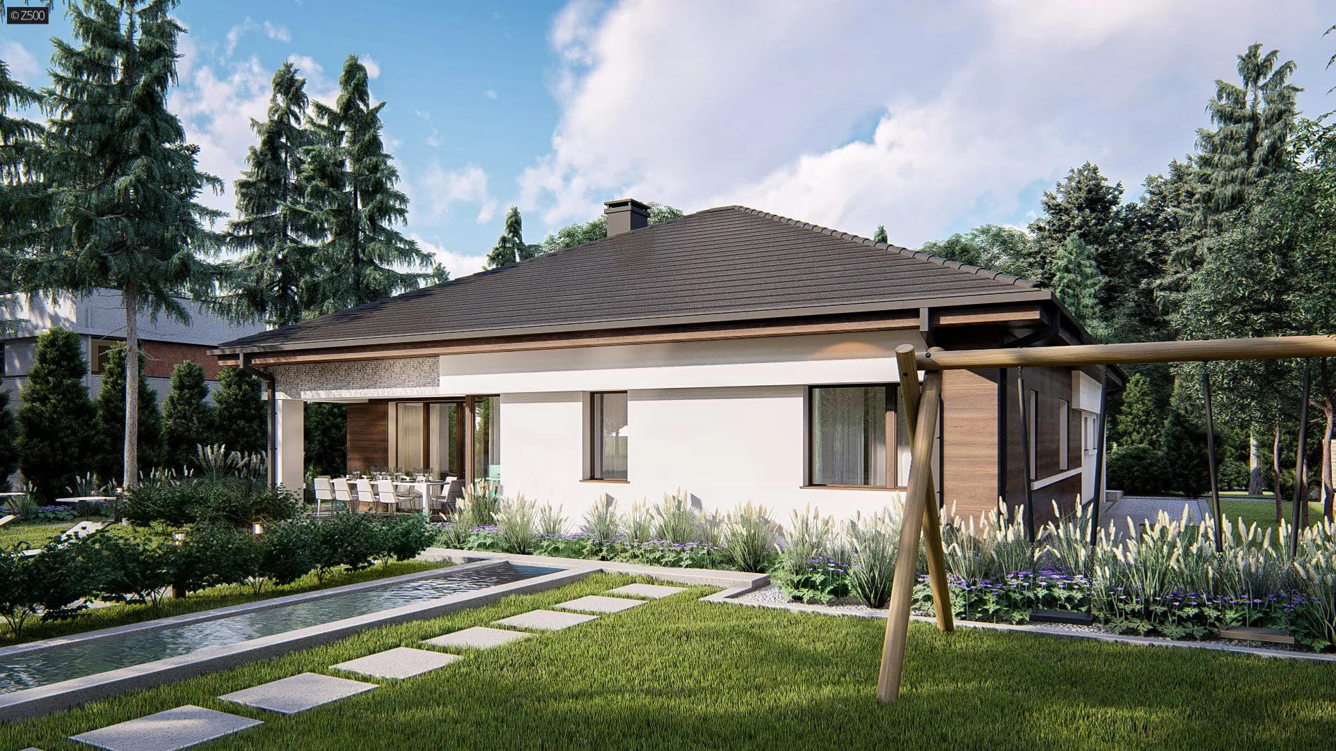 Z200 to komfortowy dom parterowy z garażem dwustanowiskowym dostępnym od frontu budynku. Elewacje i bryła wyróżniają się nowoczesną aczkolwiek spokojną i wyważoną architekturą z oryginalnymi dodatkami.