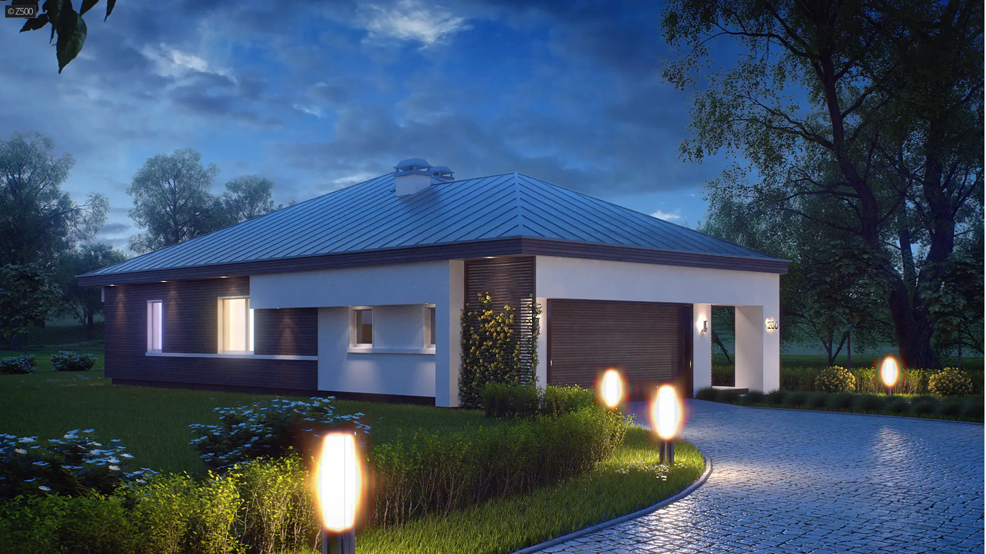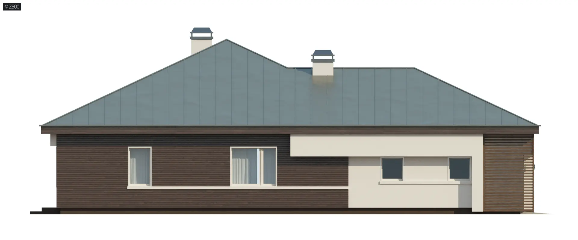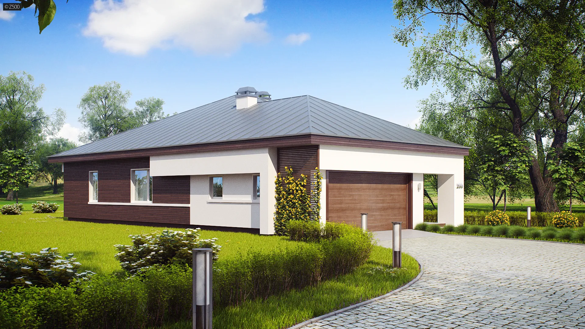 Z200 to komfortowy dom parterowy z garażem dwustanowiskowym dostępnym od frontu budynku. Elewacje i bryła wyróżniają się nowoczesną aczkolwiek spokojną i wyważoną architekturą z oryginalnymi dodatkami.