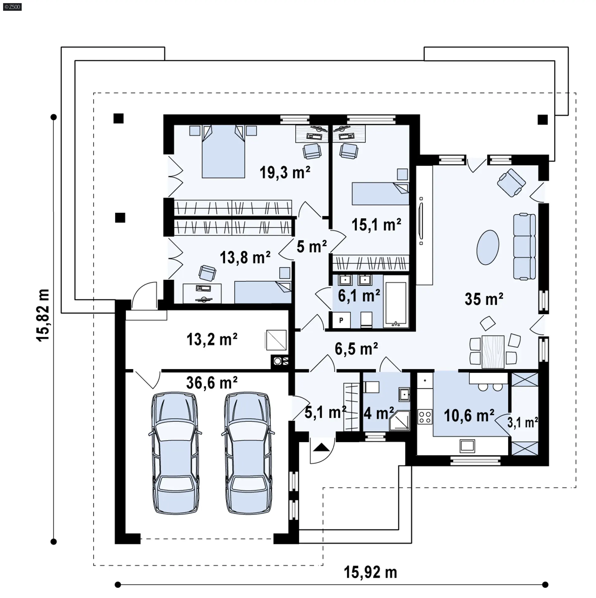 Głównym atutem Z209 są dwa zadaszone tarasy oraz obszerne pomieszczenie gospodarcze dostępne także z ogrodu. Strefy reprezentacyjna oraz nocna są wyraźnie wydzielone, co zapewnia domownikom wygodę i komfort użytkowania.