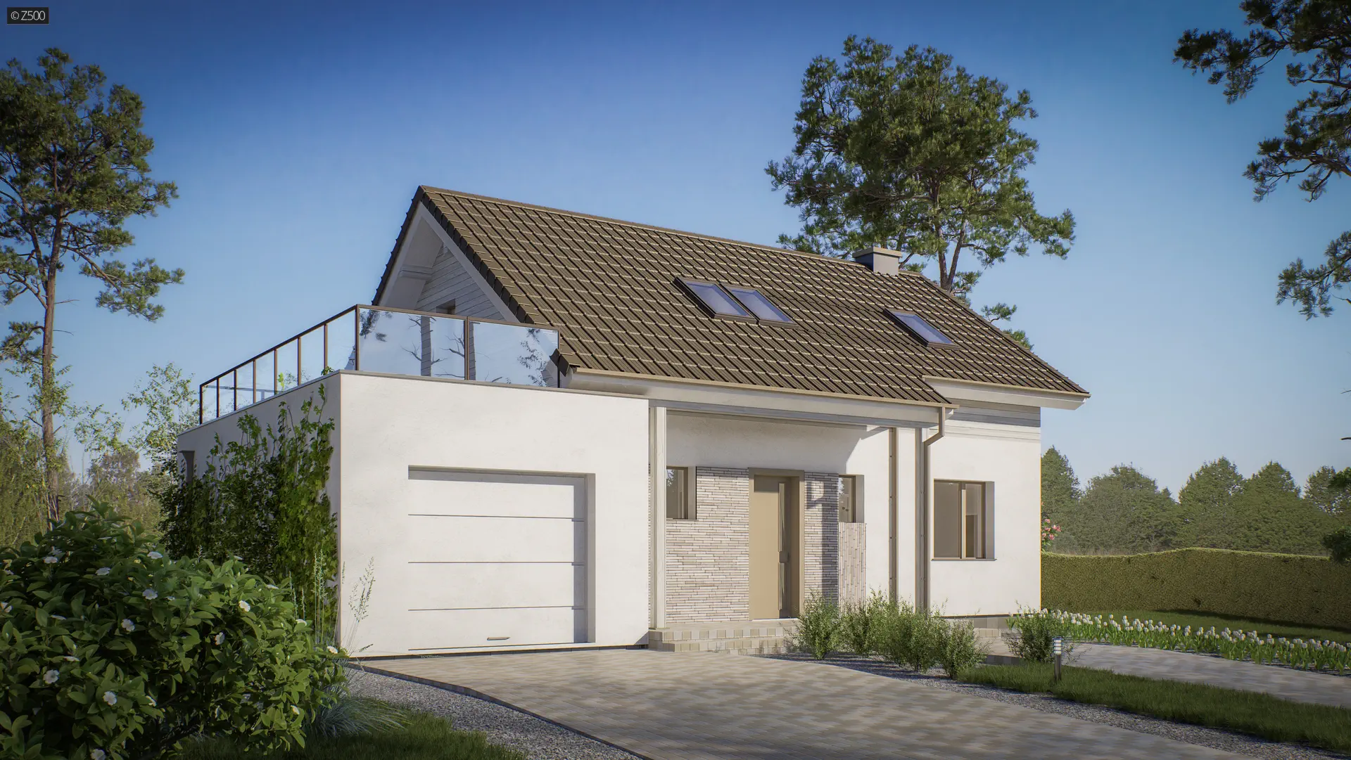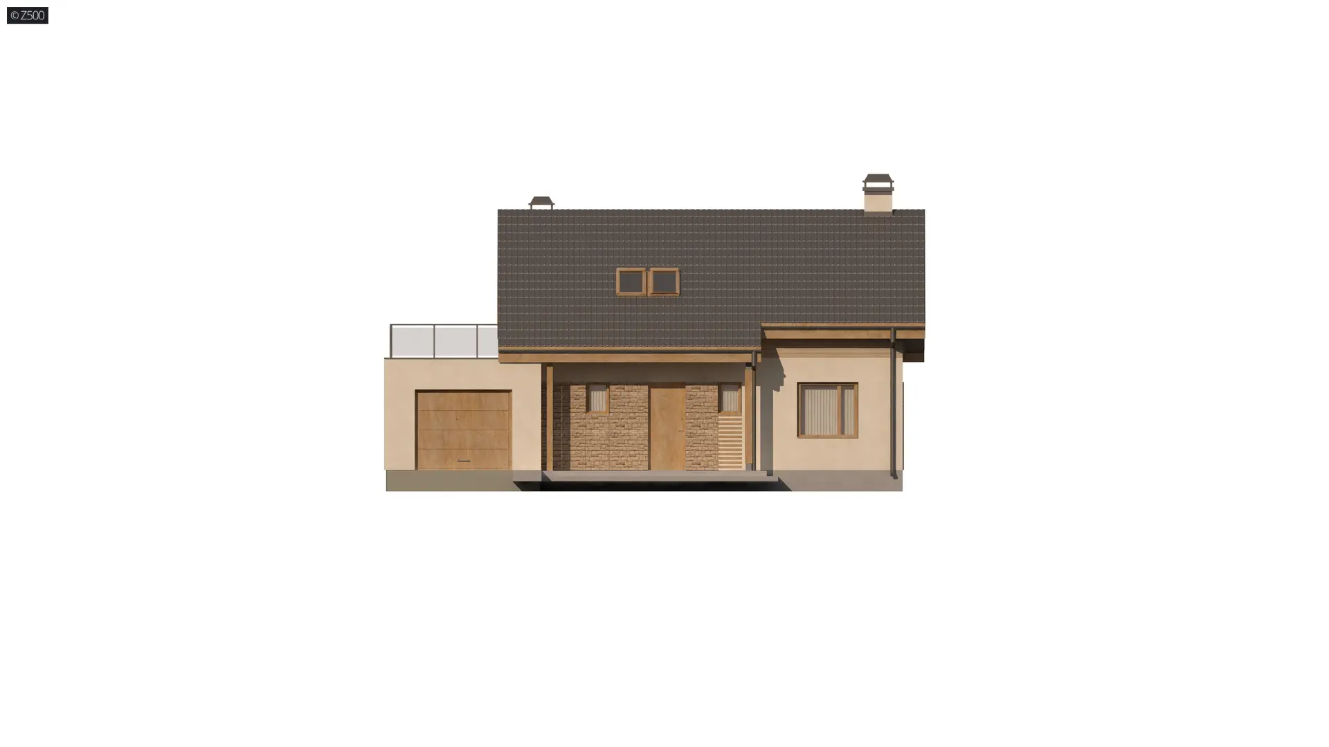 Wariant projektu Z210 z garażem jednostanowiskowym i kotłownią z lewej strony oraz tarasem nad. Powiększona kuchnia, dodatkowe pomieszczenie gospodarcze na parterze-pralnia.