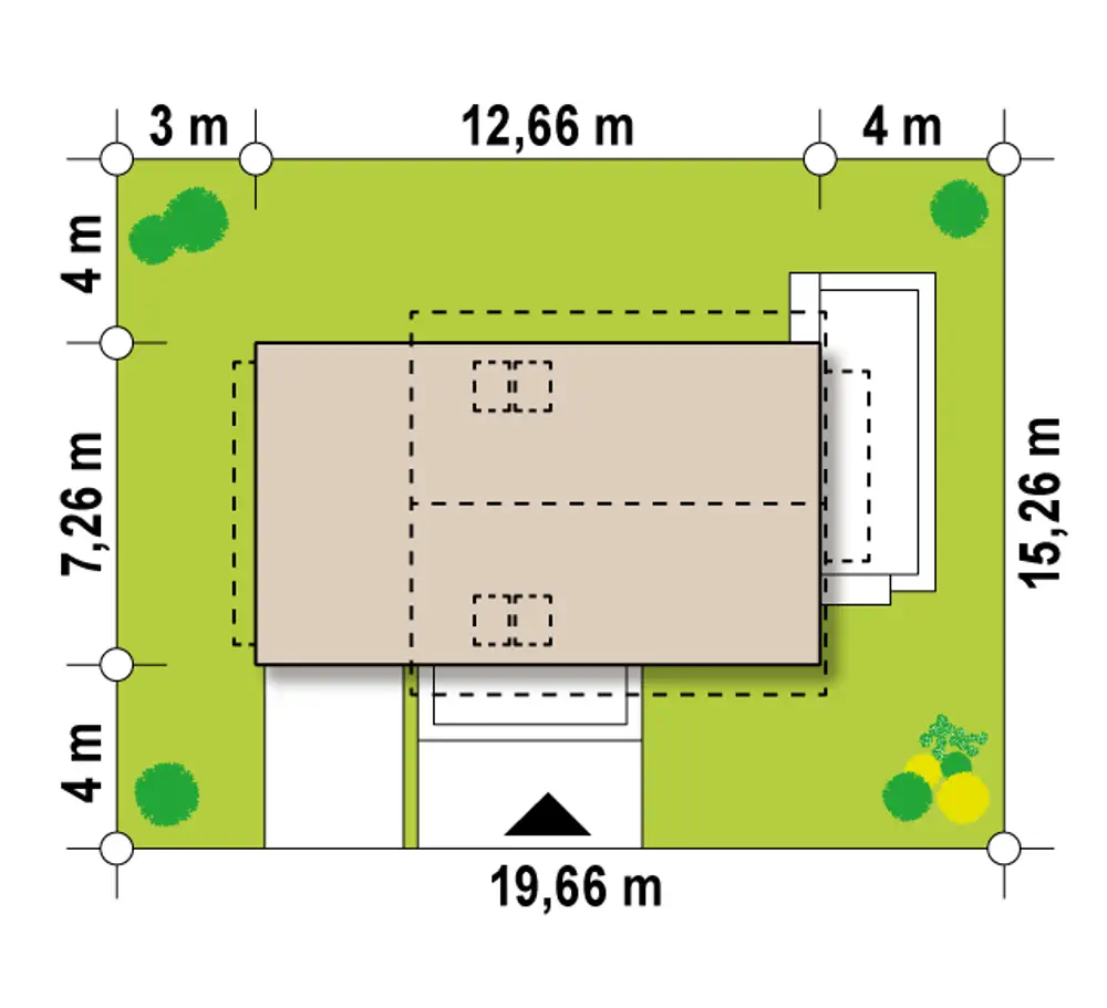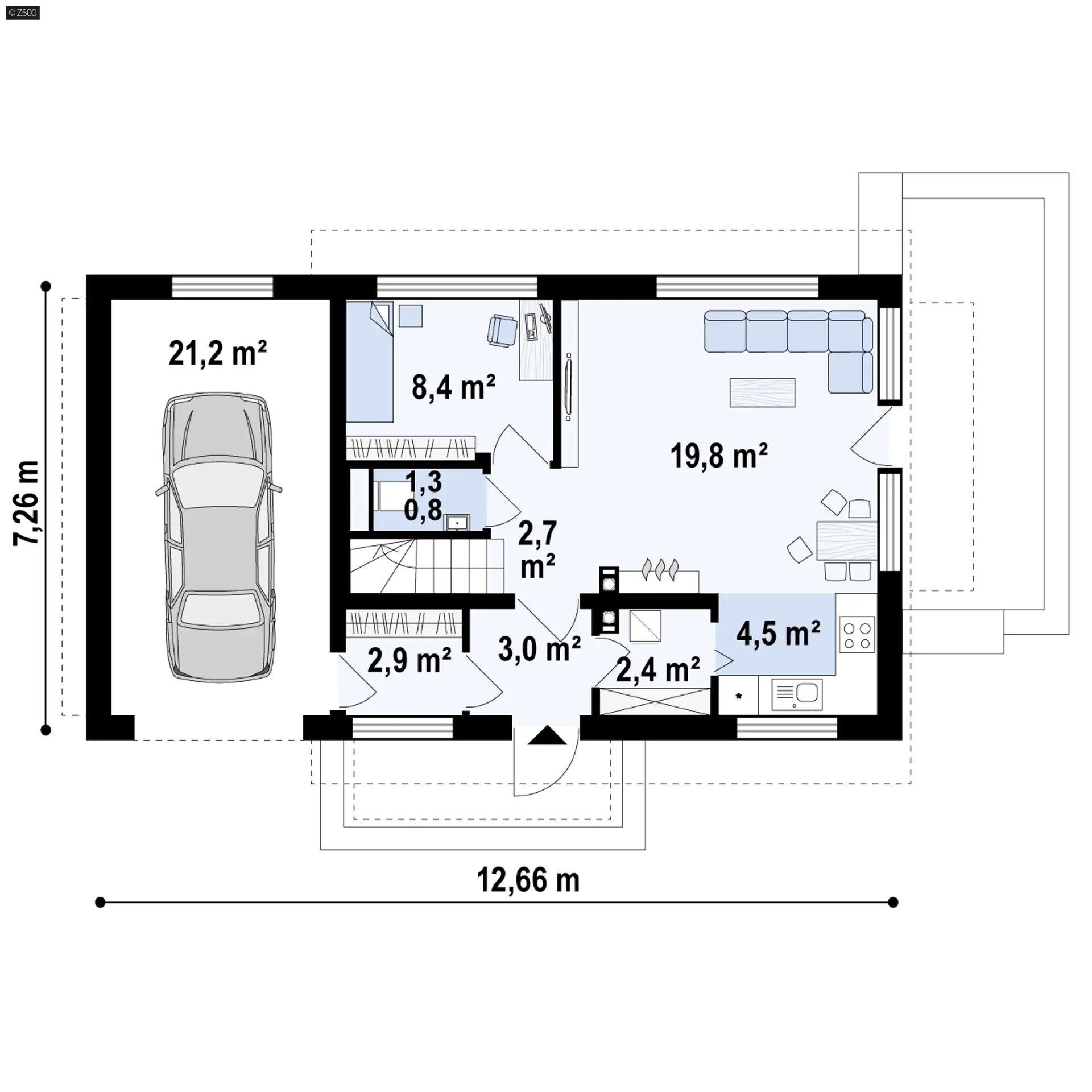 Jednostanowiskowy garaż idealnie współgra z resztą domu. Warto zauważyć, że garaż można przekształcić w dodatkowe pomieszczenia mieszkalne.