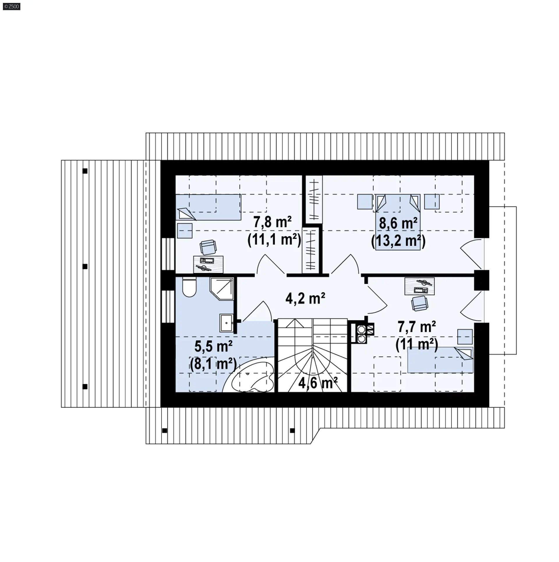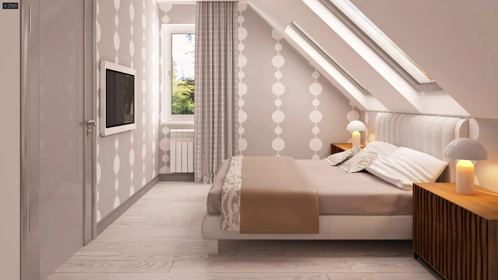 Zadaszone wejście prowadzi do wygodnej sieni z miejscem na sporą szafę. Strefa dzienna, to przede wszystkim jasny, przestronny salon. Otwarta kuchnia posiada praktyczną spiżarnię na wszystkie podręczne produkty. Szerokie wyjście balkonowe prowadzi na obszerny, częściowo zadaszony taras. Parter stanowi również wygodny pokój gościnny oraz funkcjonalna łazienka. Piętro to część nocna domu. Są tu trzy przestronne sypialnie oraz naturalnie doświetlona, wygodna łazienka.