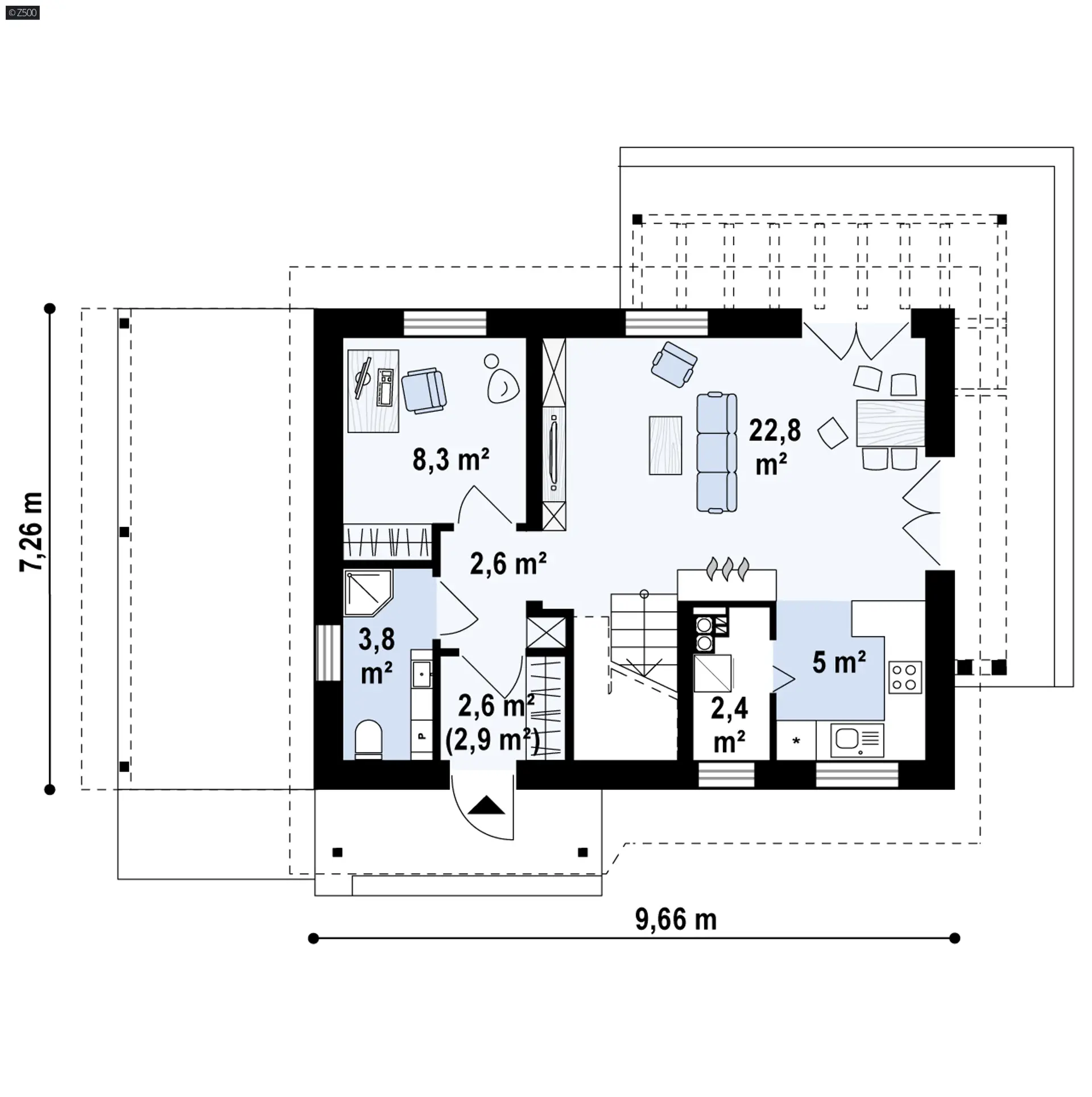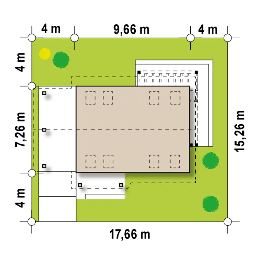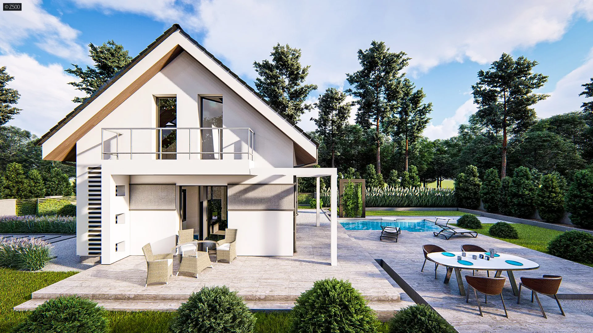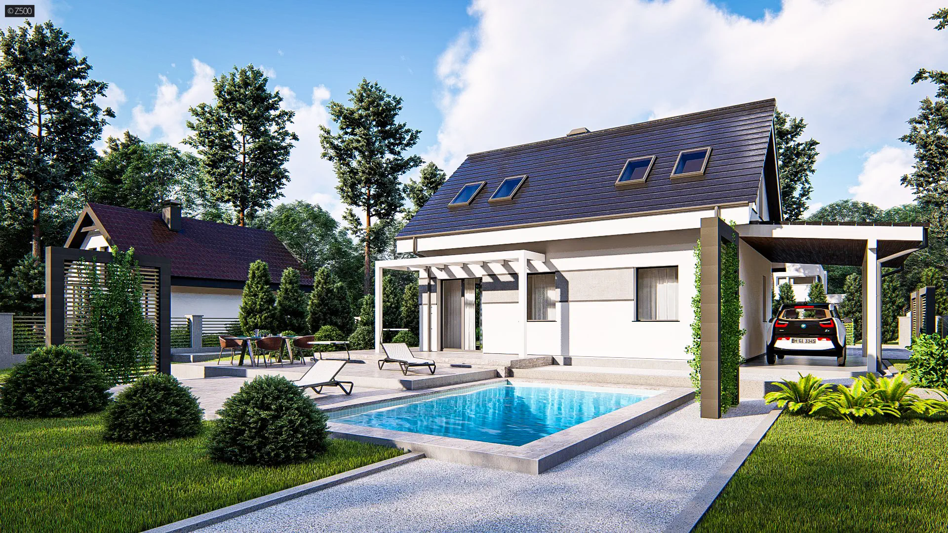 To niewielki i bardzo funkcjonalny projekt domu. Zgrabna, prosta bryła jest szybka i łatwa w budowie. Warto zwrócić uwagę również na funkcjonalną wiatę garażową.
