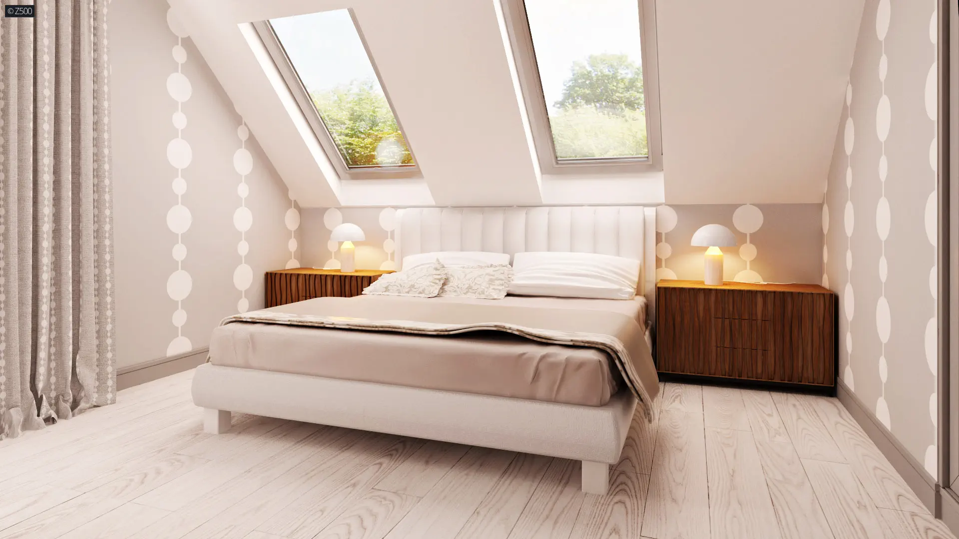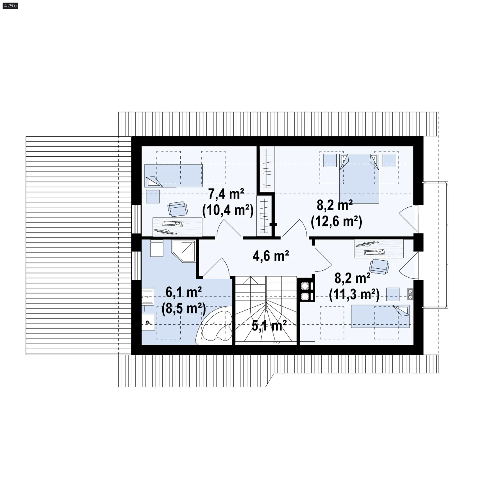 Zadaszone wejście prowadzi do wygodnej sieni z miejscem na sporą szafę. Strefa dzienna, to przede wszystkim jasny, przestronny salon. Otwarta kuchnia posiada praktyczną spiżarnię na wszystkie podręczne produkty. Szerokie wyjście balkonowe prowadzi na obszerny, częściowo zadaszony taras. Parter stanowi również wygodny gabinet oraz funkcjonalna łazienka. Piętro to część nocna domu. Są tu trzy przestronne sypialnie oraz naturalnie doświetlona, wygodna łazienka.