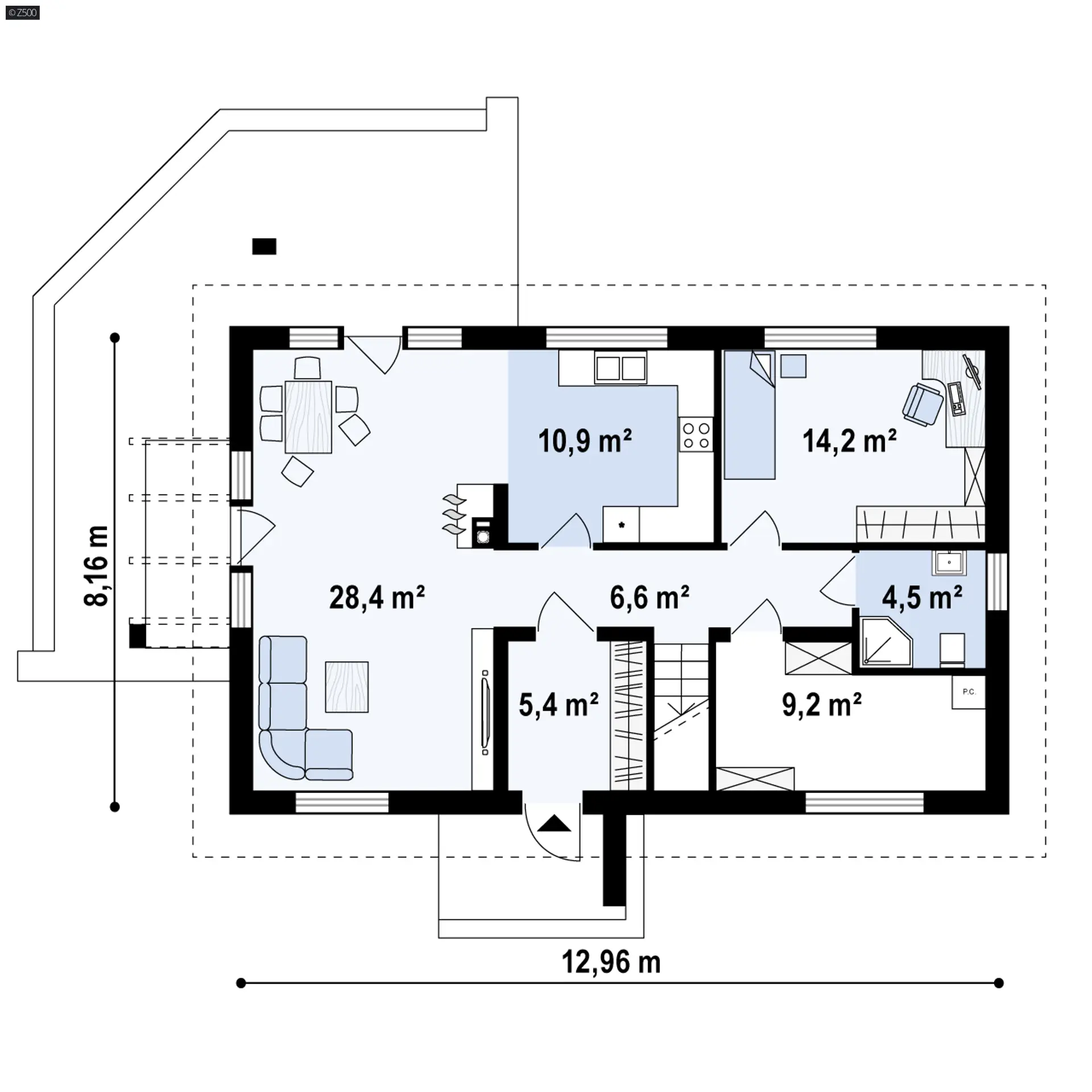 Na parterze znajduje się przestronny salon, który tworzy jedną przestrzeń z jadalnią i kuchnią. W prawej części budynku zlokalizowano gabinet, łazienkę z miejscem na prysznic oraz duże pomieszczenie gospodarcze. Na piętrze umieszczone są dwa pokoje dla dzieci, dużą łazienkę oraz przestronną sypialnie dla rodziców z osobną toaletą.