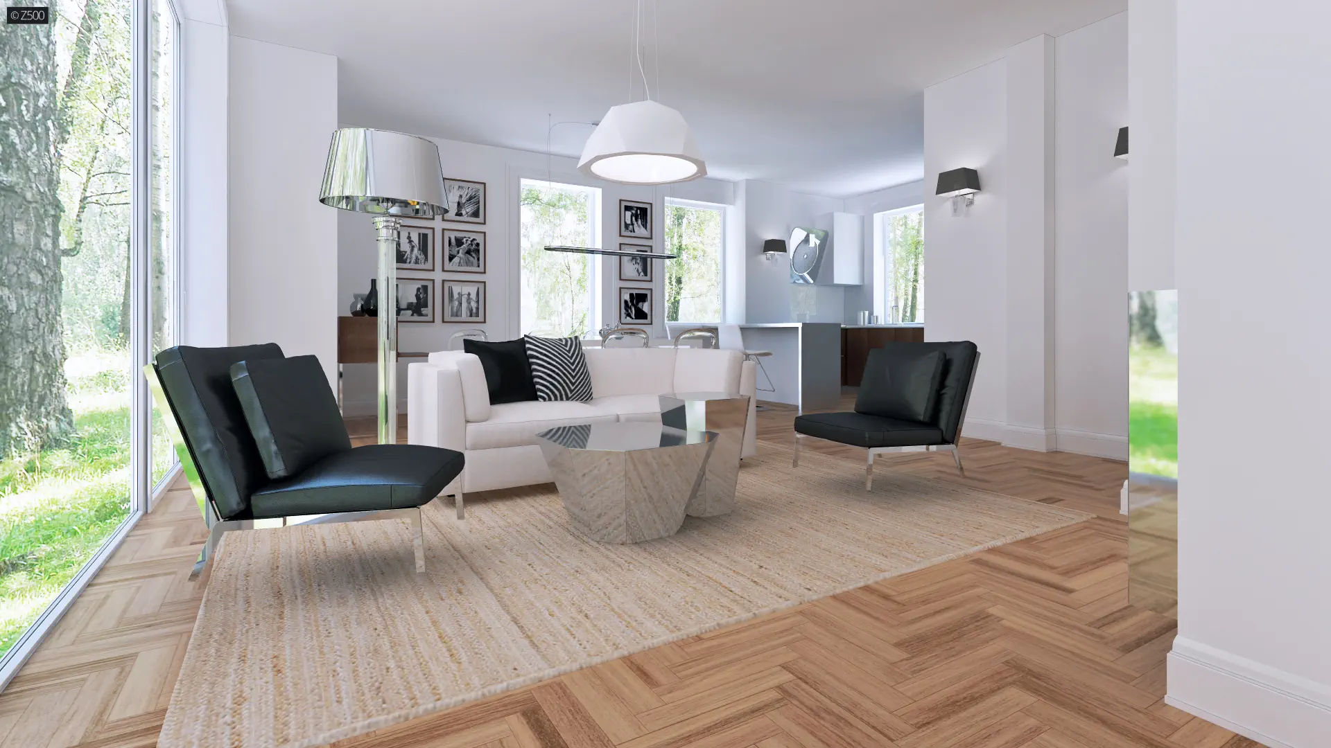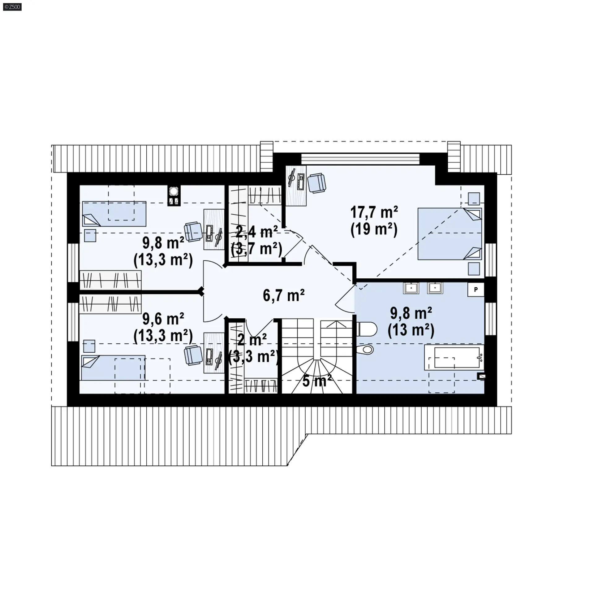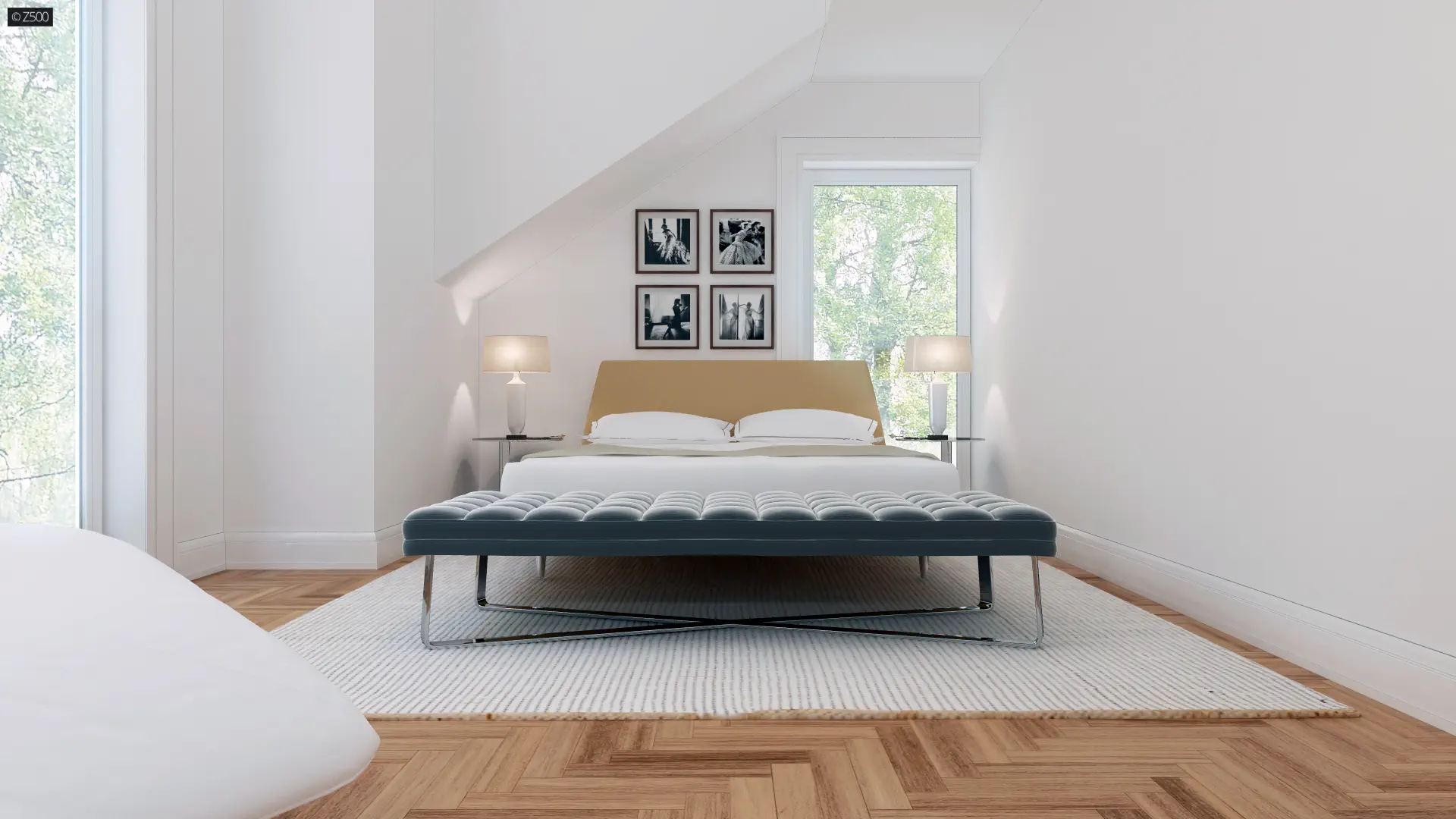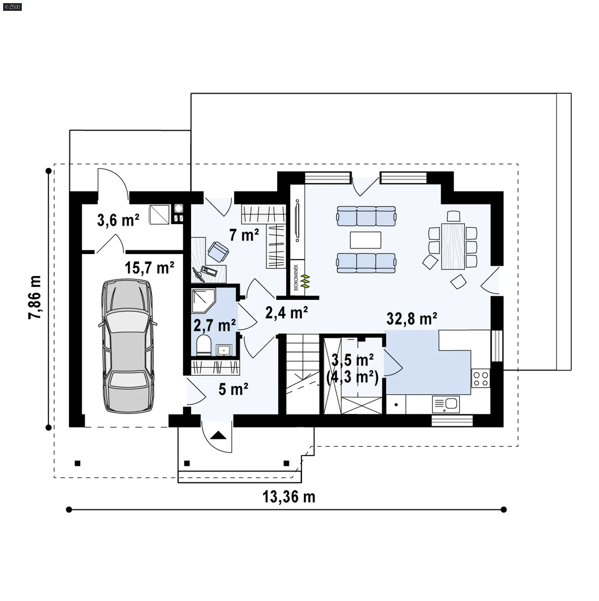 Główną częścią domu jest obszerny salon połączony jednoprzestrzennie z kuchnią. Duże powierzchnie przeszkleń sprawiają, że pomieszczenia te są jasne, naturalnie doświetlone i otwarte na ogród. W lewej części budynku zlokalizowano gabinet, łazienkę z miejscem na prysznic oraz sień, z której jest możliwość bezpośredniego przejścia do garażu. Na jego tyłach znajduje się pomieszczenie gospodarcze z dostępem od zewnątrz. Poddasze to strefa wypoczynkowa domu z trzema wygodnymi sypialniami, garderobą oraz dużą łazienką z miejscem na wannę.