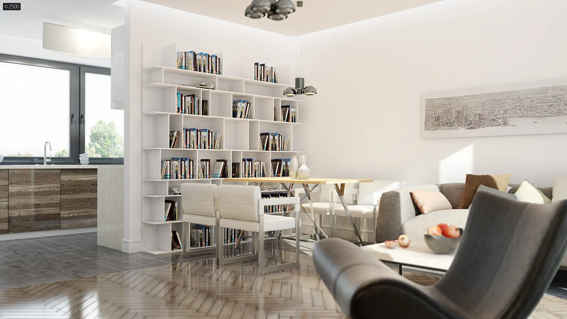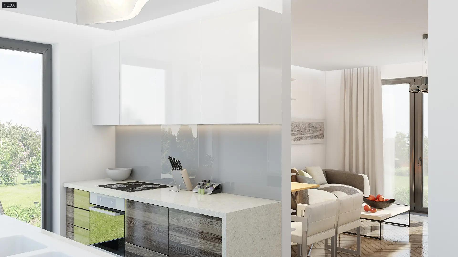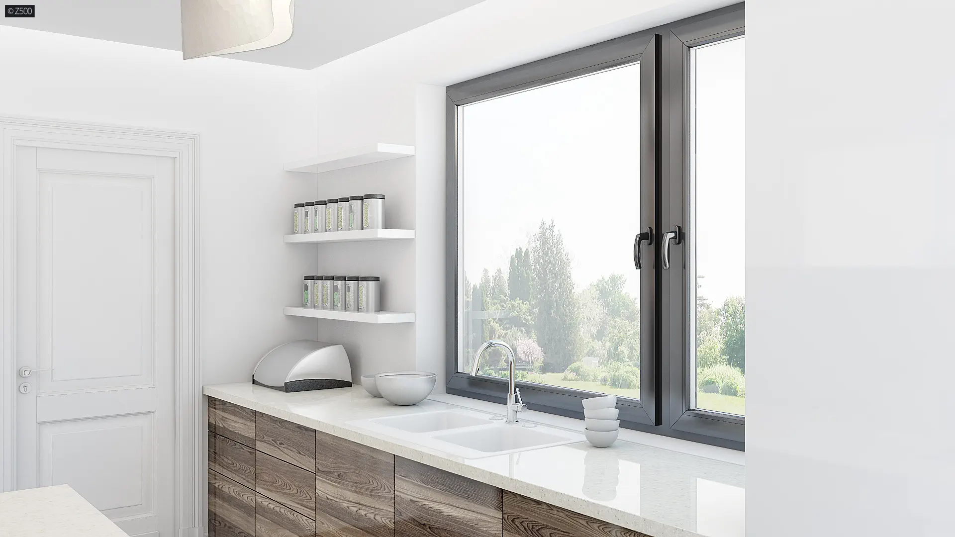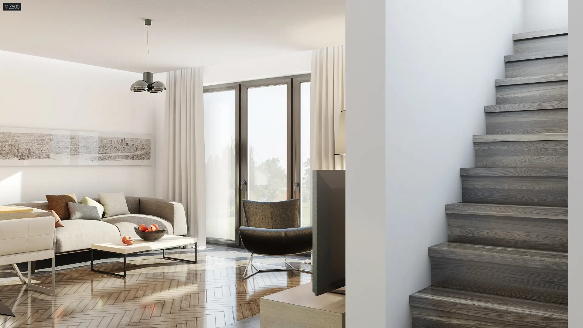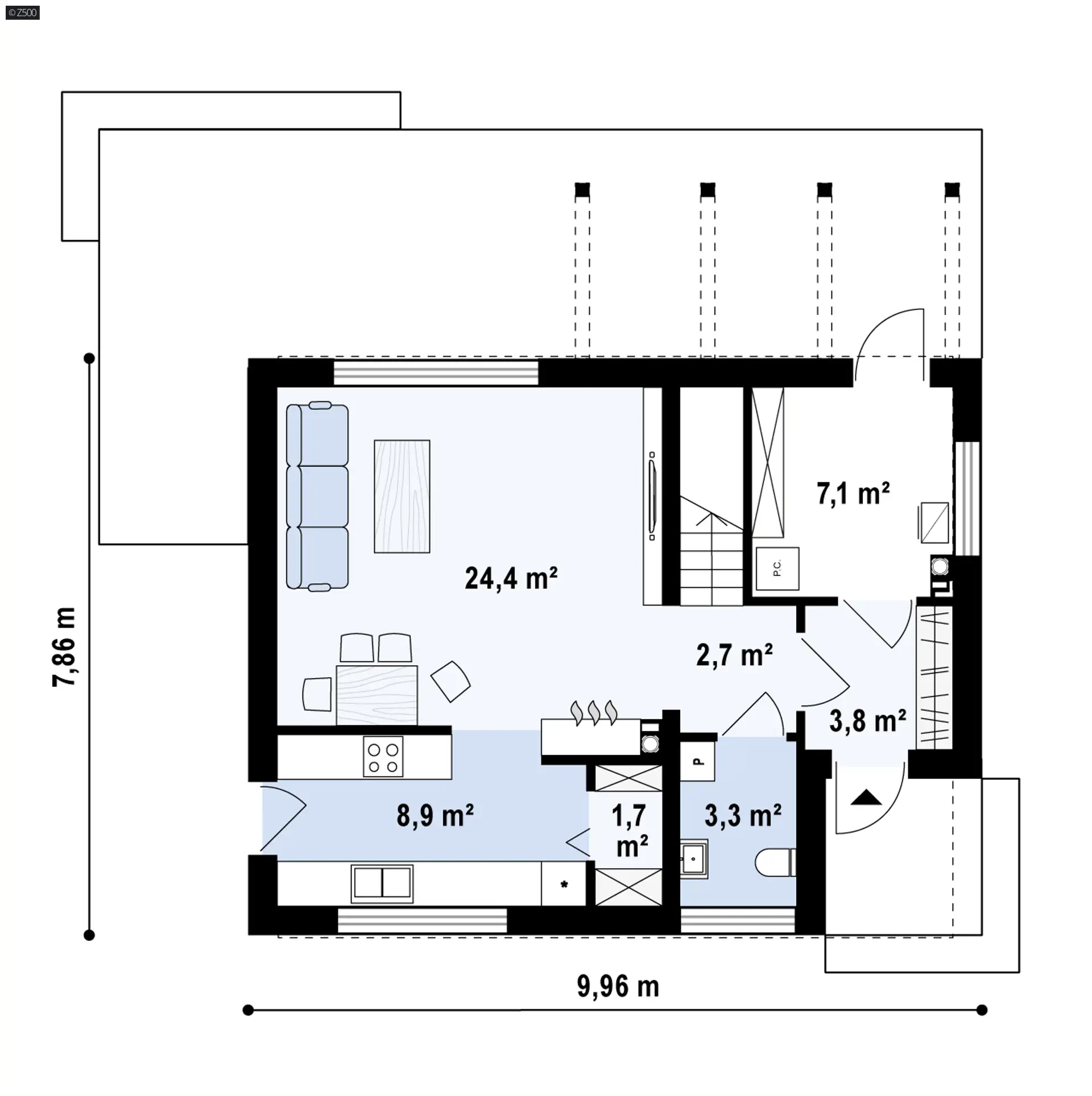 Energooszczędny dom z dużym pomieszczeniem gospodarczym i wygodnymi schodami.