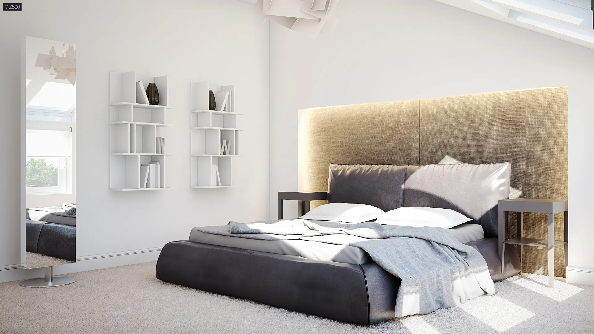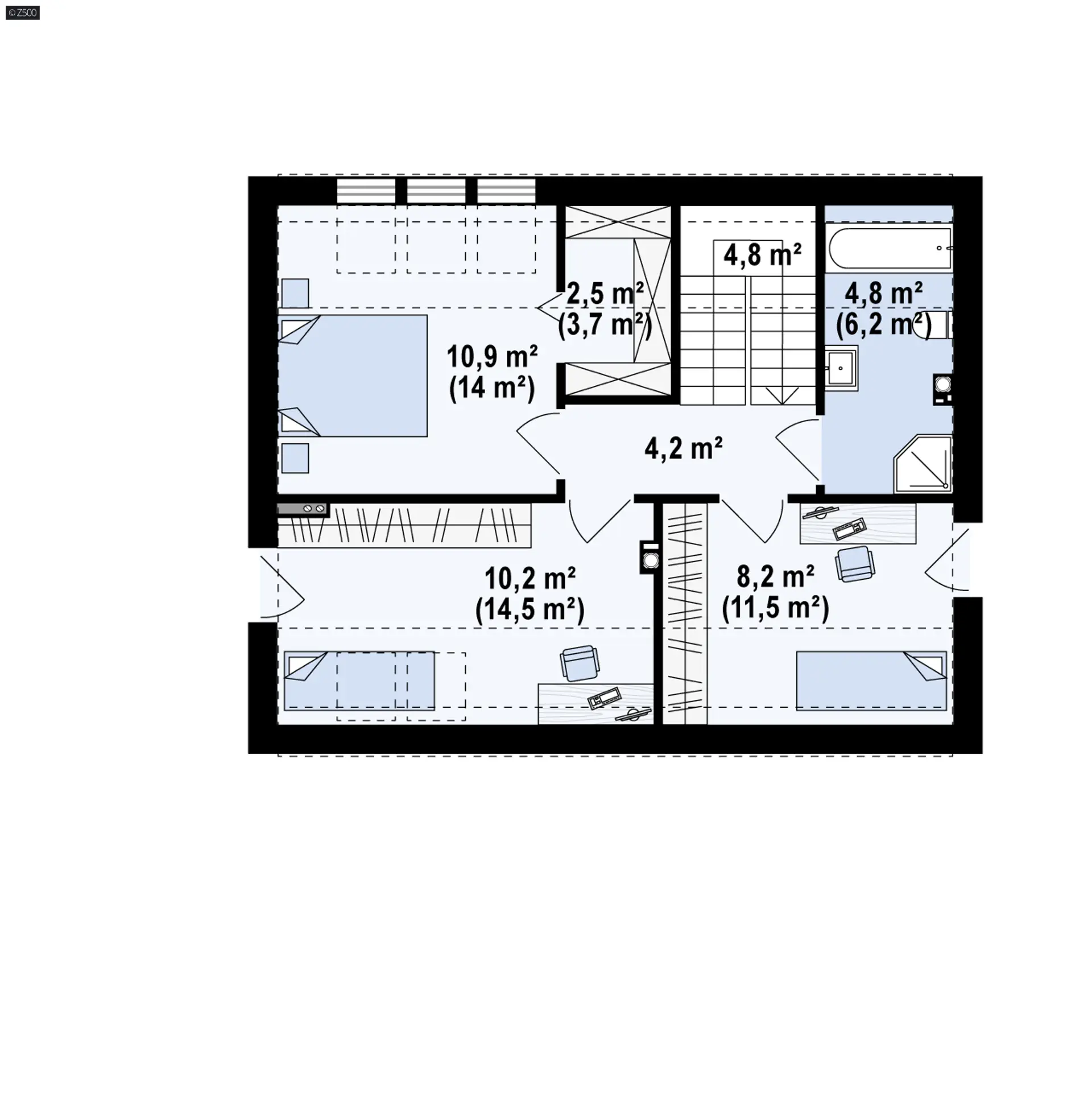 Znajdują się tu trzy sypialnie oraz wspólna łazienka. Główna sypialnia posiada wydzielona garderobę oraz nowoczesne okna dachowe, które zapewnią wspaniały widok na ogród. Dodatkowym atutem jest ścianka kolankowa o wysokości h=120 cm, co podnosi komfort użytkowania poddasza.