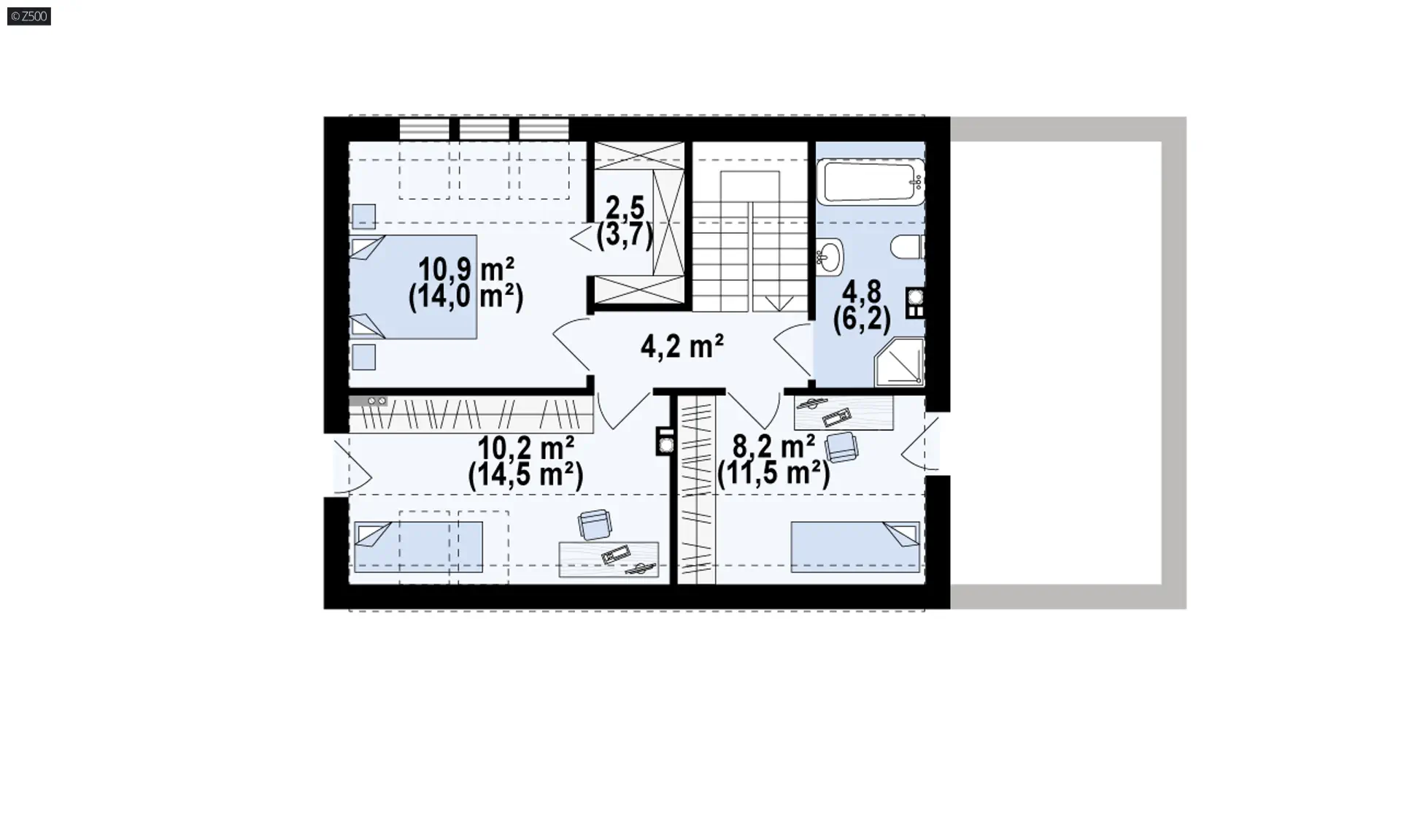Znajdują się tu trzy sypialnie oraz wspólna łazienka. Główna sypialnia posiada wydzielona garderobę oraz nowoczesne okna dachowe, które zapewnią wspaniały widok na ogród. Dodatkowym atutem jest ścianka kolankowa o wysokości h=120cm, co podniosi komfort użytkowania poddasza.