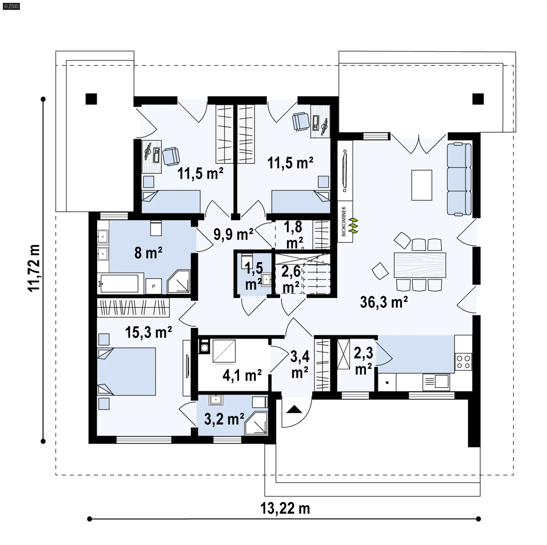Zaletą tego domu jest wydzielenie niezależnych stref: dziennej i nocnej. Duży, jasny salon będzie ulubionym miejscem odpoczynku wszystkich domowników, posiada bezpośrednie wyjście na taras. Kuchnia zaprojektowana w kompozycji otwartej dodatkowo została zbogacona o spiżarnię.