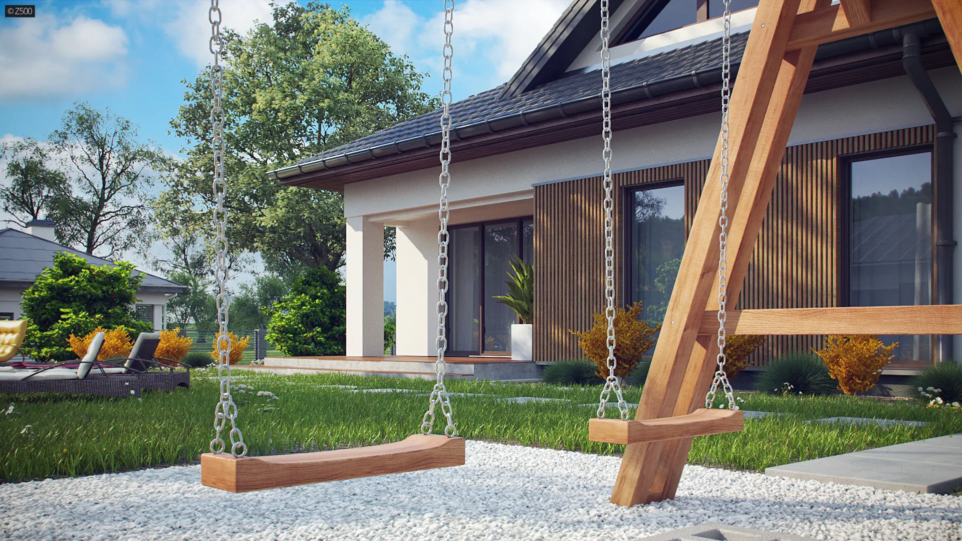 Z230 to praktyczny i bardzo przestrony dom z możliwością zaadoptowania poddasza. Bryła ujmuje swą dokładnością i dbałością o detale. Zgrabny wykusz i delikatny podcień podkreślają przytulny wyraz domu.