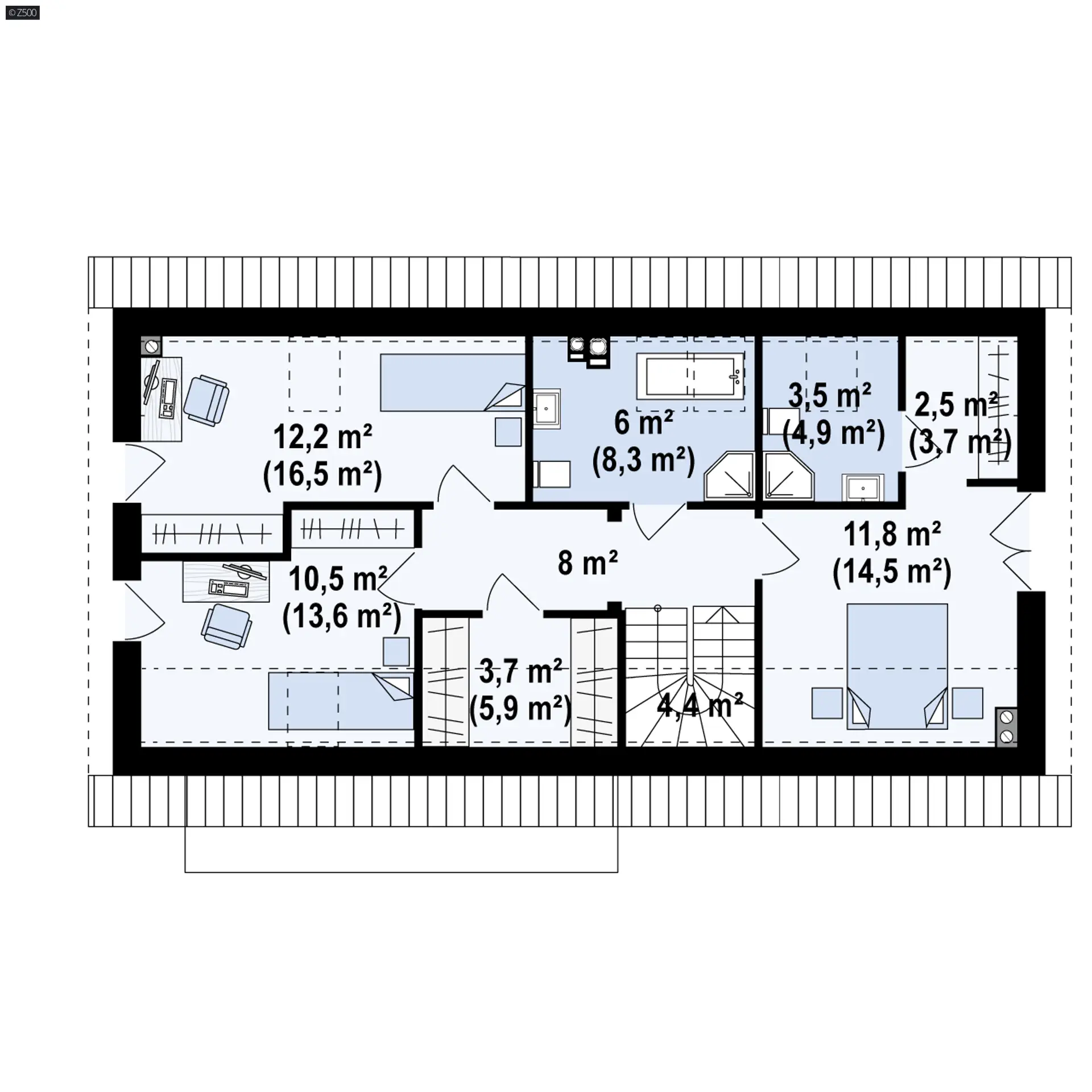 Kuchnię ze spiżarnią można wydzielić całkowicie np. przesuwnymi drzwiami z matowym szkłem, dzięki czemu spora ilość światła z salonu i jadalni wpłynie do jej wnętrza. Poddasze mieści 3 sypialnie z czego jedna master bedroom może posłużyć jako sypialnia dla rodziców z własną łazienka i garderobą.