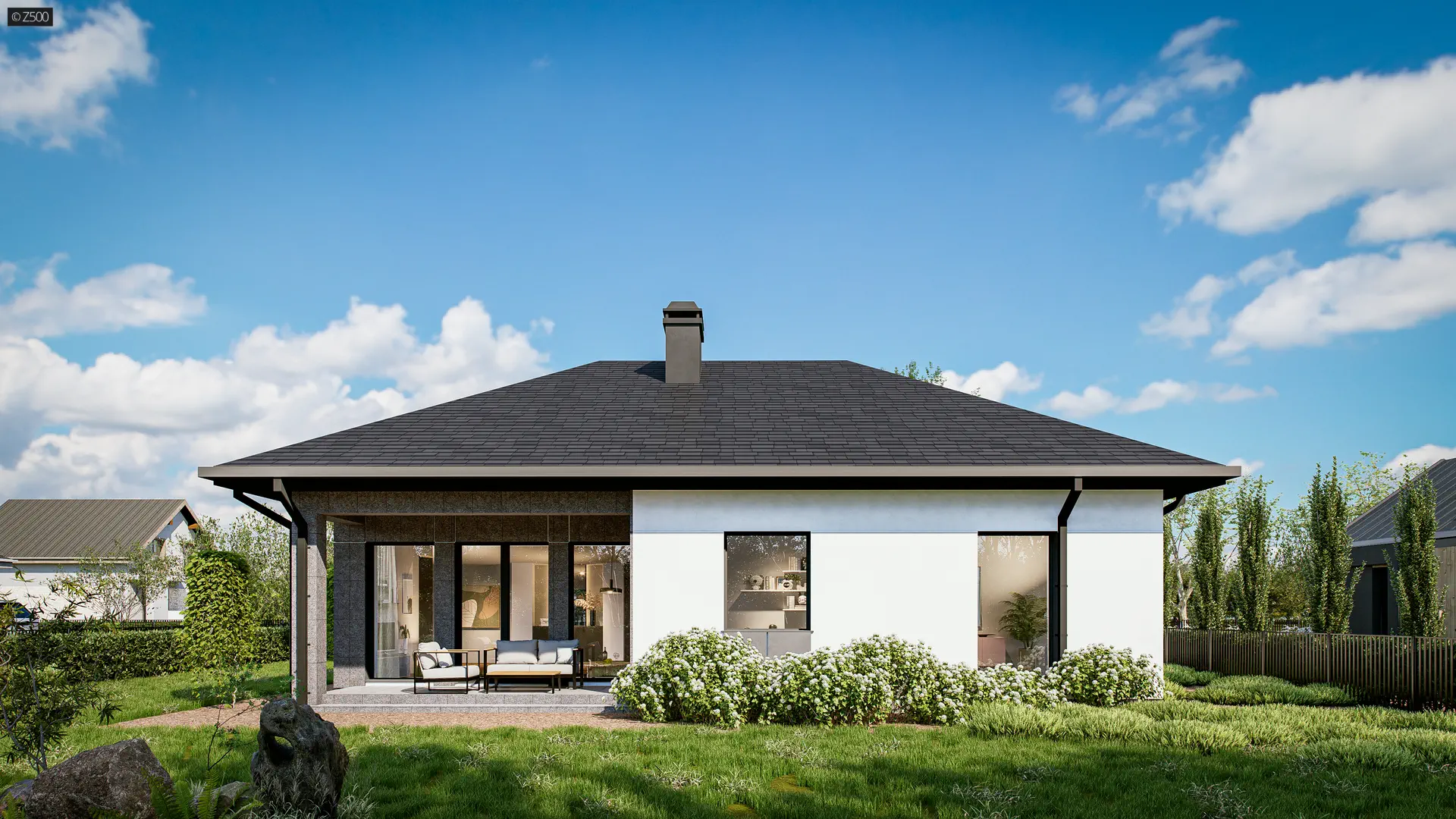Funkcjonalny dom parterowy z kopertowym dachem, trzema pokojami i tarasem