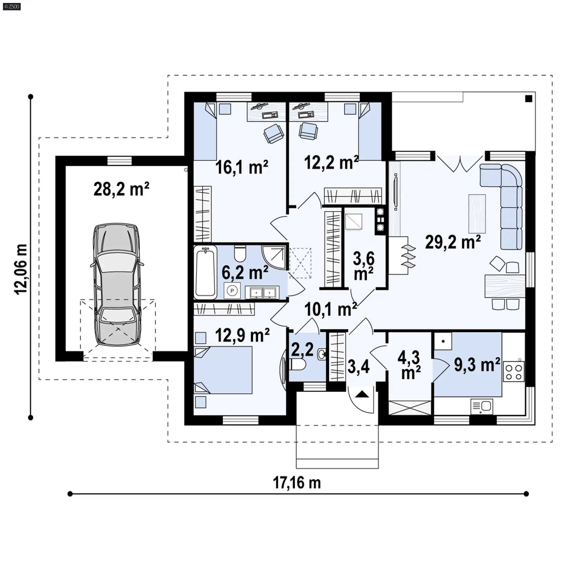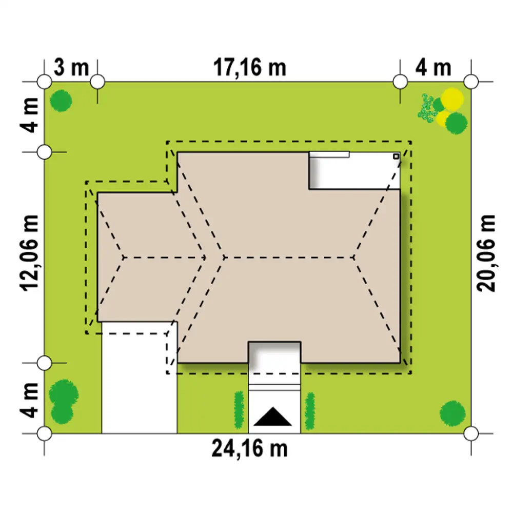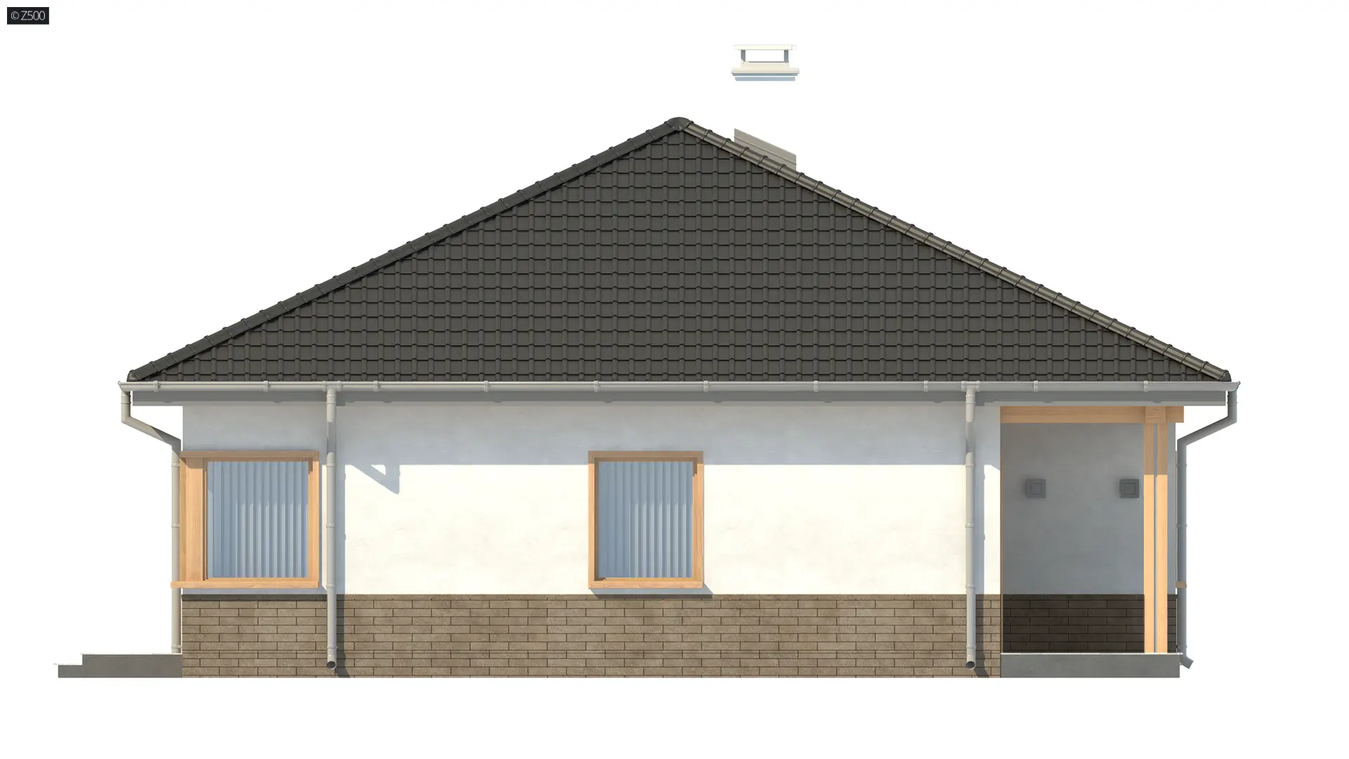 Projekt domu Z24 GL to przestronny dom parterowy z trzema pokojami, dużym garażem i dachem kopertowym. W układzie przewidziano 3 sypialnie, 2 łazienki, salon 29,21 m², garaż jednostanowiskowy. Minimalna działka: 24,16 m × 20,06 m.