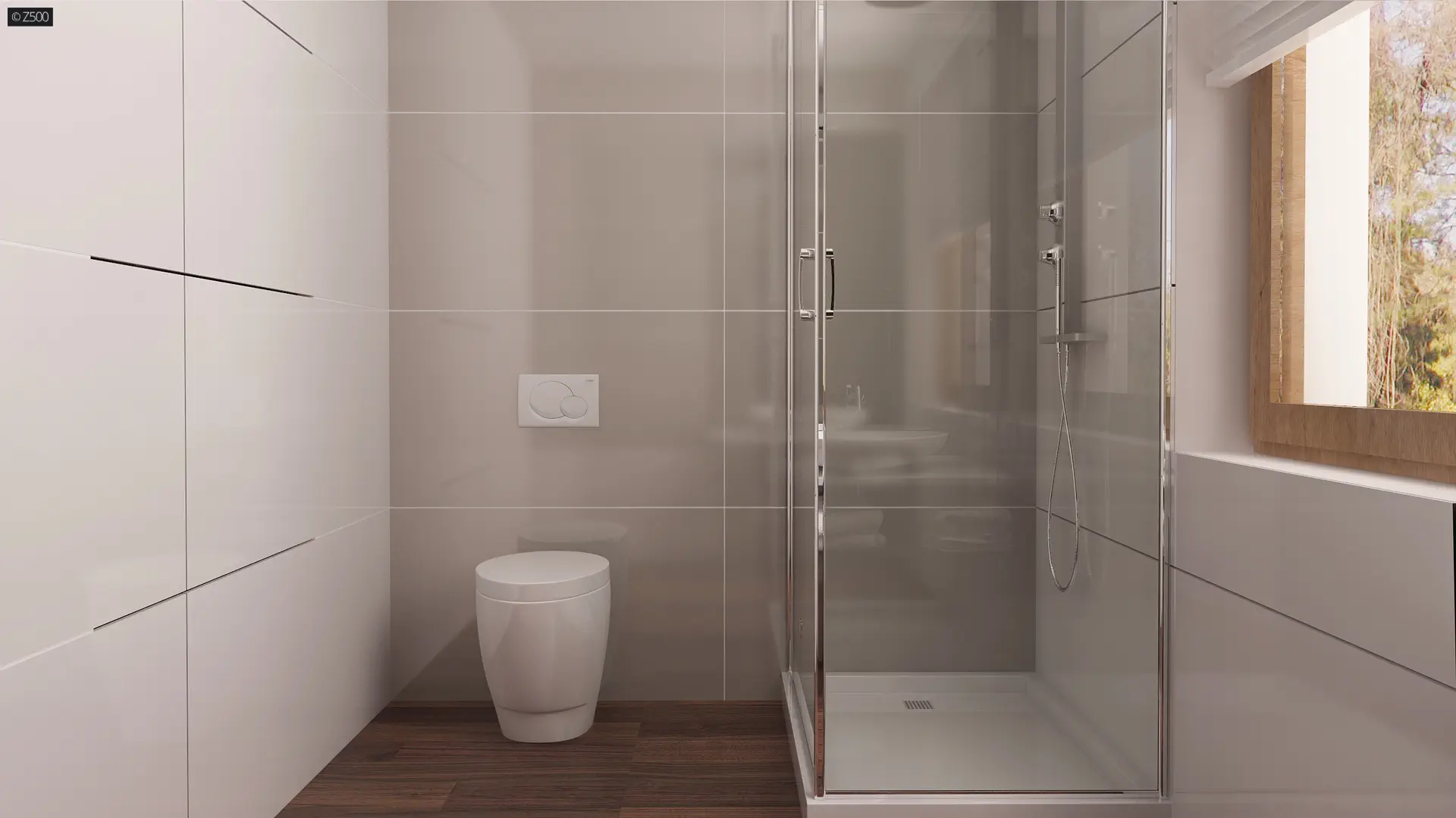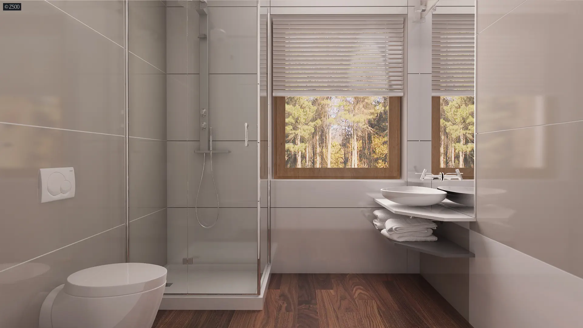Na parterze umieszczono również pokój, gabinet oraz łazienkę z prysznicem. Dzięki takiemu układowi pomieszczeń goście nie będą korzystać z piętra, co pozwoli na zachowanie intymności domownikom. Poddasze to część nocna domu. Znajdują się tu trzy obszerne pokoje, łazienka z wydzieloną pralnią oraz użyteczna garderoba. Zaletą jest również to, iż główna sypialnia posiada swoją własną łazienkę.
