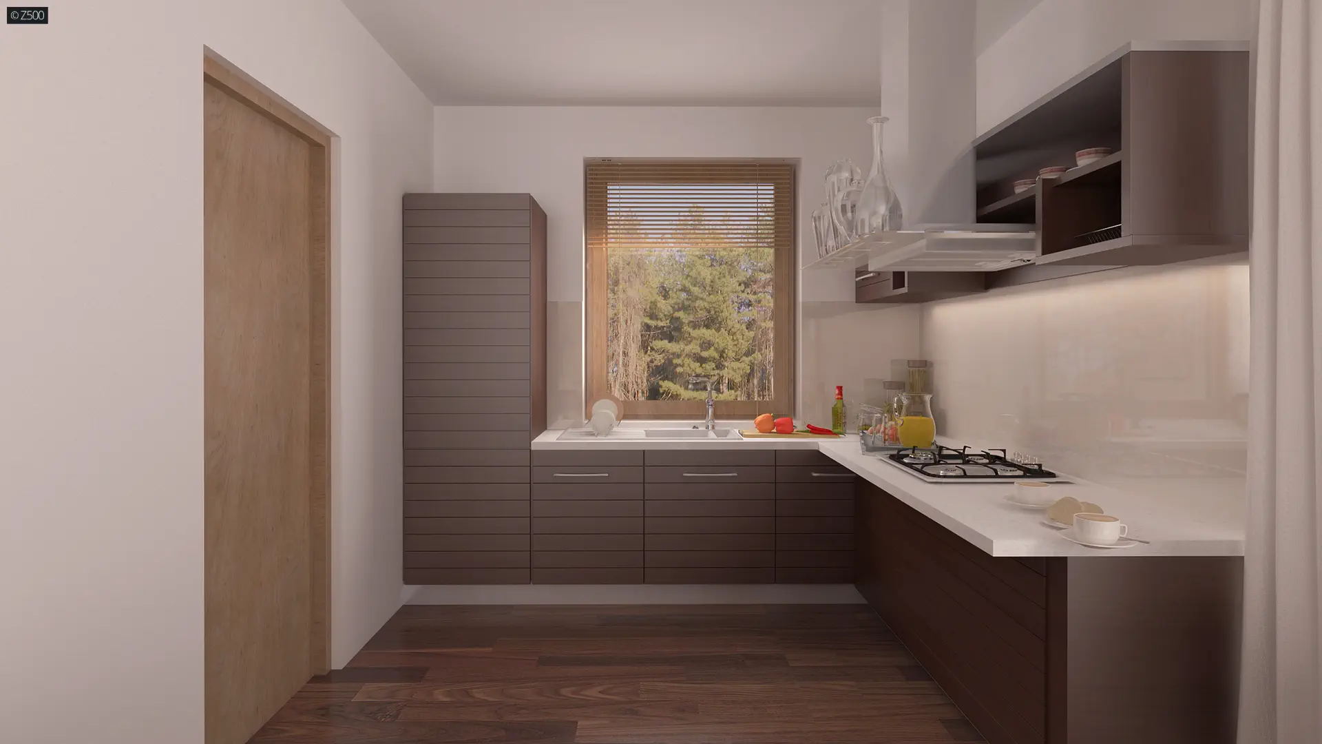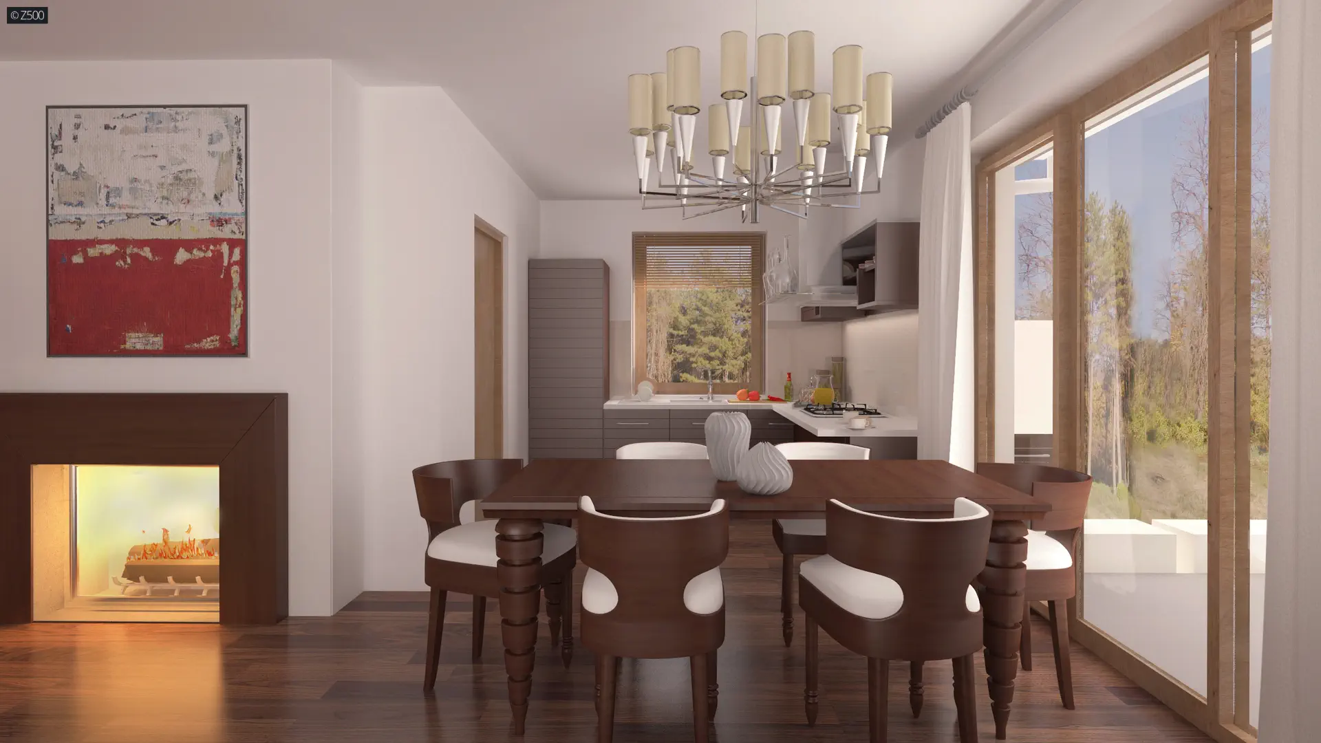 Przez zadaszone wejście wchodzimy do sieni, z której jest bezpośrednie przejście do spiżarni oraz holu. W lewej części domu zlokalizowano salon, który połączony jest jednoprzestrzennie z kuchnią. Duże przeszklenia powodują, że część dzienna jest dobrze doświetlona, a podwójne drzwi balkonowe prowadzą na częściowo zadaszony taras.