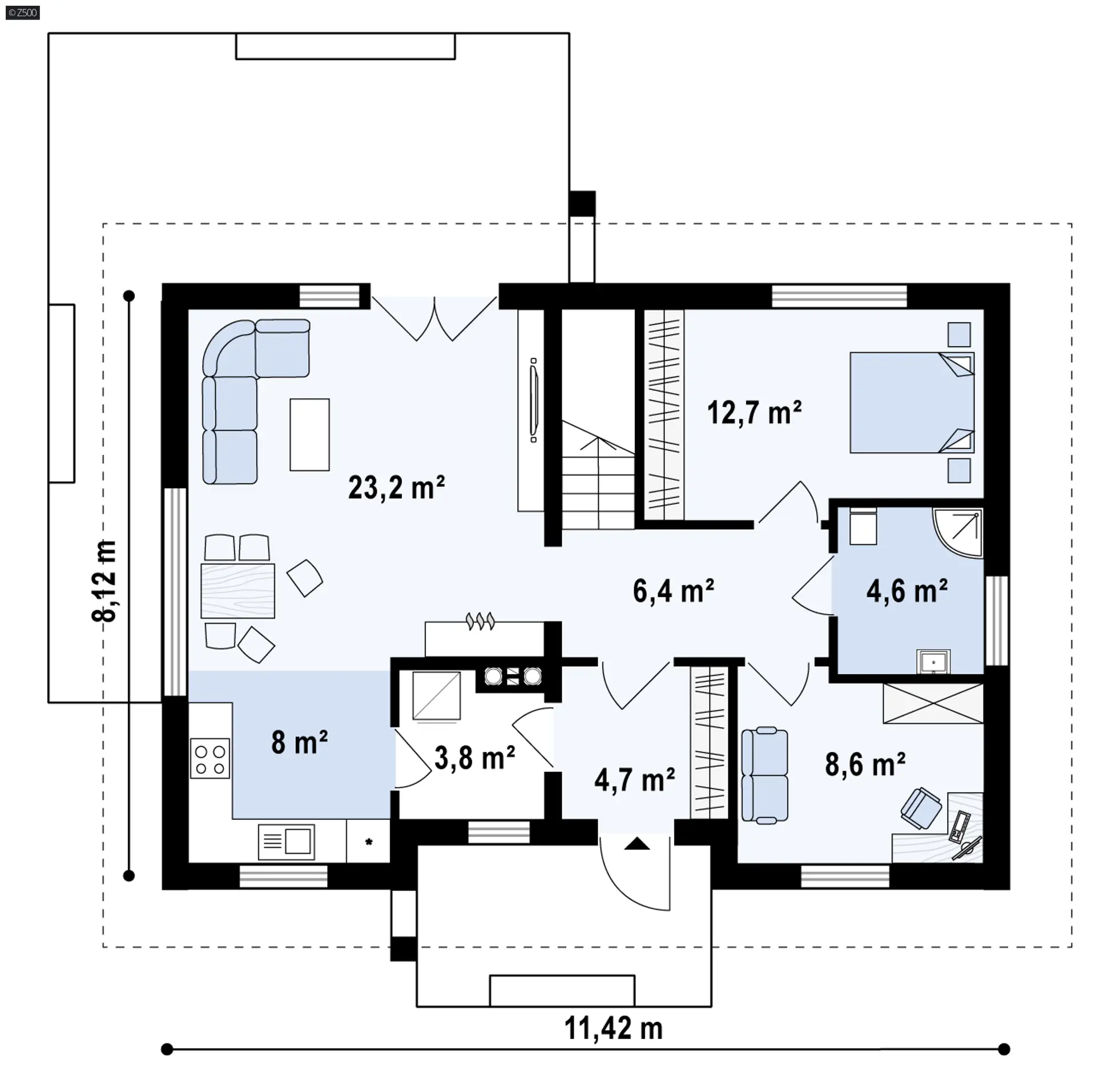Z244 to wygodny dom o prostej bryle z dwuspadowy dachem. Zaletą tego projektu jest w pełni użytkowe poddasze stanowiące jego część wypoczynkową.