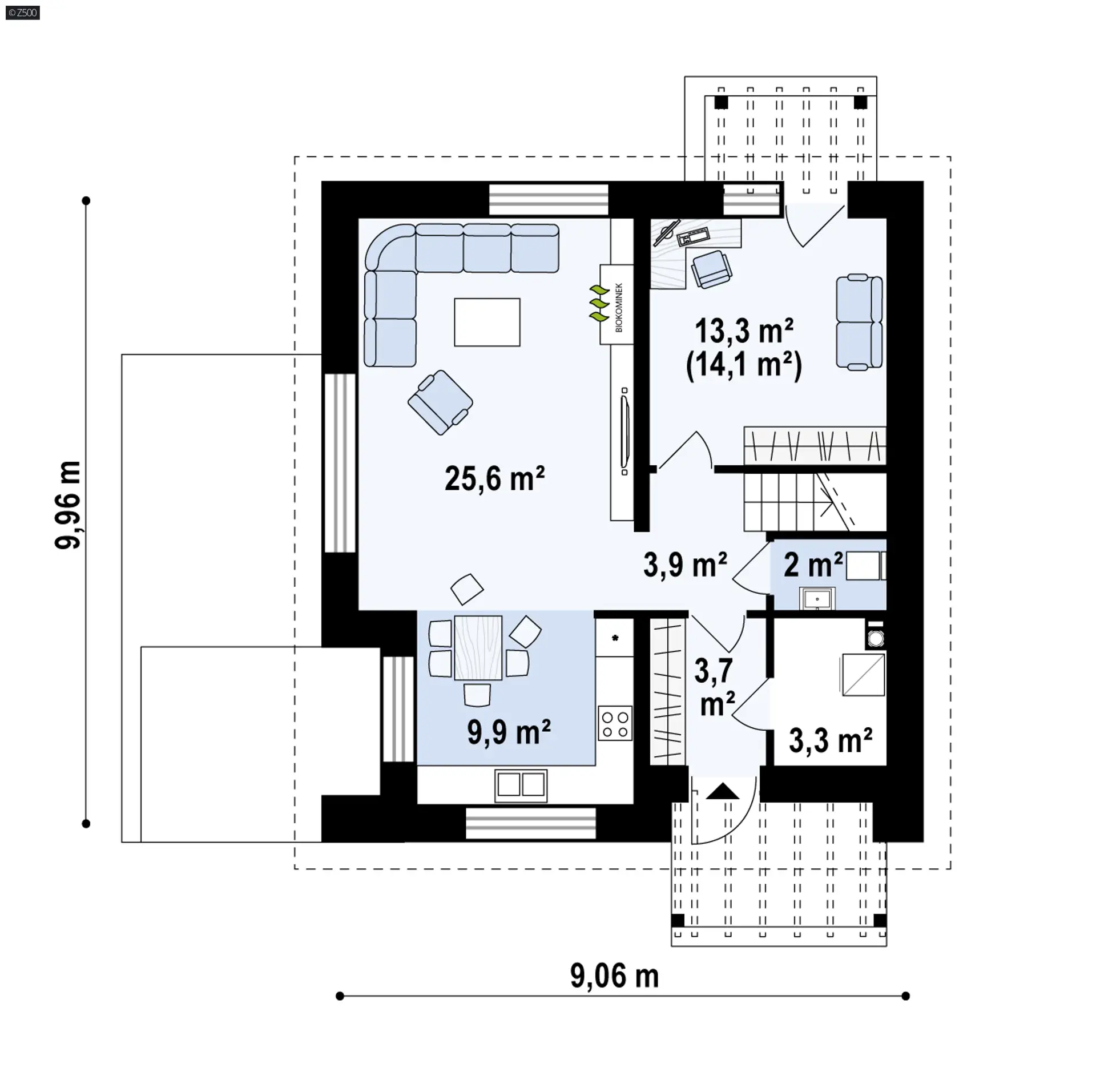 Z248 z poddaszem użytkowym, przeznaczony dla 3-4-osobowej rodziny. Strefa wejściowa czaruje swoją symetrią i elegancją. Zgrabną bryłę budynku otula szykowna elewacja.
