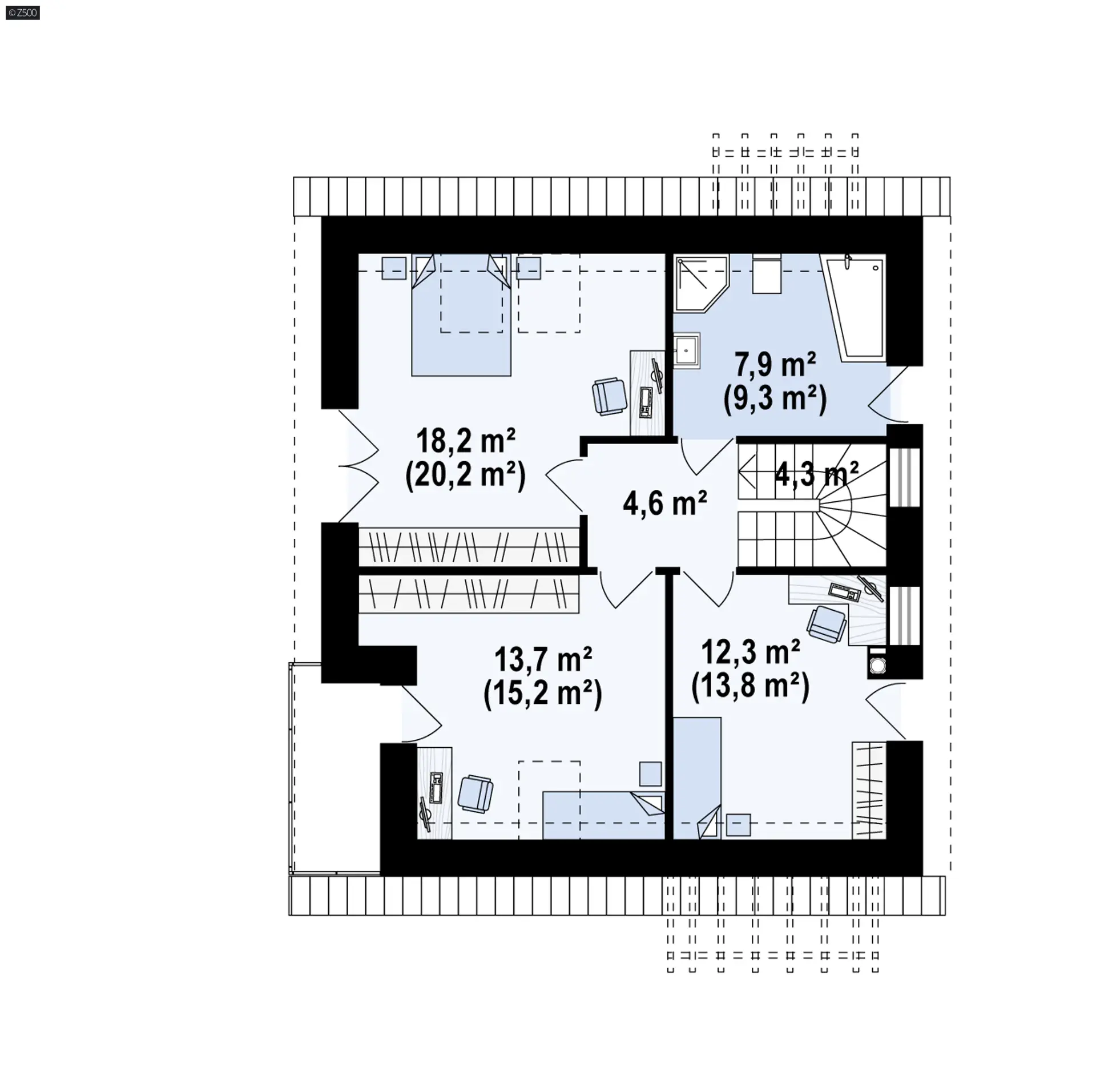 Strefa nocna na poddaszu to dwie sypialnie oraz komfortowa sypialnia dla dwojga rodziców, z dostępem do wspólnej łazienki. Z248 to imponująca przestrzeń możliwości – z zewnątrz czaruje nowoczesnym wdziękiem, a wewnątrz uwodzi imponującym układem pomieszczeń. Na szczególną uwagę zasługuje duże przeszklenie, dzięki której do wnętrza domu swobodnie wpada naturalne światło oraz dobra, zielona energia ogrodu.