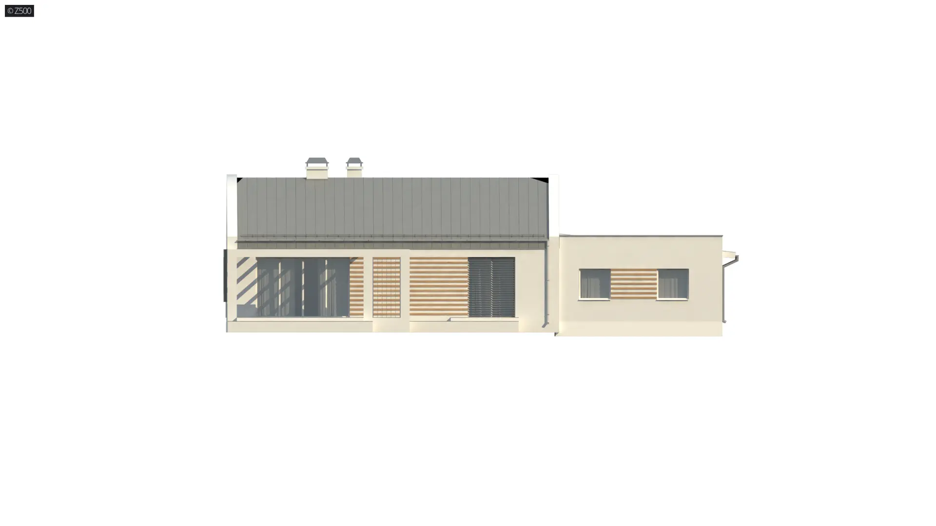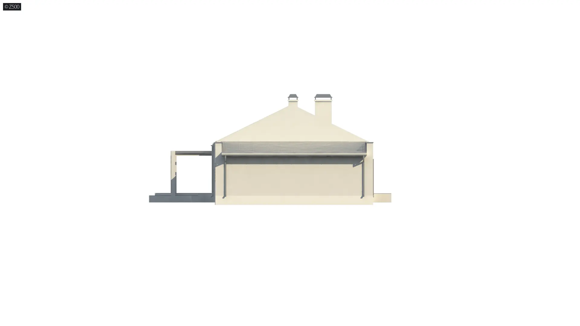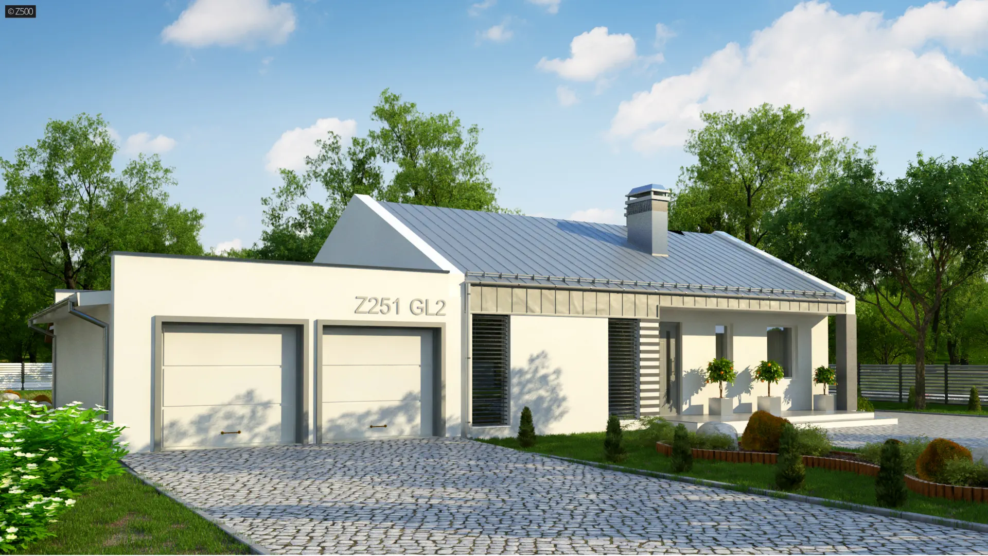 Projekt domu Z251 GL2 to wariant z garażem 2-stanowiskowym.. W układzie przewidziano 2 sypialnie, 1 łazienka, salon 29,7 m², garaż na 2 auta. Minimalna działka: 26,14 m × 17,84 m.