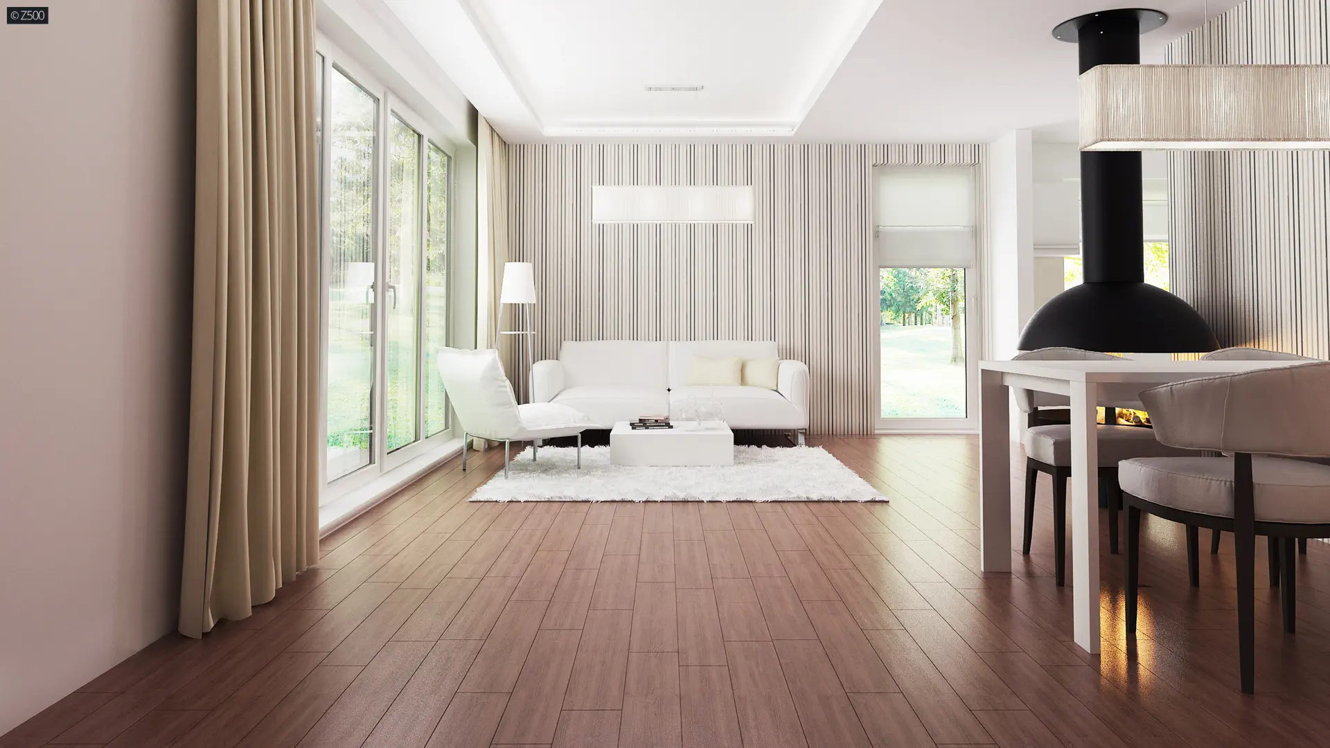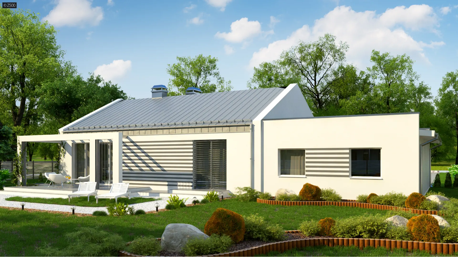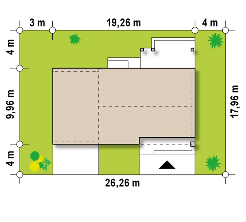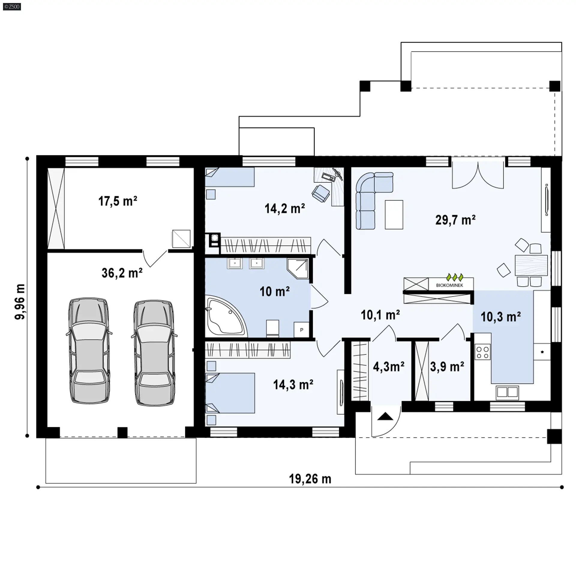 Projekt domu Z251 GL2 to wariant z garażem 2-stanowiskowym.. W układzie przewidziano 2 sypialnie, 1 łazienka, salon 29,7 m², garaż na 2 auta. Minimalna działka: 26,14 m × 17,84 m.