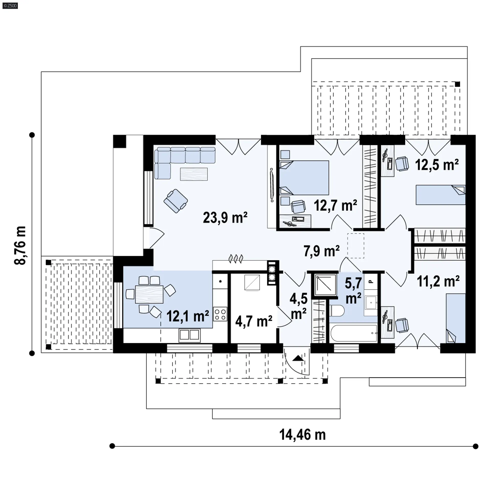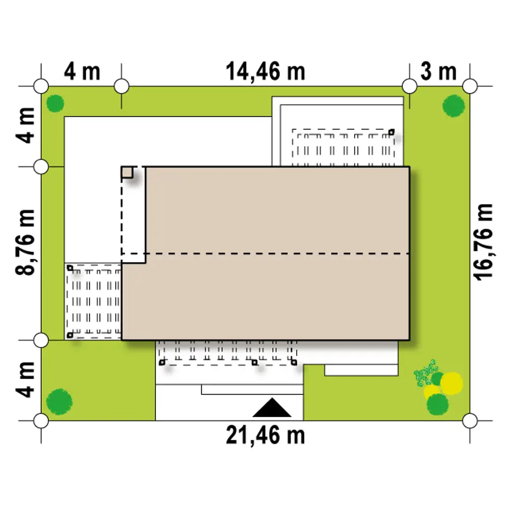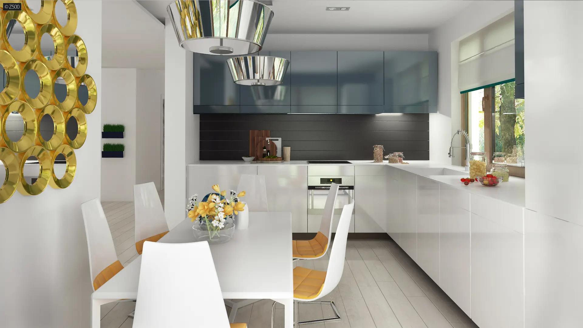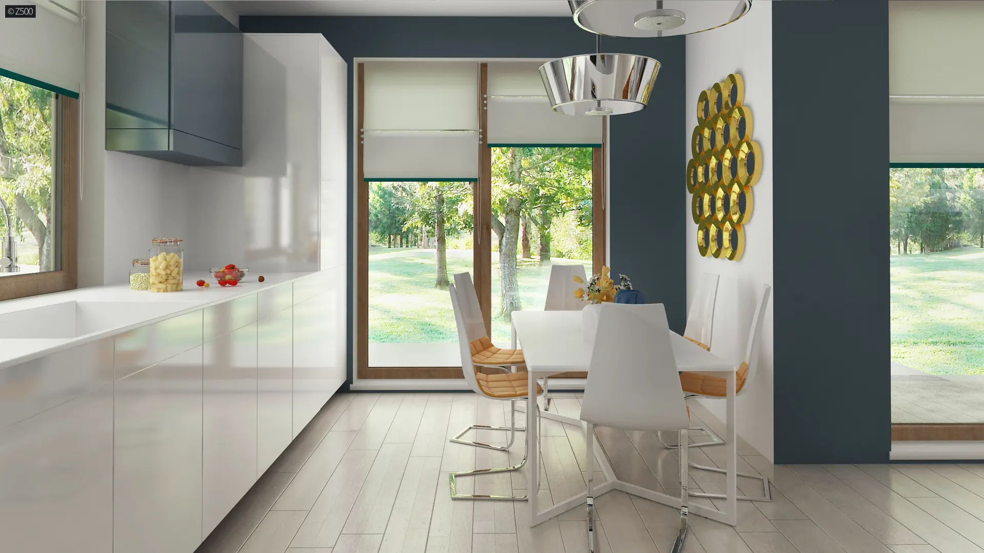 Projekt domu Z258 to propozycja dla inwestorów szukających projektu oryginalnego, ale jednocześnie nawiązującego do tradycji. Pozbawiony okapów dwuspadowy dach i nieco podniesione w stosunku do niego ściany szczytowe eksponują prosty, geometryczny kształt bryły. Od frontu urozmaica ją drewniana pergola, będąca jednocześnie zadaszeniem podestu wejściowego, a z boku pergola płynnie przechodząca w zadaszenie kuchni i jadalni.