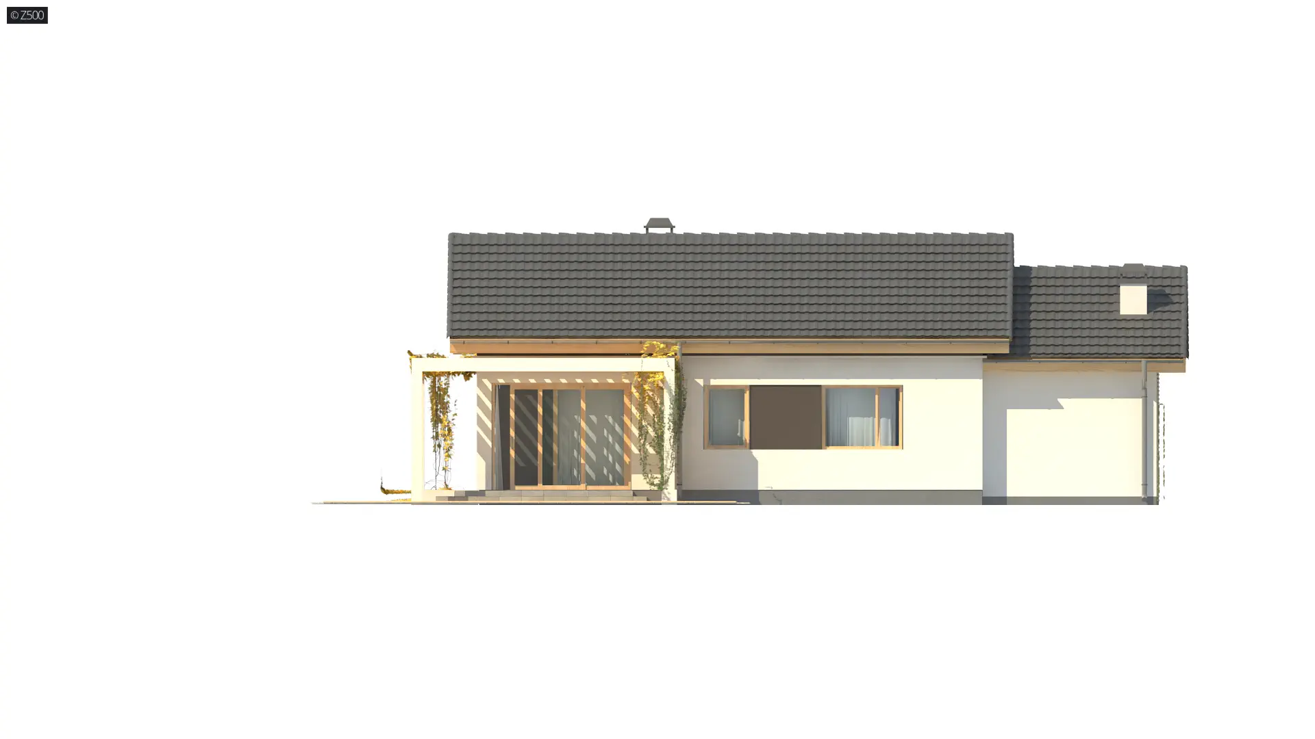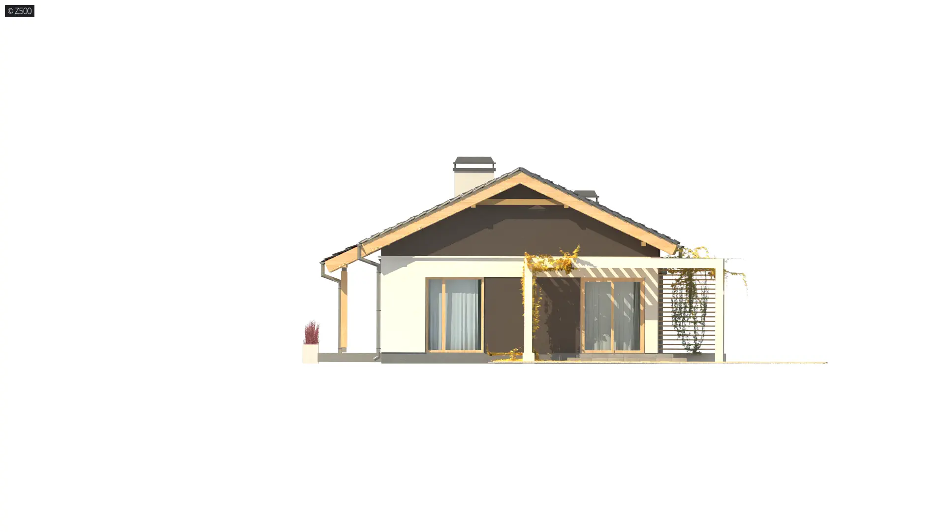Z259 to propozycja wspaniałego domu parterowego z dwuspadowym dachem i garażem jednostanowieskowym. Wspaniale wkomponuje się w każdą, nawet niewielką działkę. Jasne barwy ścian doskonale współgrają z drewnianymi elementami elewacji i brązową dachówką.